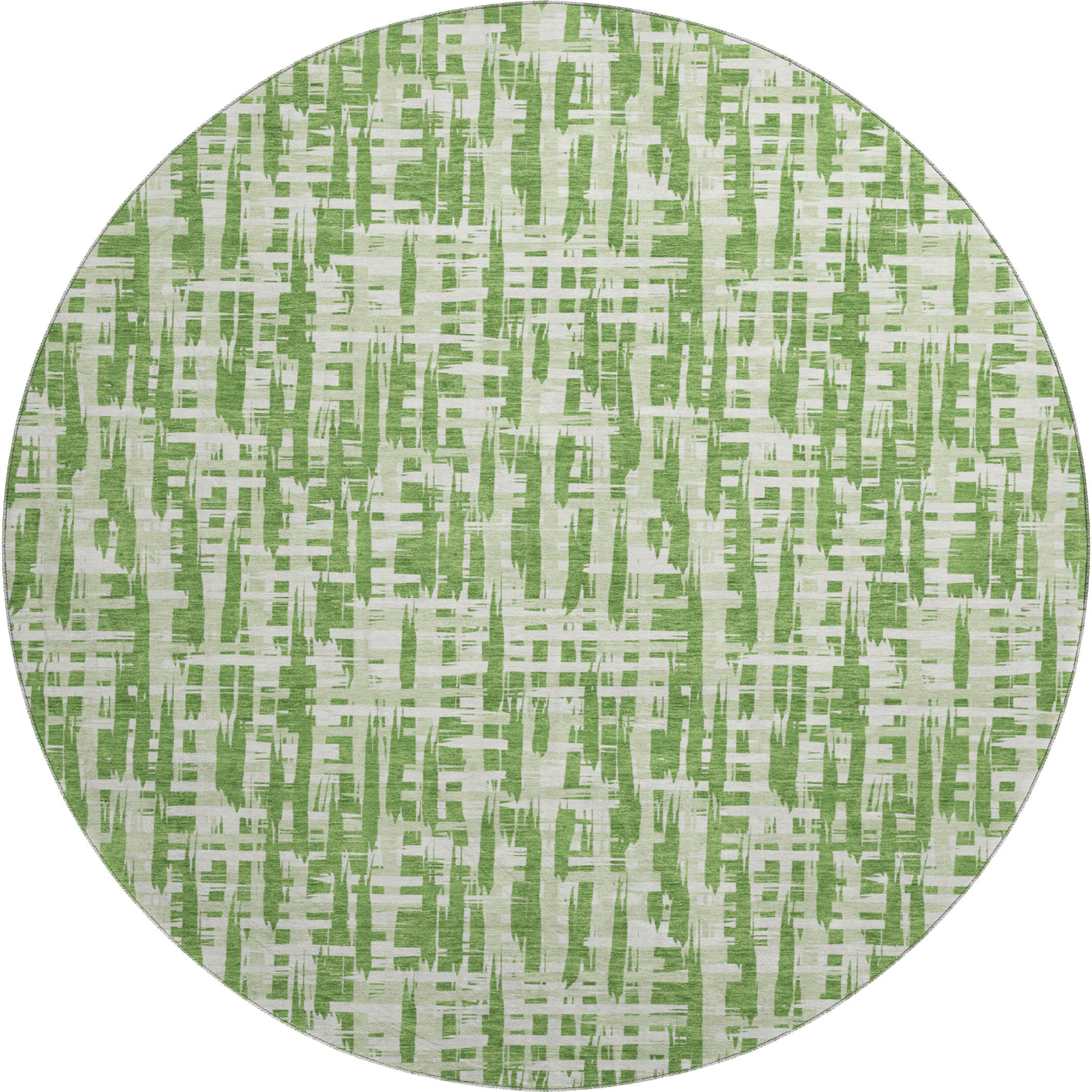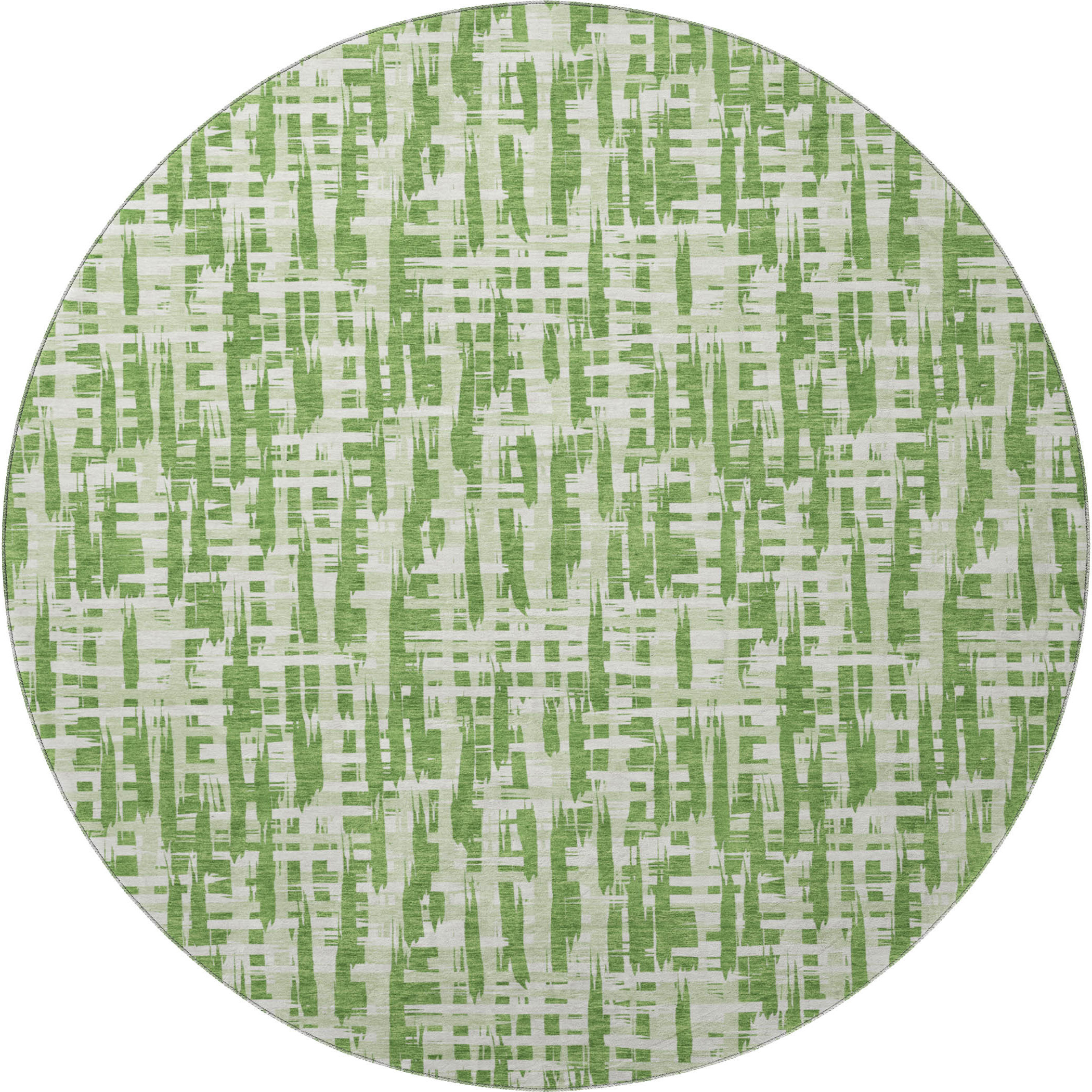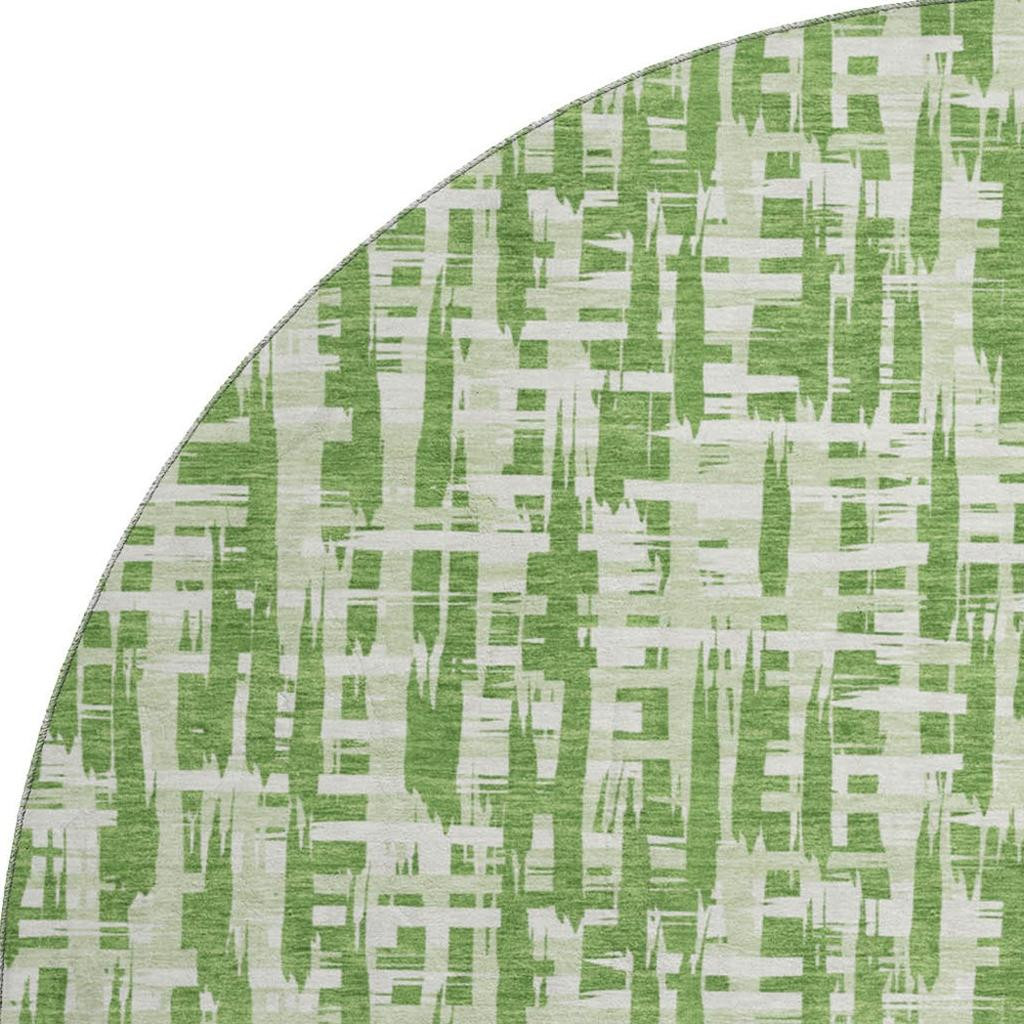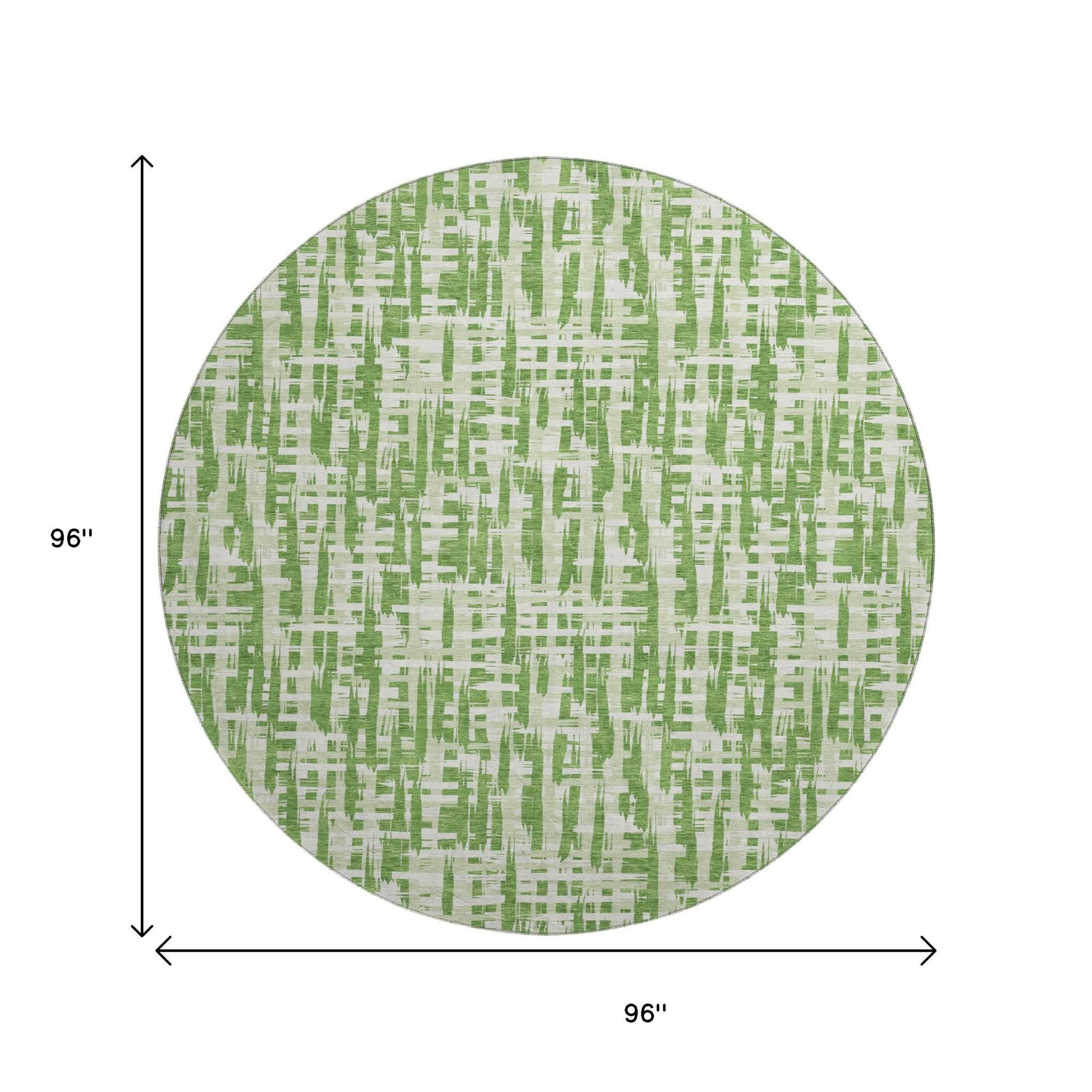 Add some artistry to your room with this 8-foot green artichoke green and ivory abstract geometric washable round rug with uv protection. Ideal for spaces with kids and pets, this rug is stain resistant to help repel dirt and spilled liquids. Built to last, this rug crafted from polyester fibers is known for its durability and long lasting appeal. Rugs are a great way to showcase your style, hide imperfections, warm your home and reduce noise. This larger sized, transitional styled rug is ready to create a focal point or statement piece in your room. 96.00-inch h x 96.00-inch w x 0.39-inch d.
