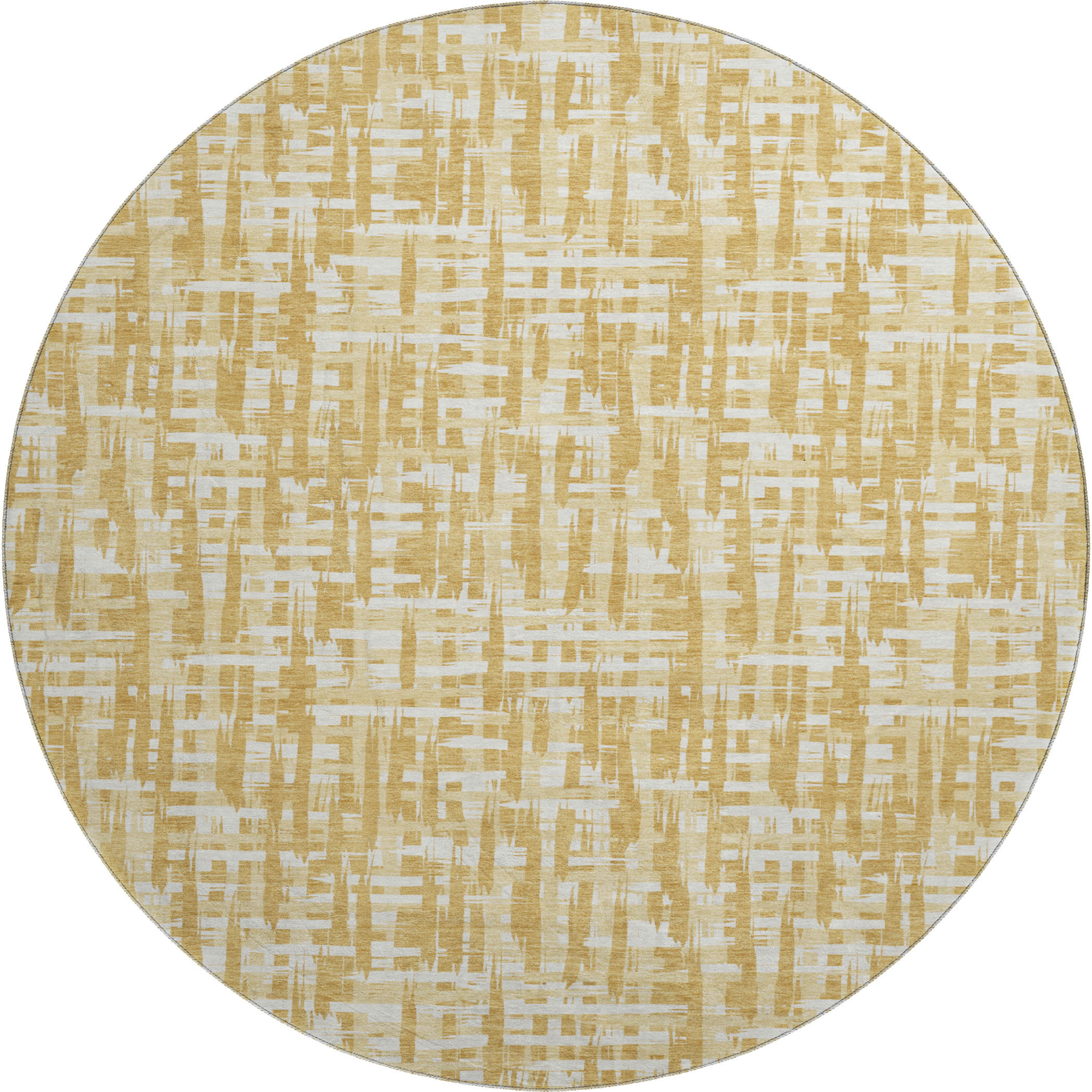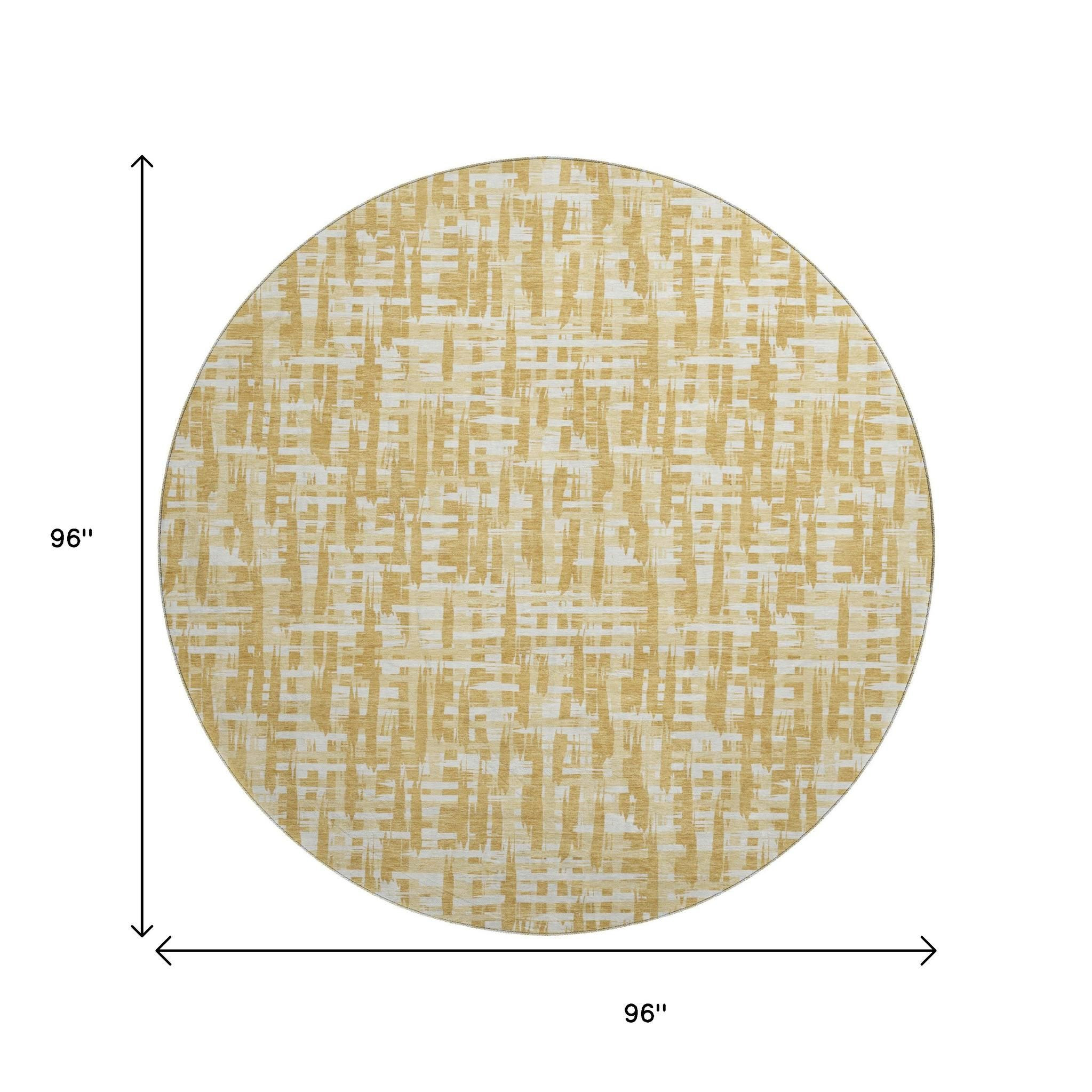 This 8-foot gold ivory and wheat abstract geometric washable round rug with uv protection, is a great way to add warmth to a room. Ideal for spaces with kids and pets, this rug is stain resistant to help repel dirt and spilled liquids. Built to last, this rug crafted from polyester fibers is known for its durability and long lasting appeal. Rugs are a great way to showcase your style, hide imperfections, warm your home and reduce noise. This larger sized, transitional styled rug is ready to create a focal point or statement piece in your room. 96.00-inch h x 96.00-inch w x 0.39-inch d.