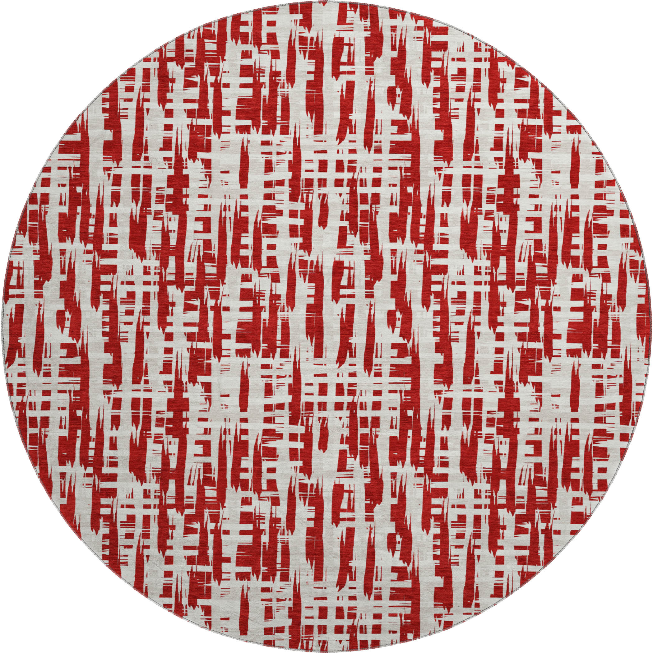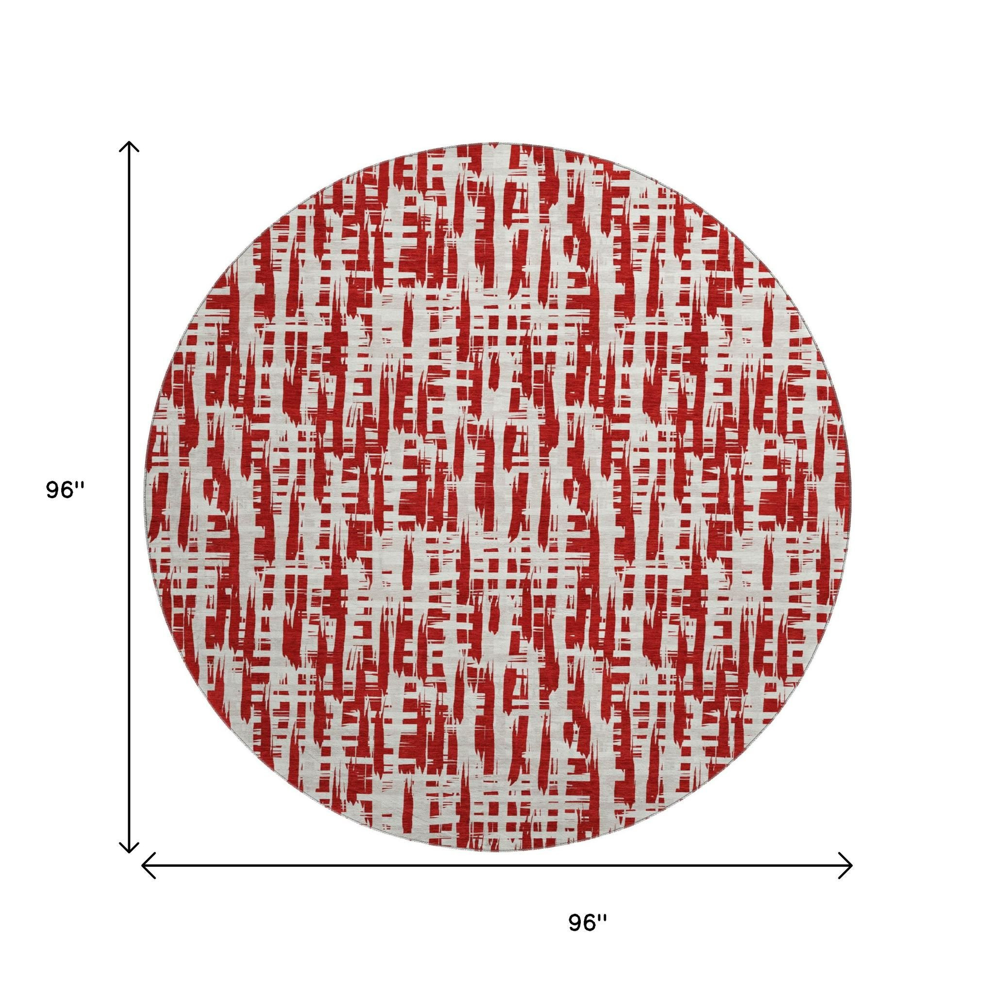 Set an inviting tone in your space with this 8-foot red beige and ivory abstract geometric washable round rug with uv protection. Ideal for spaces with kids and pets, this rug is stain resistant to help repel dirt and spilled liquids. Built to last, this rug crafted from polyester fibers is known for its durability and long lasting appeal. Rugs are a great way to showcase your style, hide imperfections, warm your home and reduce noise. This larger sized, transitional styled rug is ready to create a focal point or statement piece in your room. 96.00-inch h x 96.00-inch w x 0.39-inch d.