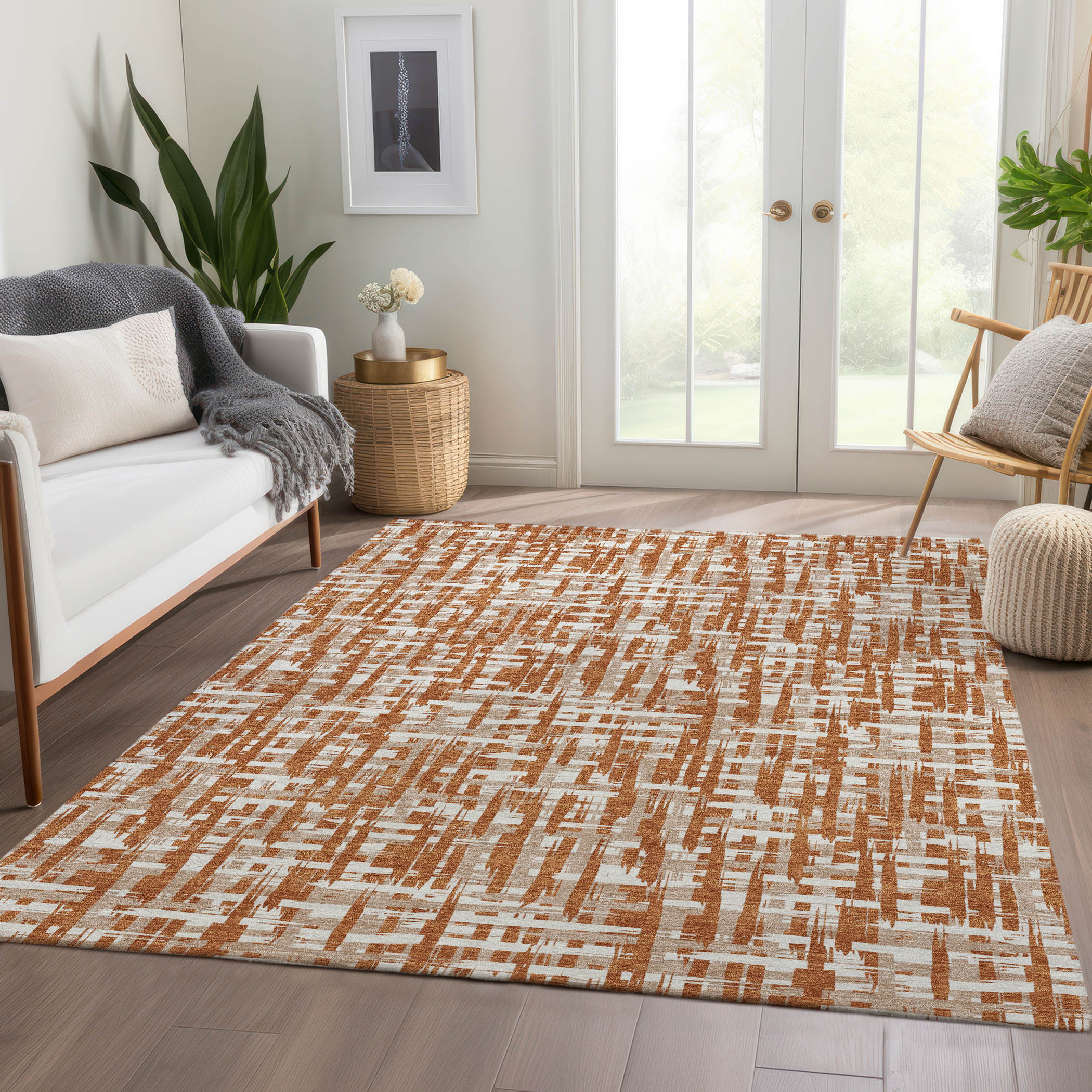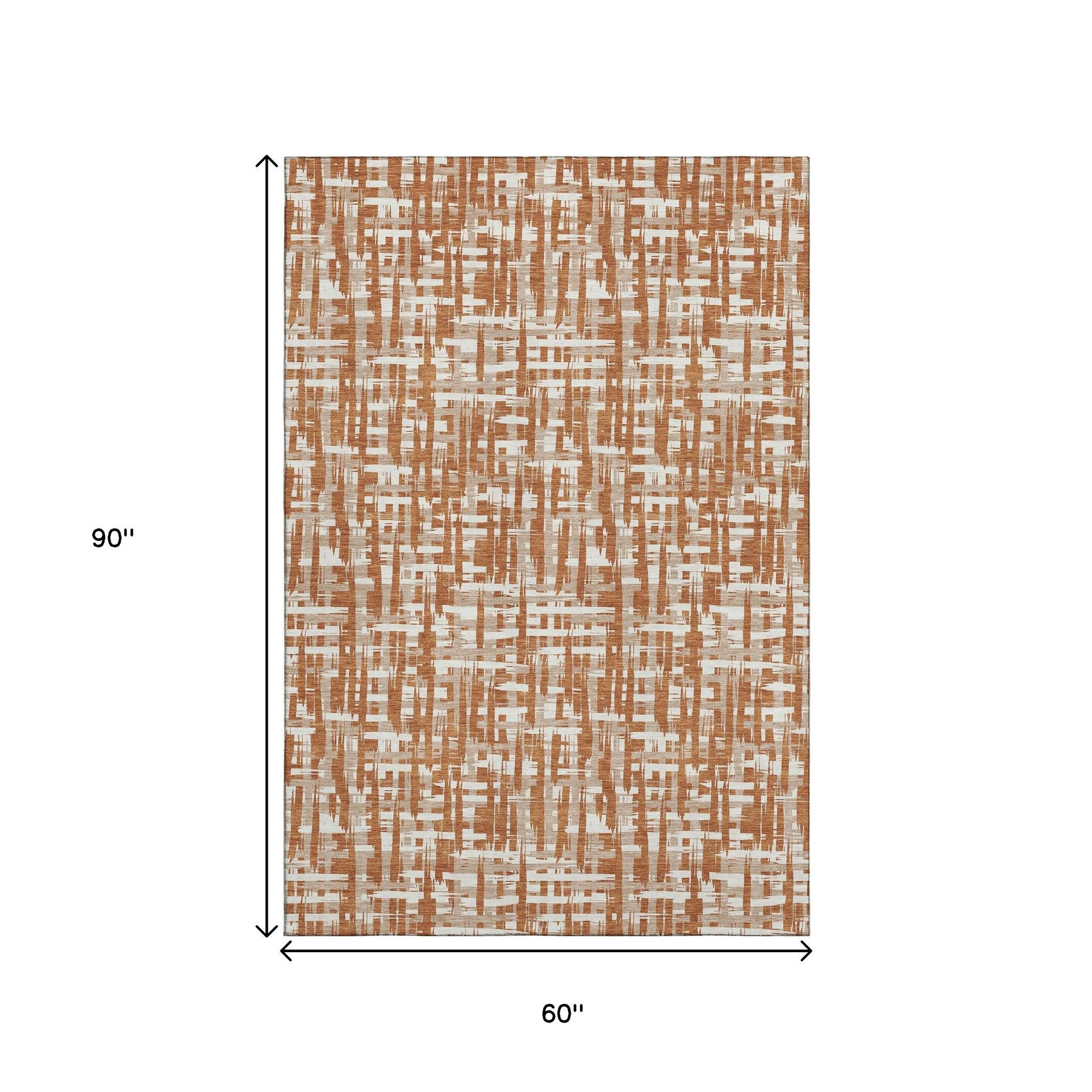 This 5-foot x 8-foot terra cotta ivory and beige abstract geometric washable area rug with uv protection, is a great way to add warmth to a room. Ideal for spaces with kids and pets, this rug is stain resistant to help repel dirt and spilled liquids. Built to last, this rug crafted from polyester fibers is known for its durability and long lasting appeal. Rugs are a great way to showcase your style, hide imperfections, warm your home and reduce noise. This larger sized, transitional styled rug is ready to create a focal point or statement piece in your room. 60.00-inch h x 90.00-inch w x 0.39-inch d.
