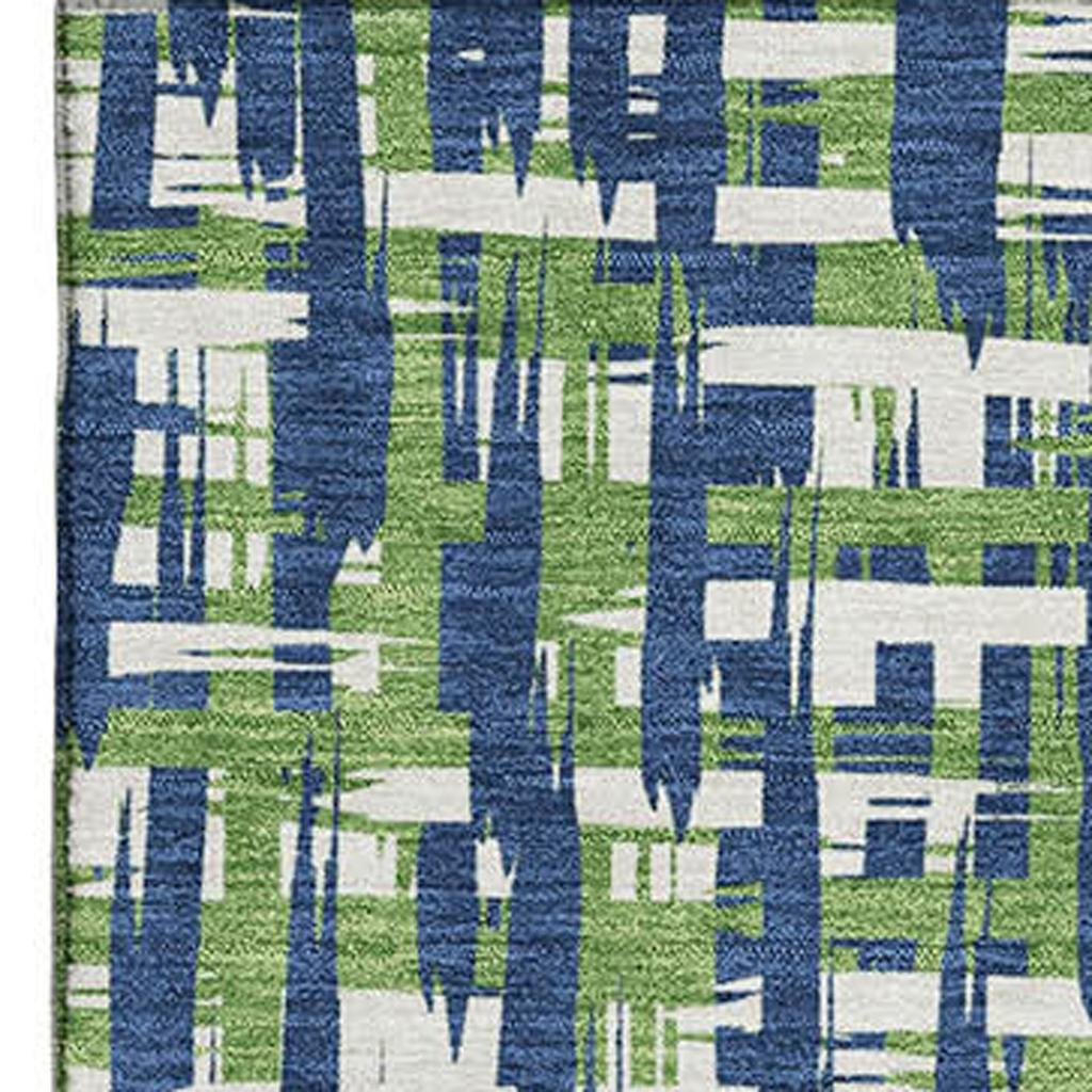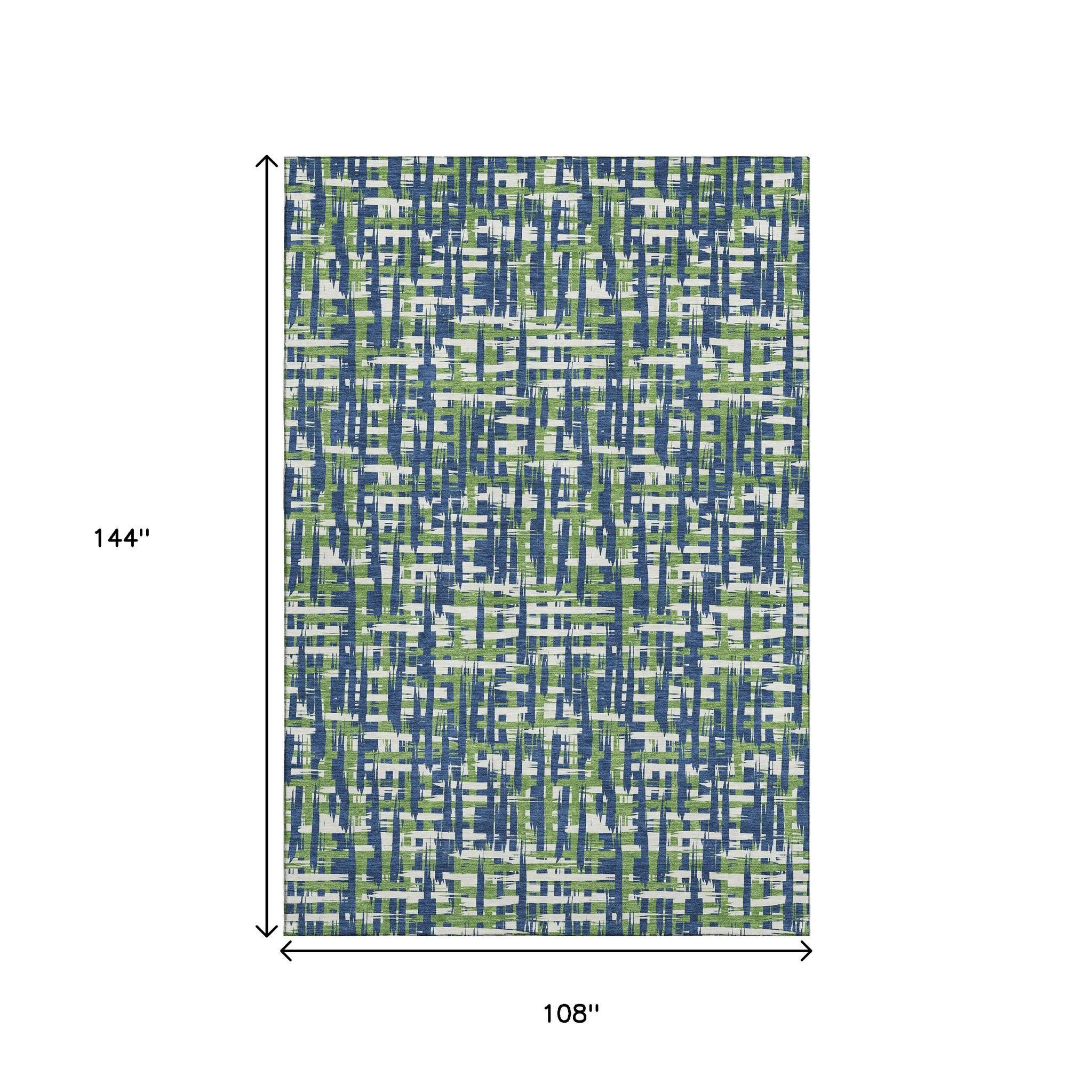 Add some artistry to your room with this 9-foot x 12-foot navy blue ivory and green abstract geometric washable area rug with uv protection. Ideal for spaces with kids and pets, this rug is stain resistant to help repel dirt and spilled liquids. Built to last, this rug crafted from polyester fibers is known for its durability and long lasting appeal. Rugs are a great way to showcase your style, hide imperfections, warm your home and reduce noise. This larger sized, transitional styled rug is ready to create a focal point or statement piece in your room. 108.00-inch h x 144.00-inch w x 0.39-inch d.