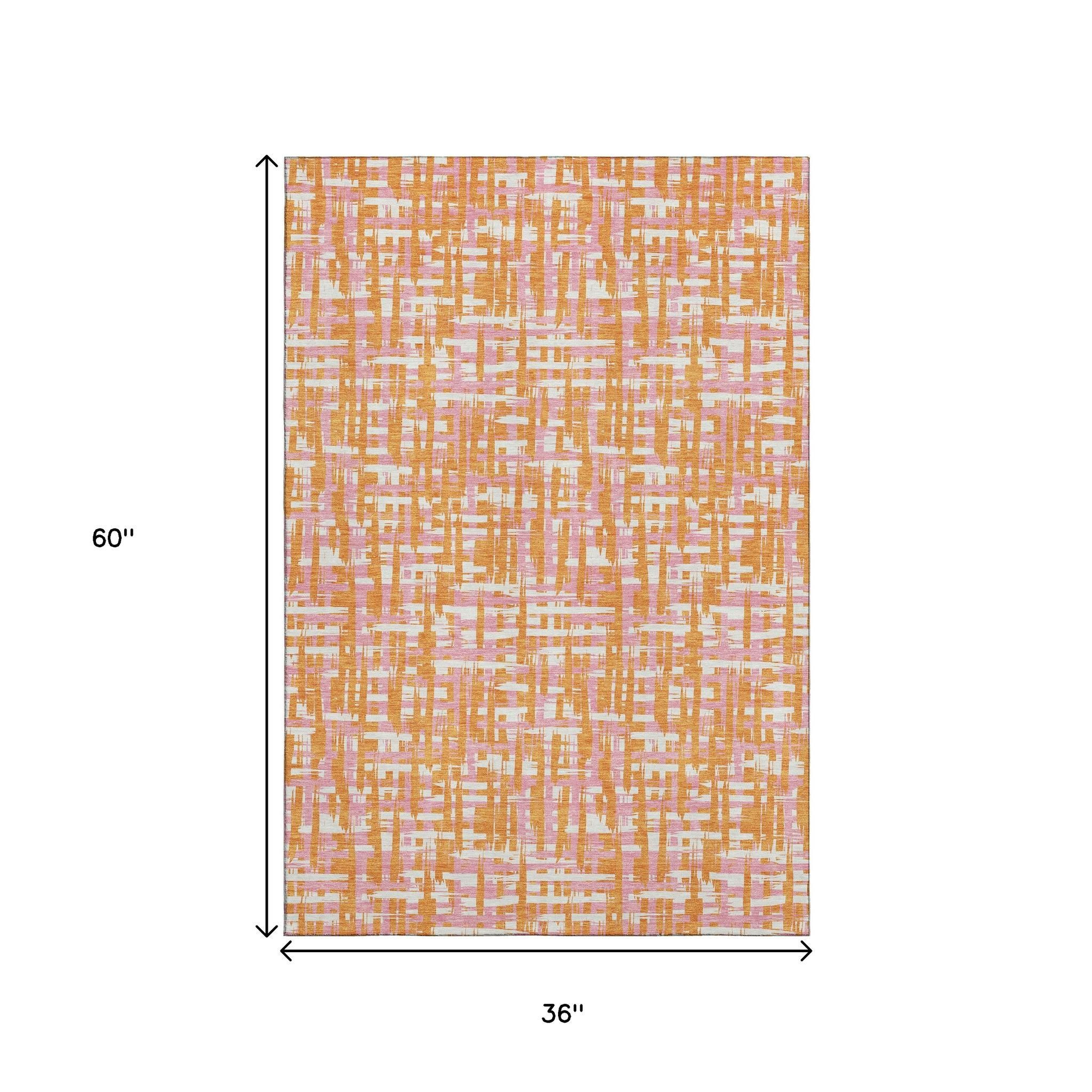 Add great coloration and comfortable texture to your space with this 3-foot x 5-foot orange ivory and pink abstract geometric washable area rug with uv protection. Ideal for spaces with kids and pets, this rug is stain resistant to help repel dirt and spilled liquids. Built to last, this rug crafted from polyester fibers is known for its durability and long lasting appeal. Rugs are a great way to showcase your style, hide imperfections, warm your home and reduce noise. This smaller sized, transitional styled rug is just what you need for your walkway, bedside, in front of door, cabinet, refrigerator, or chair. 36.00-inch h x 60.00-inch w x 0.39-inch d.