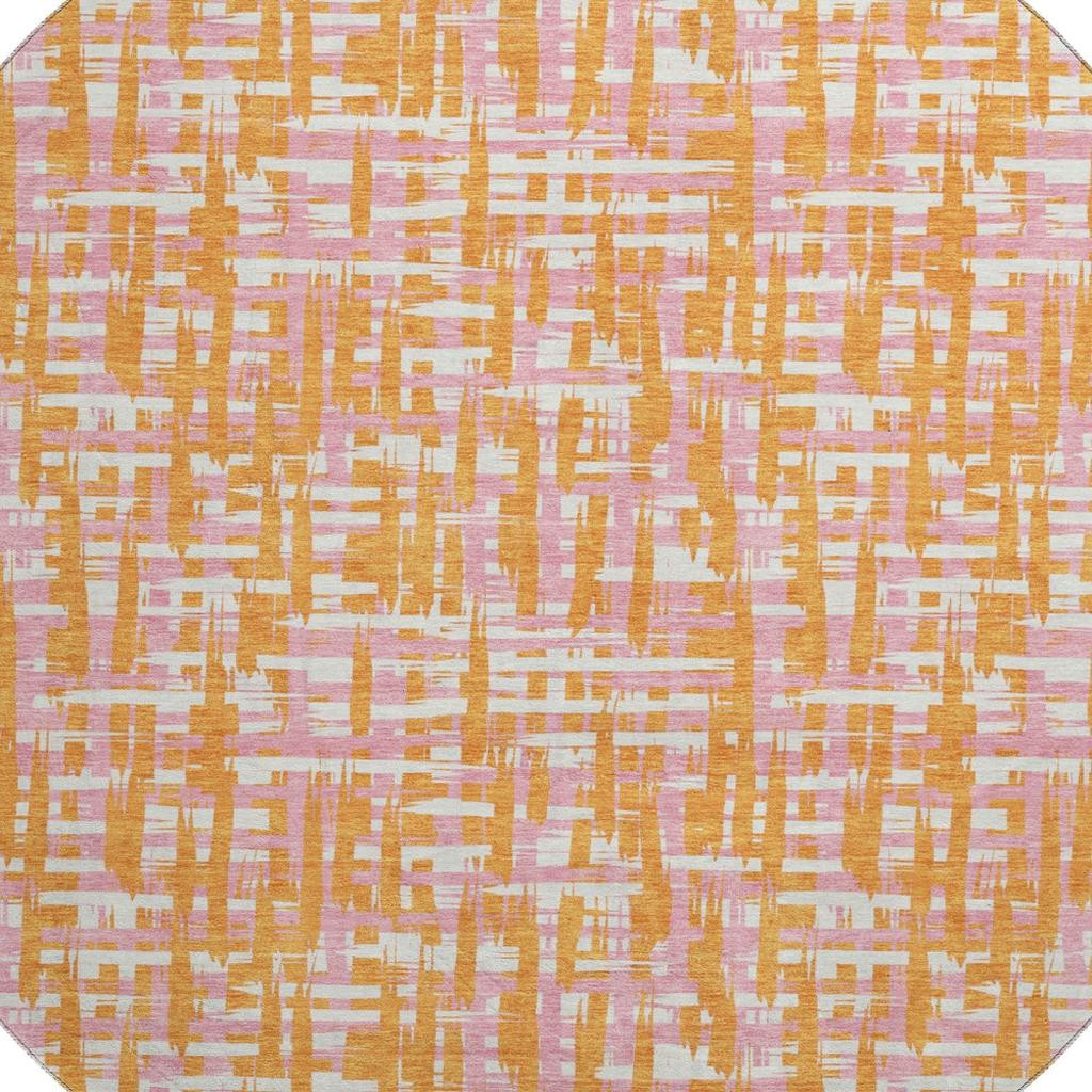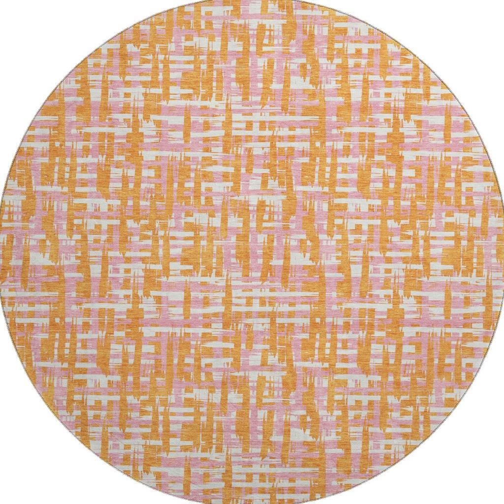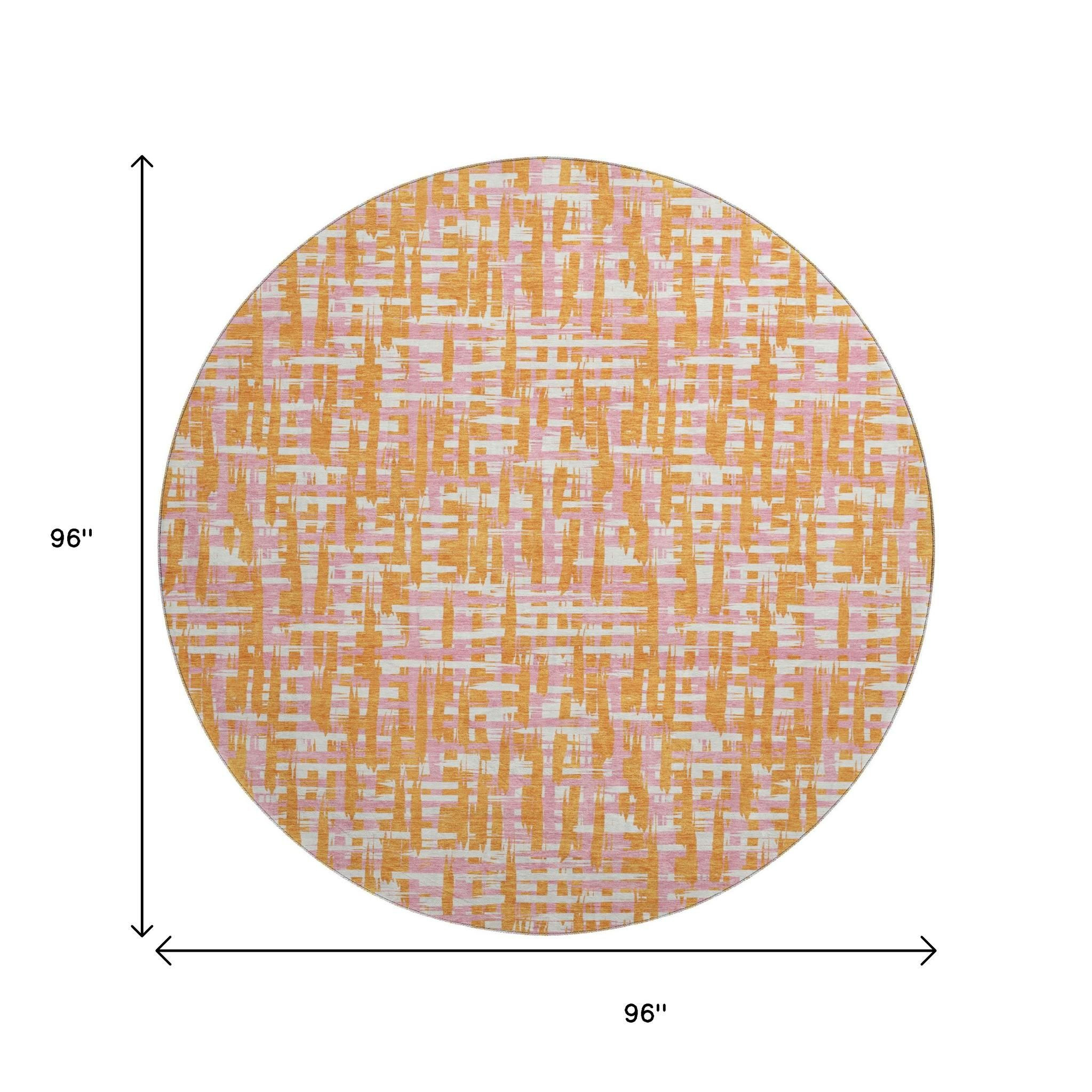 This 8-foot orange ivory and pink abstract geometric washable round rug with uv protection, is a great way to add warmth to a room. Ideal for spaces with kids and pets, this rug is stain resistant to help repel dirt and spilled liquids. Built to last, this rug crafted from polyester fibers is known for its durability and long lasting appeal. Rugs are a great way to showcase your style, hide imperfections, warm your home and reduce noise. This larger sized, transitional styled rug is ready to create a focal point or statement piece in your room. 96.00-inch h x 96.00-inch w x 0.39-inch d.