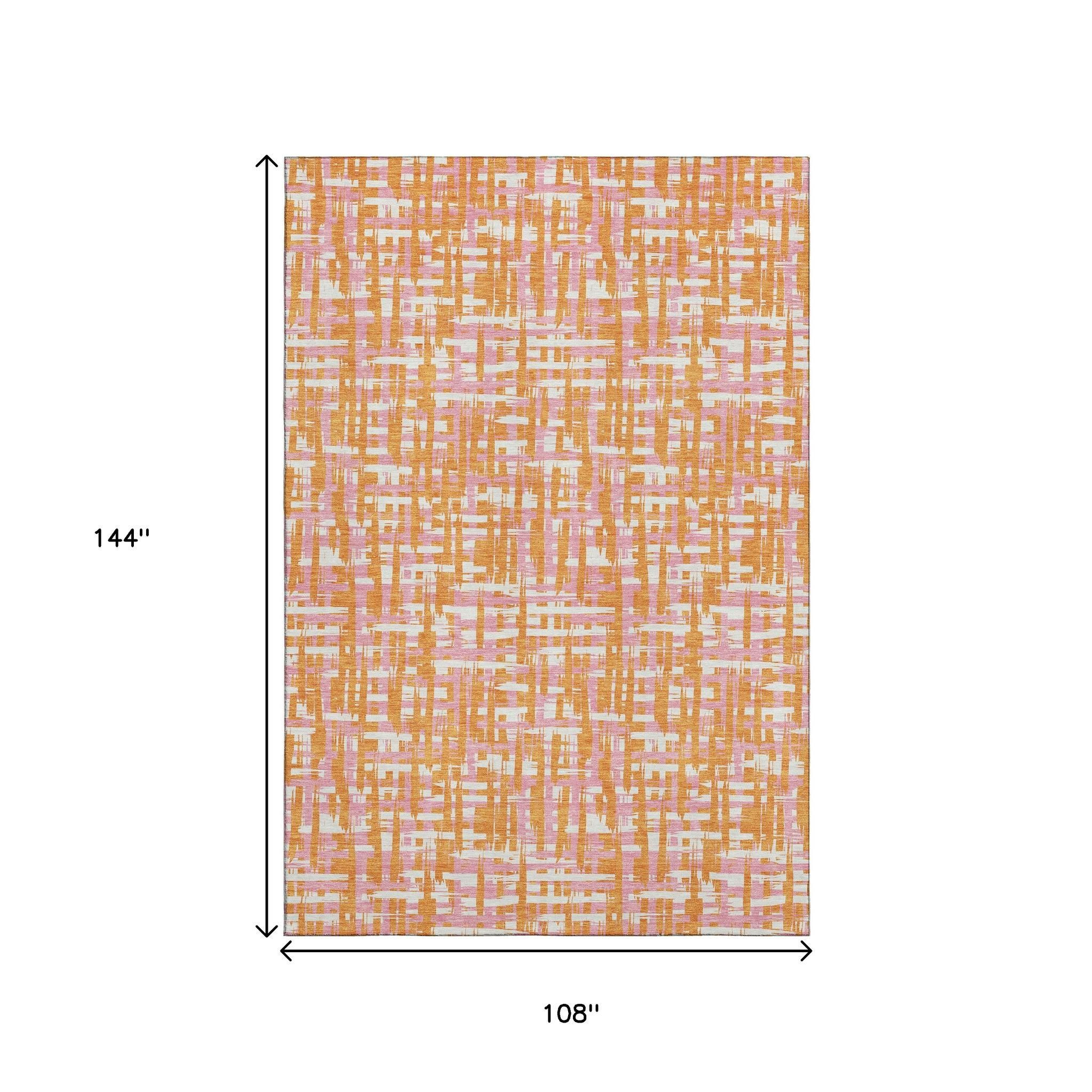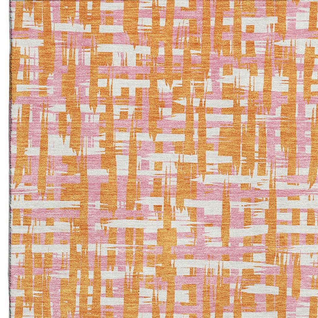 Add some artistry to your room with this 9-foot x 12-foot orange ivory and pink abstract geometric washable area rug with uv protection. Ideal for spaces with kids and pets, this rug is stain resistant to help repel dirt and spilled liquids. Built to last, this rug crafted from polyester fibers is known for its durability and long lasting appeal. Rugs are a great way to showcase your style, hide imperfections, warm your home and reduce noise. This larger sized, transitional styled rug is ready to create a focal point or statement piece in your room. 108.00-inch h x 144.00-inch w x 0.39-inch d.