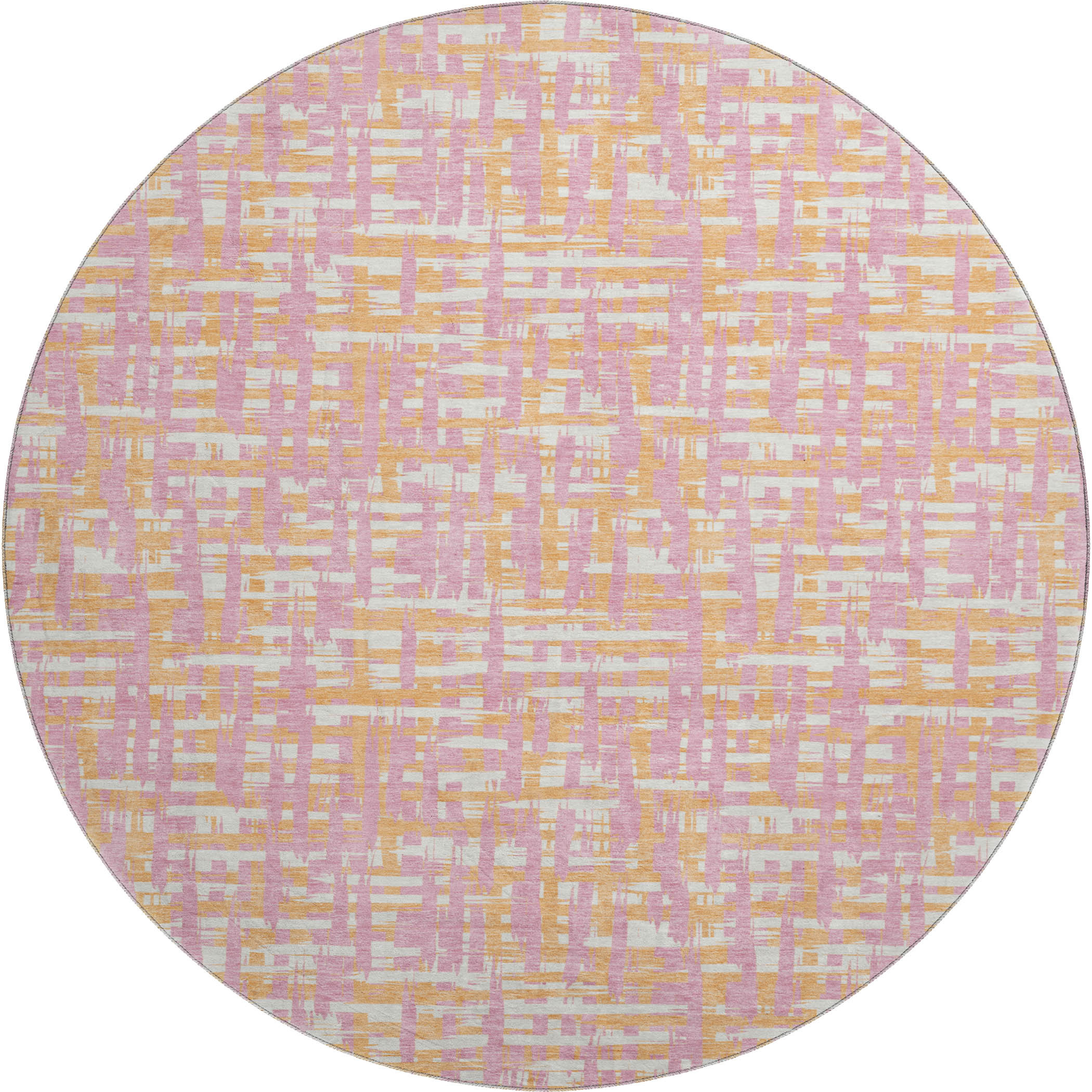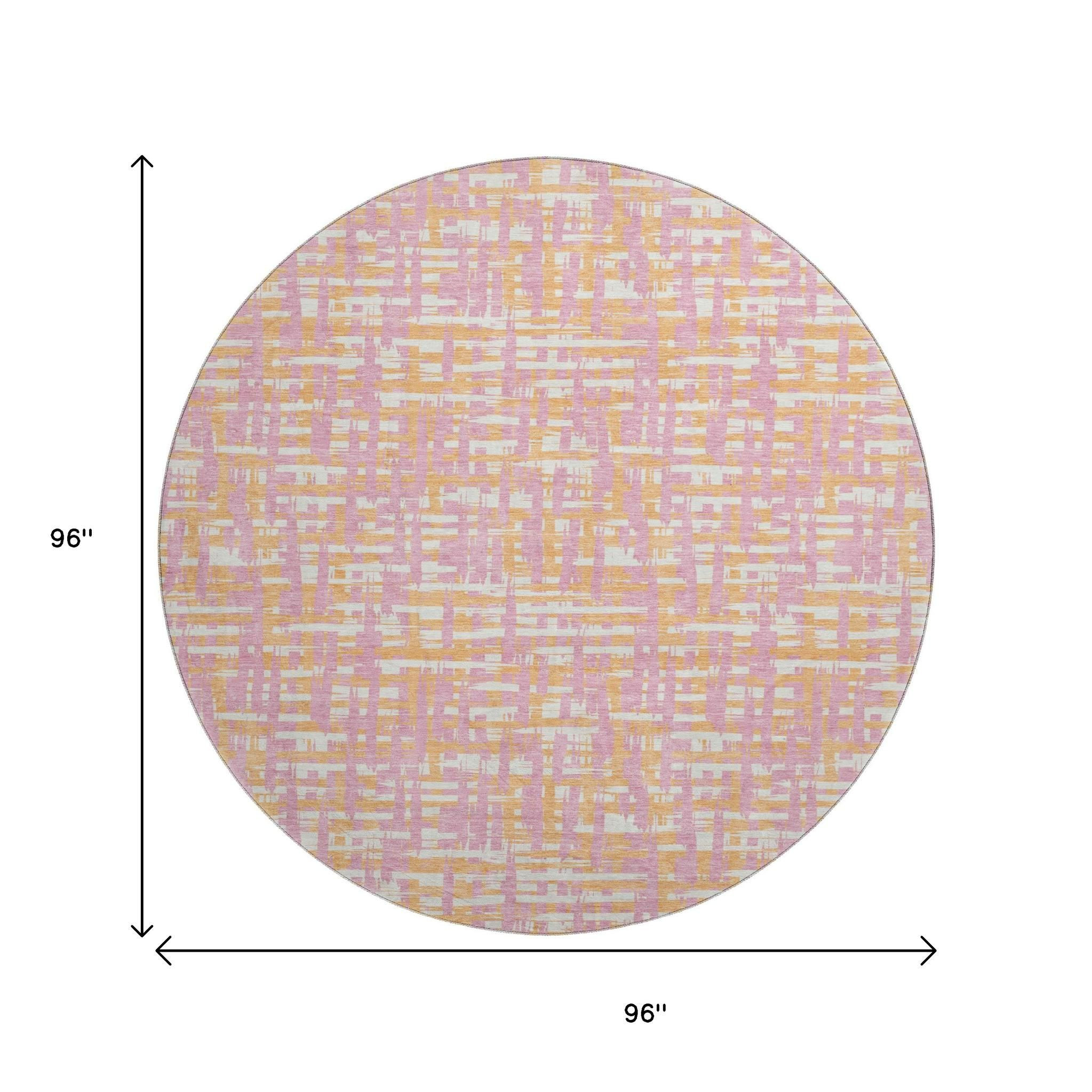 Add great coloration and comfortable texture to your space with this 8-foot pink ivory and orange abstract geometric washable round rug with uv protection. Ideal for spaces with kids and pets, this rug is stain resistant to help repel dirt and spilled liquids. Built to last, this rug crafted from polyester fibers is known for its durability and long lasting appeal. Rugs are a great way to showcase your style, hide imperfections, warm your home and reduce noise. This larger sized, transitional styled rug is ready to create a focal point or statement piece in your room. 96.00-inch h x 96.00-inch w x 0.39-inch d.