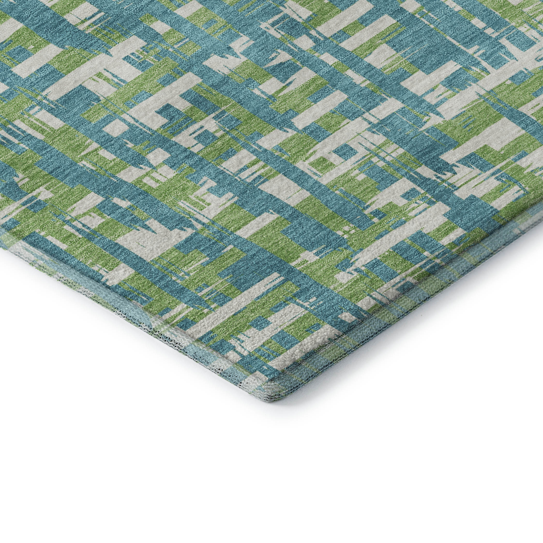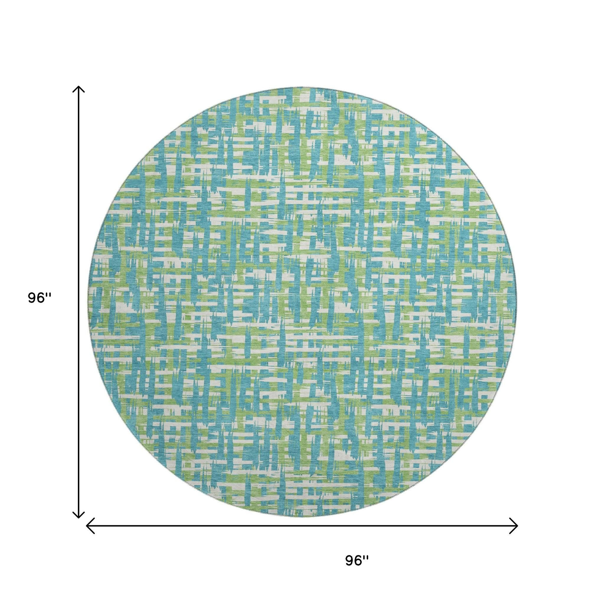 Set an inviting tone in your space with this 8-foot turquoise green and ivory abstract geometric washable round rug with uv protection. Ideal for spaces with kids and pets, this rug is stain resistant to help repel dirt and spilled liquids. Built to last, this rug crafted from polyester fibers is known for its durability and long lasting appeal. Rugs are a great way to showcase your style, hide imperfections, warm your home and reduce noise. This larger sized, transitional styled rug is ready to create a focal point or statement piece in your room. 96.00-inch h x 96.00-inch w x 0.39-inch d.