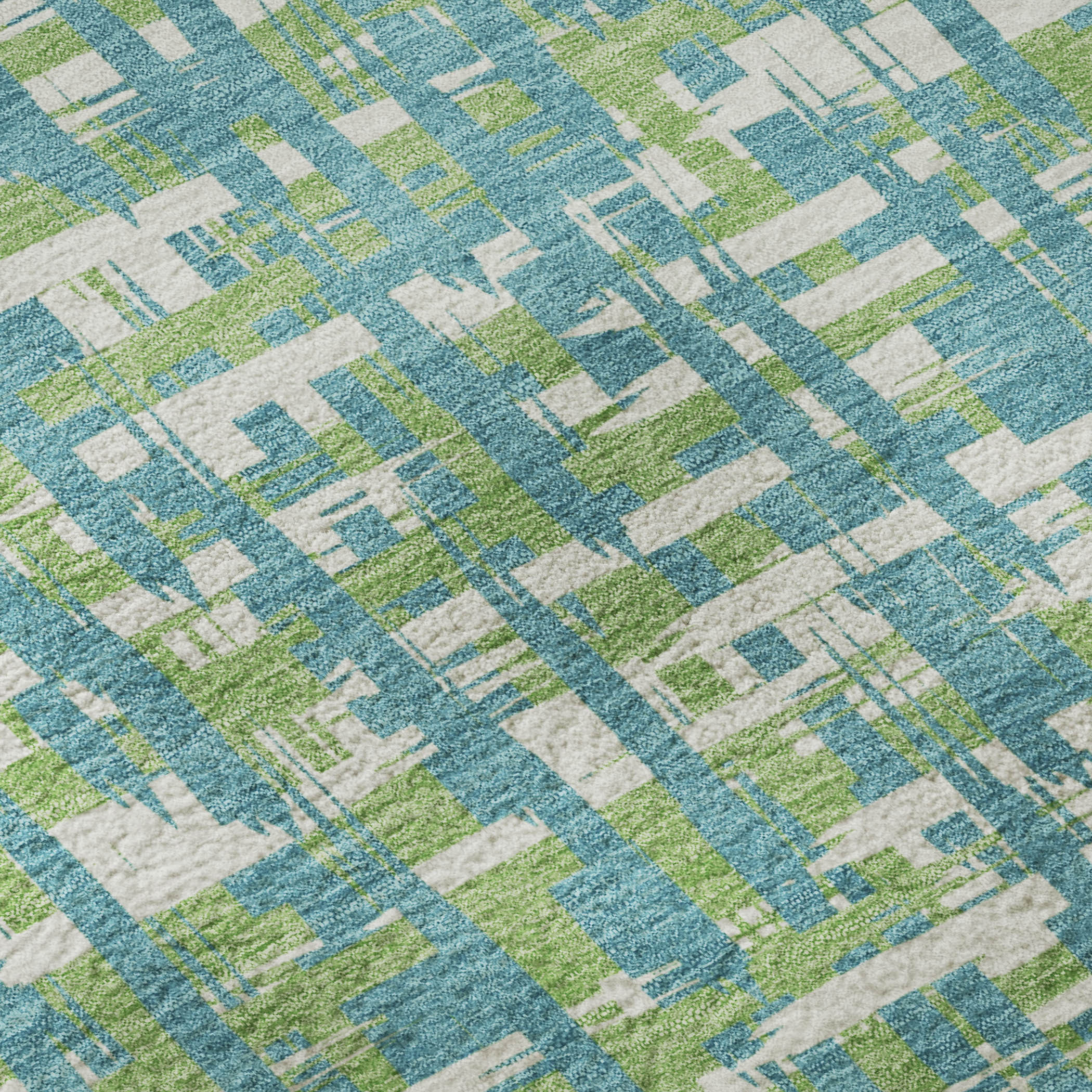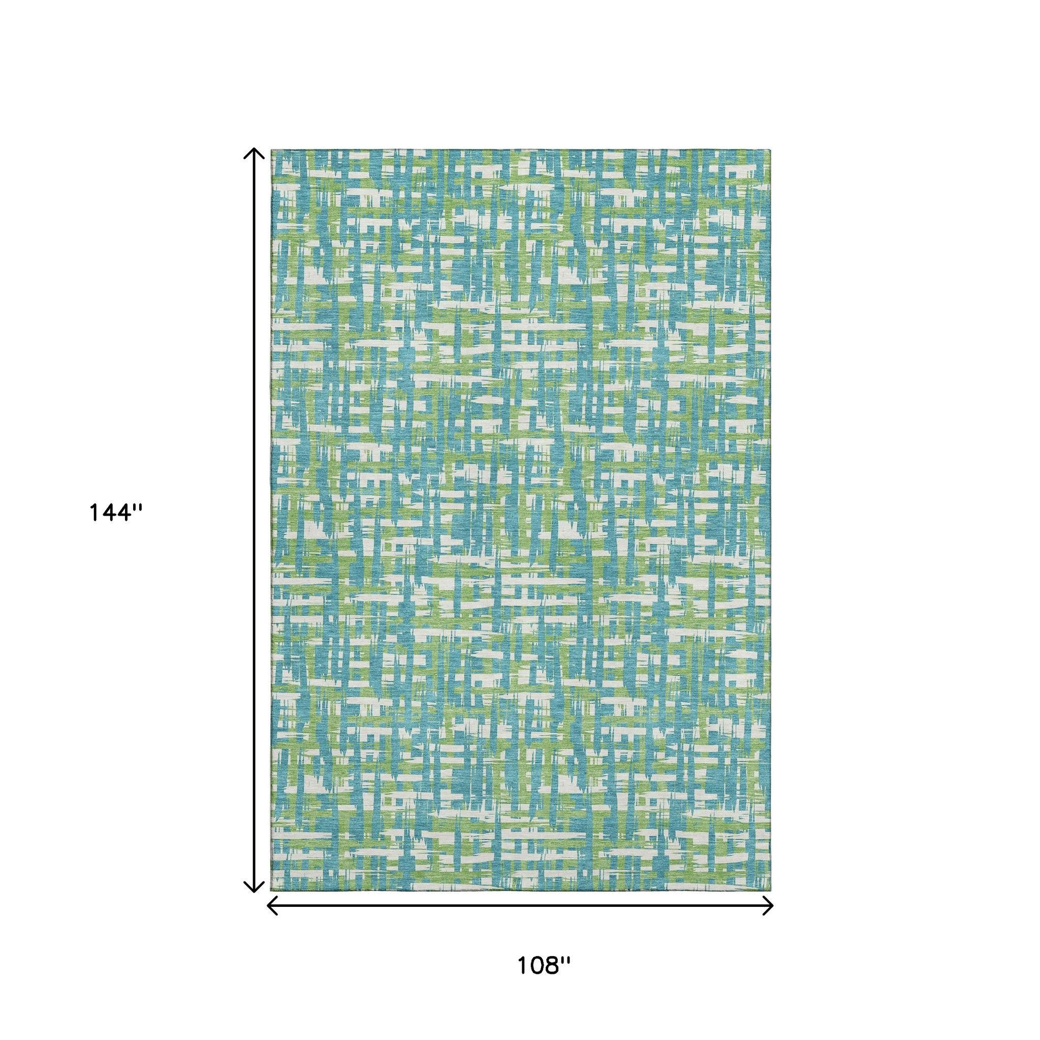 This 9-foot x 12-foot turquoise green and ivory abstract geometric washable area rug with uv protection, is a great way to add warmth to a room. Ideal for spaces with kids and pets, this rug is stain resistant to help repel dirt and spilled liquids. Built to last, this rug crafted from polyester fibers is known for its durability and long lasting appeal. Rugs are a great way to showcase your style, hide imperfections, warm your home and reduce noise. This larger sized, transitional styled rug is ready to create a focal point or statement piece in your room. 108.00-inch h x 144.00-inch w x 0.39-inch d.