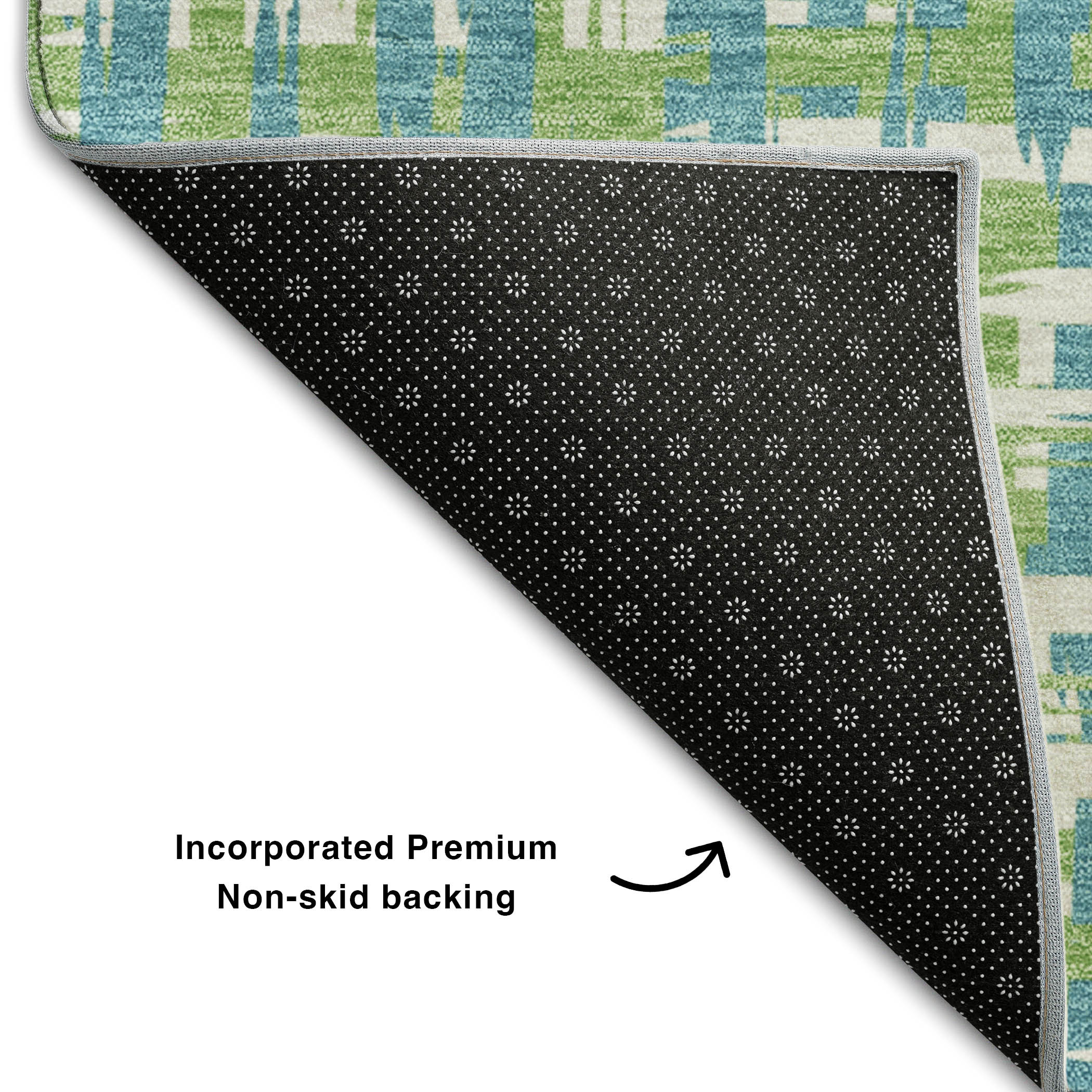 Set an inviting tone in your space with this 10-foot x 14-foot turquoise green and ivory abstract geometric washable area rug with uv protection. Ideal for spaces with kids and pets, this rug is stain resistant to help repel dirt and spilled liquids. Built to last, this rug crafted from polyester fibers is known for its durability and long lasting appeal. Rugs are a great way to showcase your style, hide imperfections, warm your home and reduce noise. This larger sized, transitional styled rug is ready to create a focal point or statement piece in your room. 120.00-inch h x 168.00-inch w x 0.39-inch d.