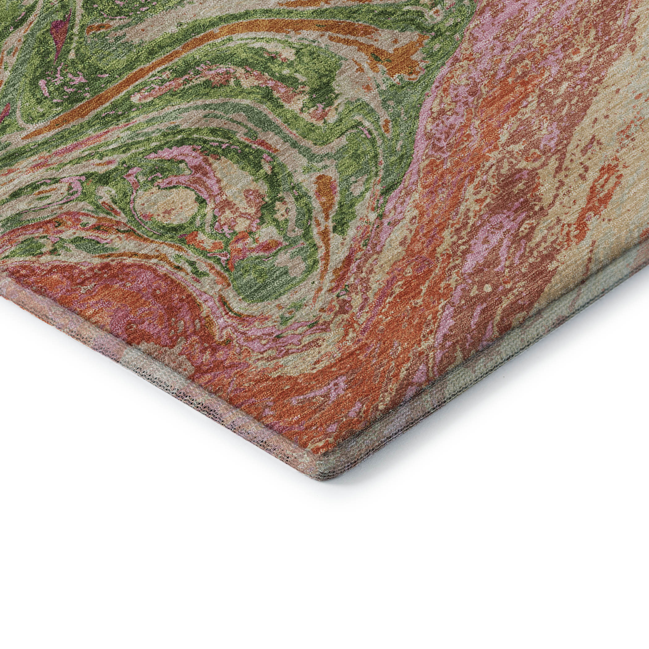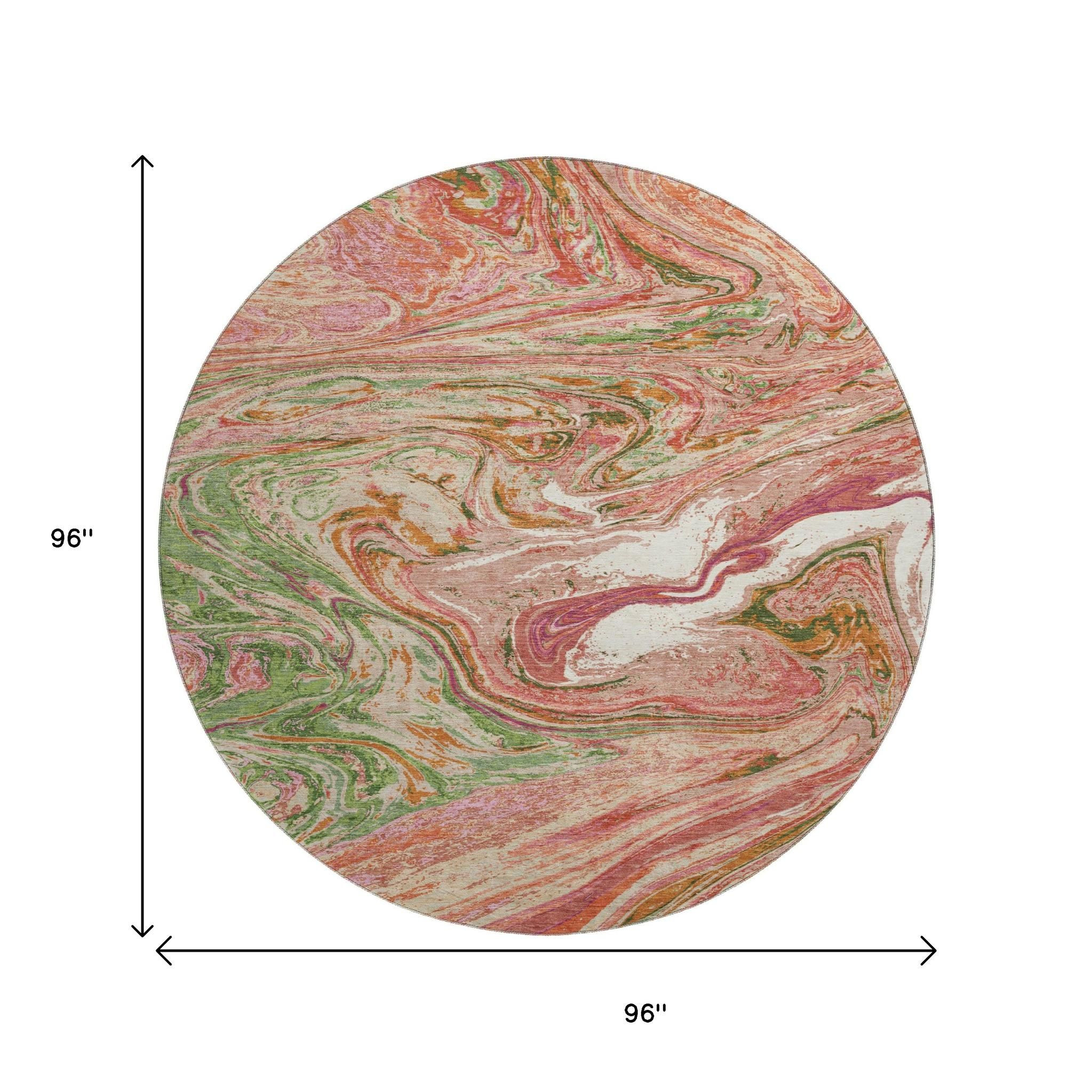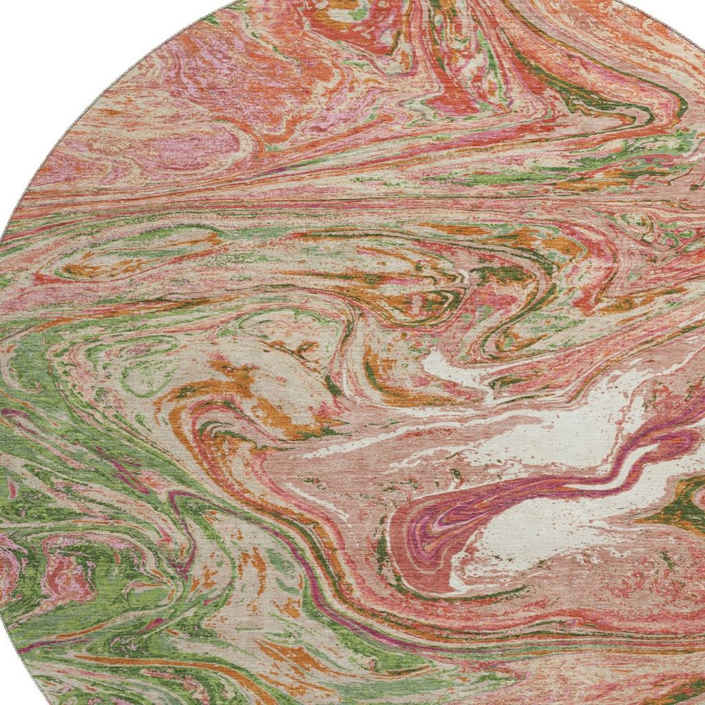 Add great coloration and comfortable texture to your space with this 8-foot coral green and peach abstract washable round rug with uv protection. Ideal for spaces with kids and pets, this rug is stain resistant to help repel dirt and spilled liquids. Built to last, this rug crafted from polyester fibers is known for its durability and long lasting appeal. Rugs are a great way to showcase your style, hide imperfections, warm your home and reduce noise. This larger sized, transitional styled rug is ready to create a focal point or statement piece in your room. 96.00-inch h x 96.00-inch w x 0.39-inch d.