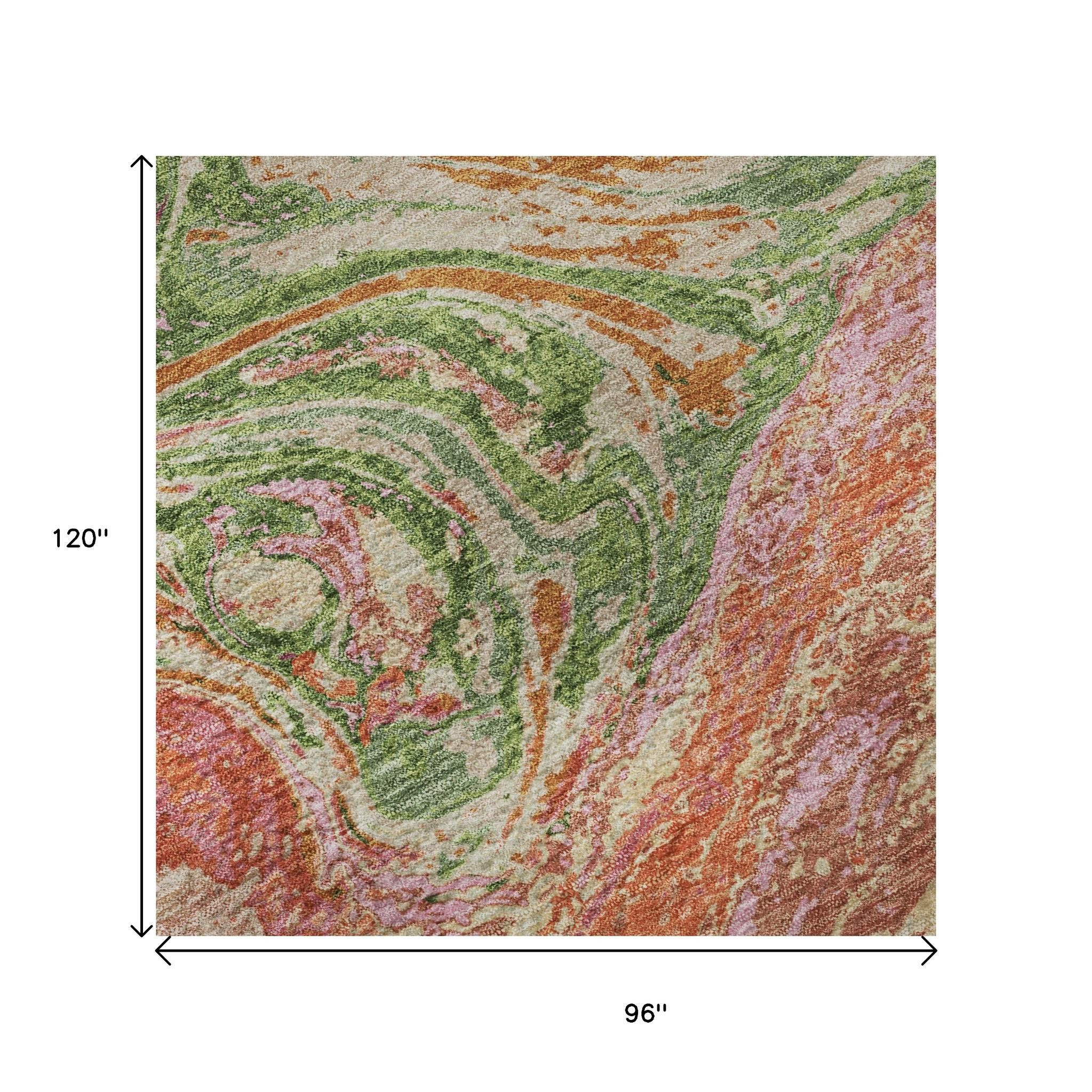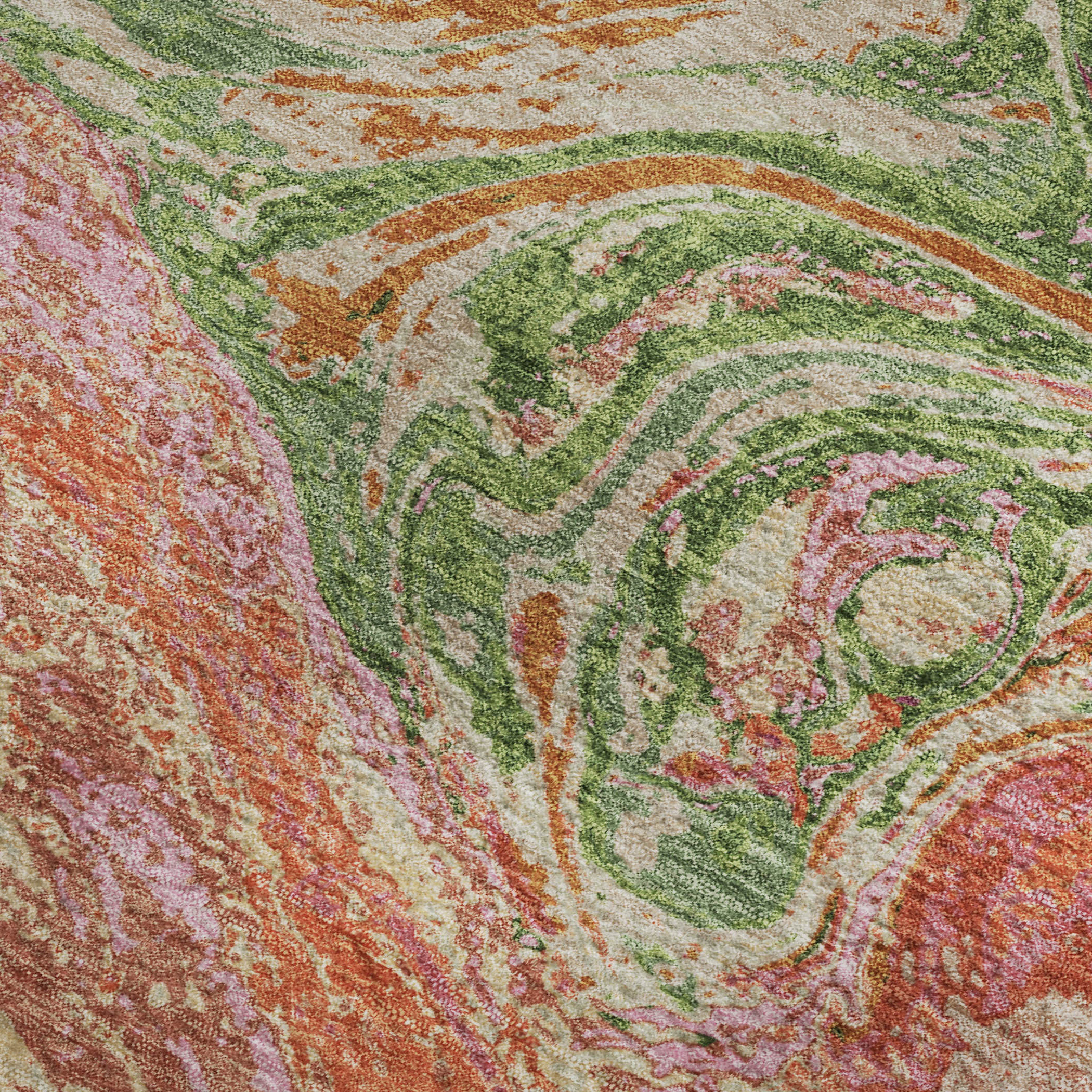 This 8-foot x 10-foot coral green and peach abstract washable area rug with uv protection, is a great way to add warmth to a room. Ideal for spaces with kids and pets, this rug is stain resistant to help repel dirt and spilled liquids. Built to last, this rug crafted from polyester fibers is known for its durability and long lasting appeal. Rugs are a great way to showcase your style, hide imperfections, warm your home and reduce noise. This larger sized, transitional styled rug is ready to create a focal point or statement piece in your room. 96.00-inch h x 120.00-inch w x 0.39-inch d.