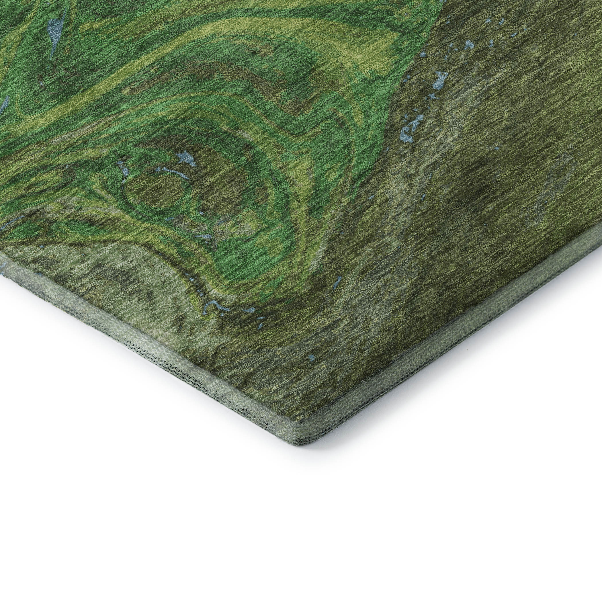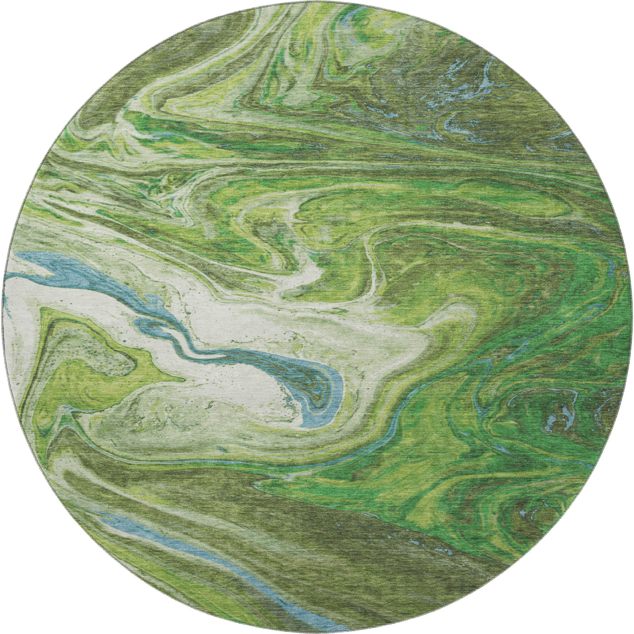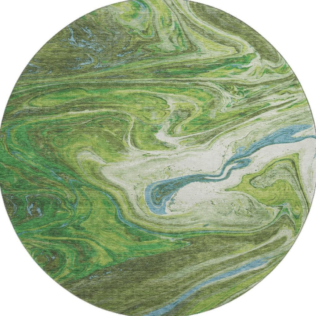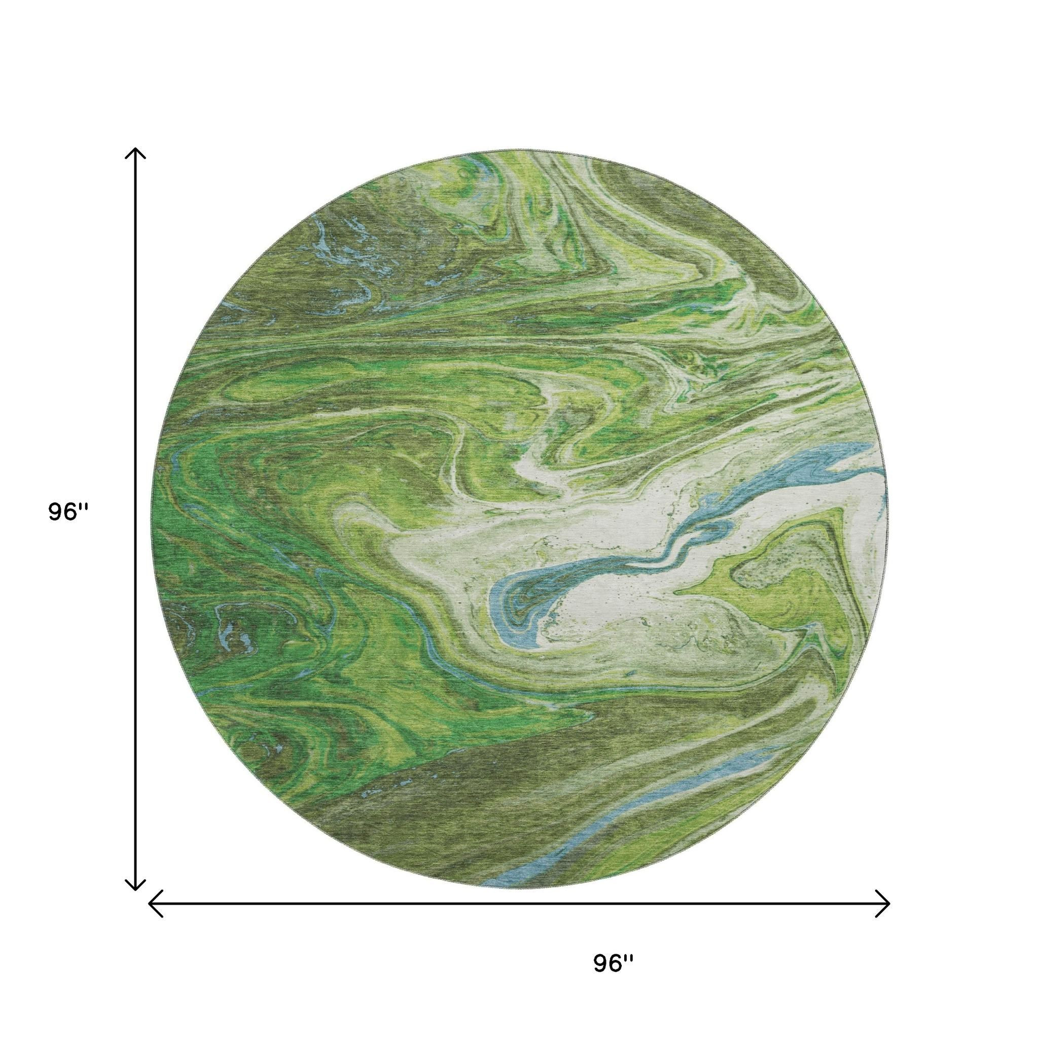 Add some artistry to your room with this 8-foot green blue and ivory abstract washable round rug with uv protection. Ideal for spaces with kids and pets, this rug is stain resistant to help repel dirt and spilled liquids. Built to last, this rug crafted from polyester fibers is known for its durability and long lasting appeal. Rugs are a great way to showcase your style, hide imperfections, warm your home and reduce noise. This larger sized, transitional styled rug is ready to create a focal point or statement piece in your room. 96.00-inch h x 96.00-inch w x 0.39-inch d.