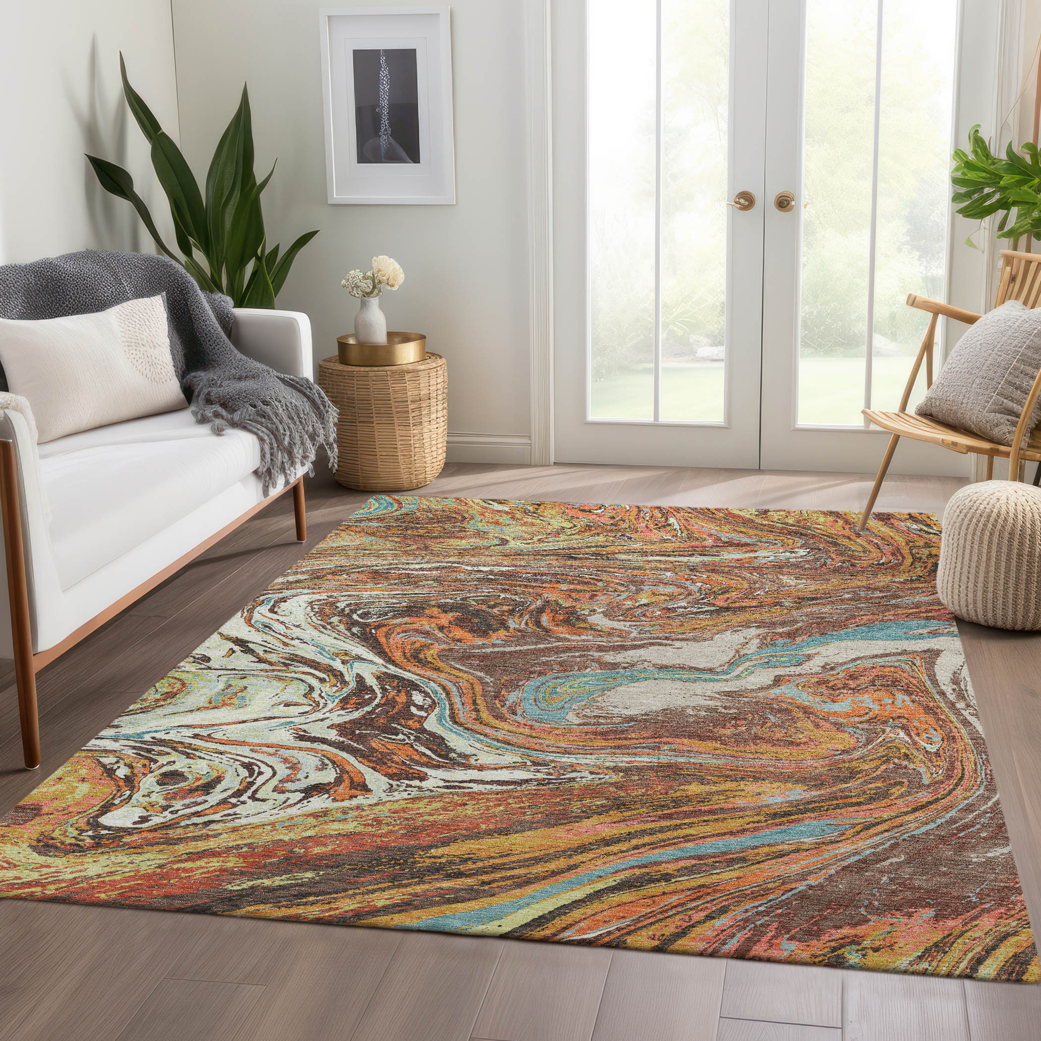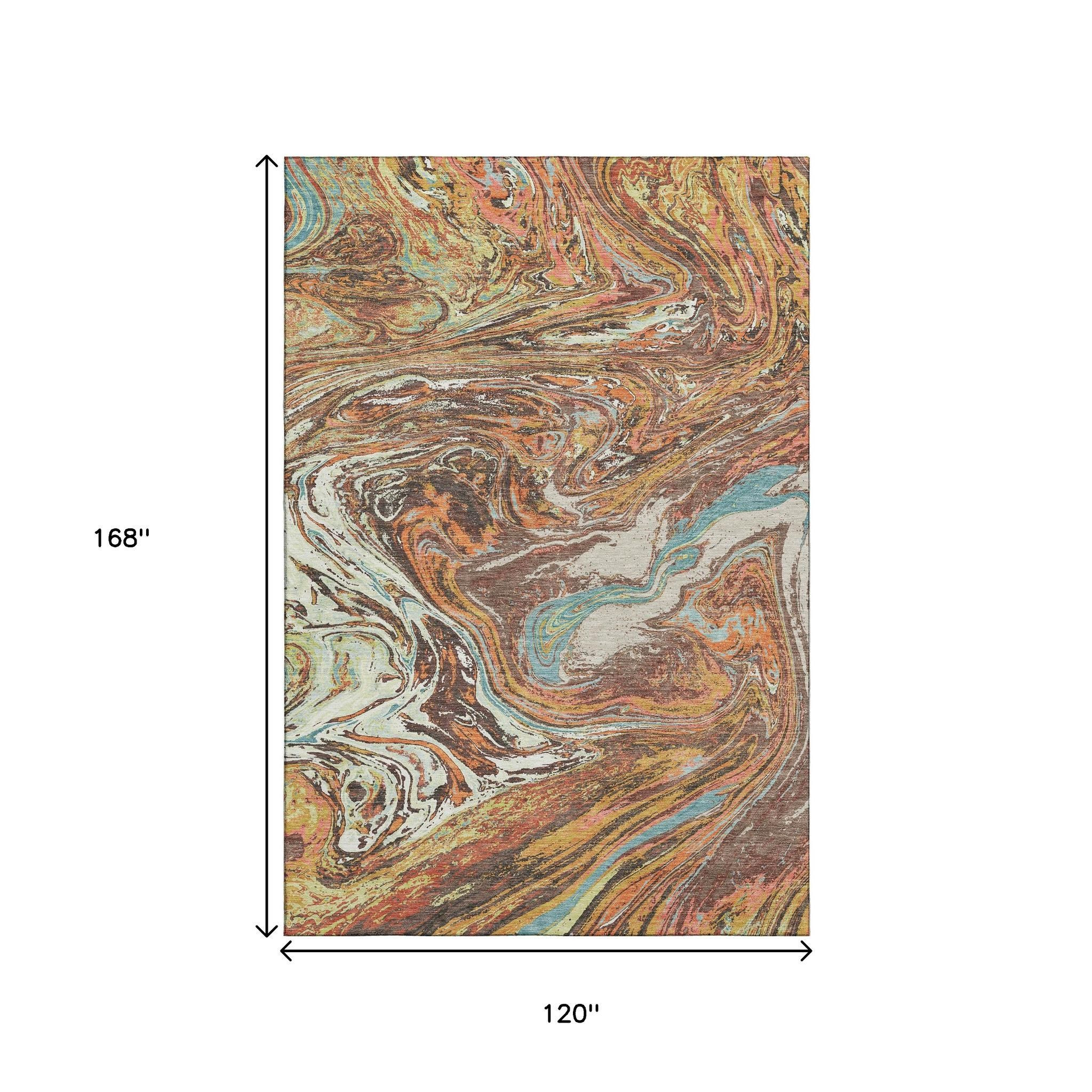 Add some artistry to your room with this 10-foot x 14-foot khaki blue and copper abstract washable area rug with uv protection. Ideal for spaces with kids and pets, this rug is stain resistant to help repel dirt and spilled liquids. Built to last, this rug crafted from polyester fibers is known for its durability and long lasting appeal. Rugs are a great way to showcase your style, hide imperfections, warm your home and reduce noise. This larger sized, transitional styled rug is ready to create a focal point or statement piece in your room. 120.00-inch h x 168.00-inch w x 0.39-inch d.