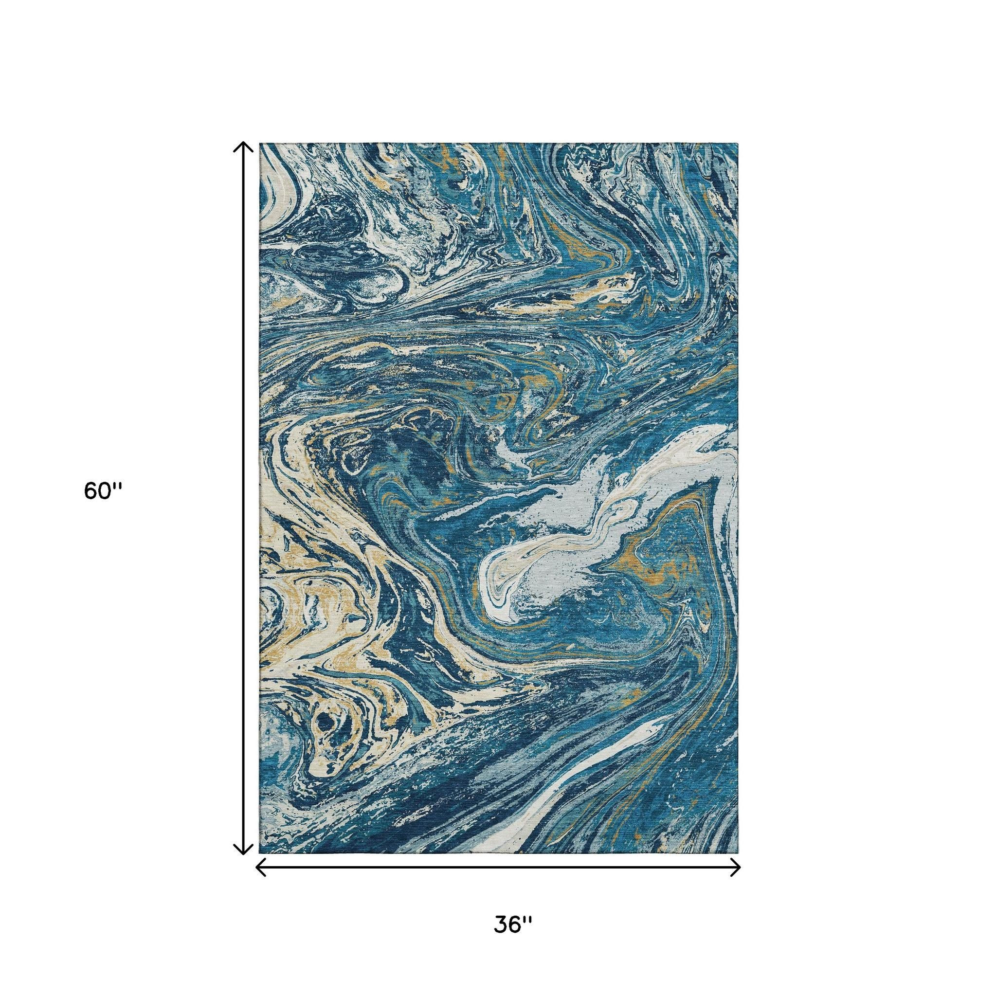 This 3-foot x 5-foot navy blue gold and white abstract washable area rug with uv protection, is a great way to add warmth to a room. Ideal for spaces with kids and pets, this rug is stain resistant to help repel dirt and spilled liquids. Built to last, this rug crafted from polyester fibers is known for its durability and long lasting appeal. Rugs are a great way to showcase your style, hide imperfections, warm your home and reduce noise. This smaller sized, transitional styled rug is just what you need for your walkway, bedside, in front of door, cabinet, refrigerator, or chair. 36.00-inch h x 60.00-inch w x 0.39-inch d.