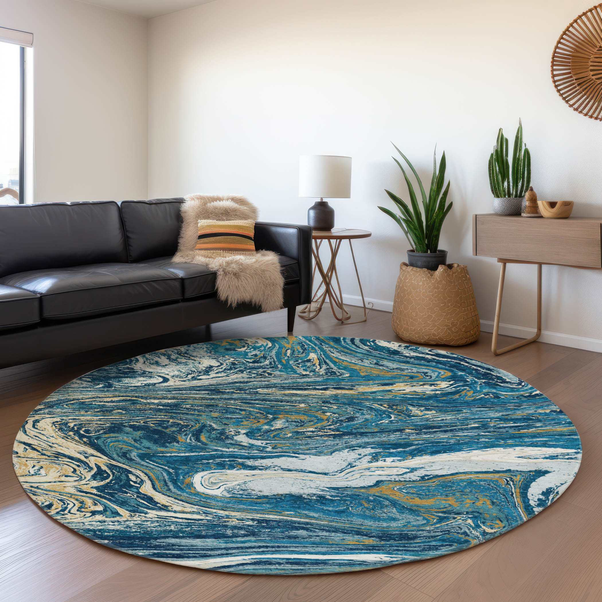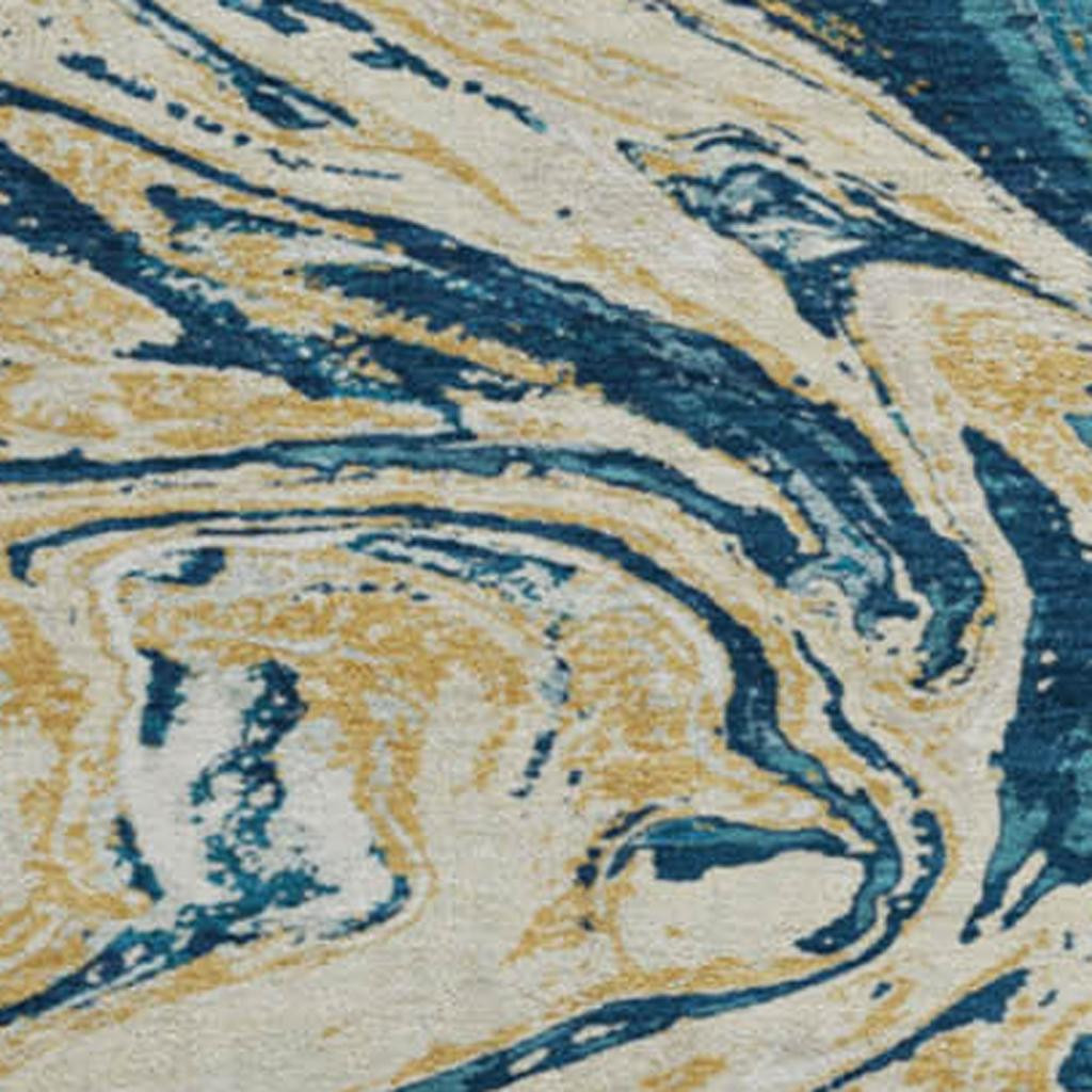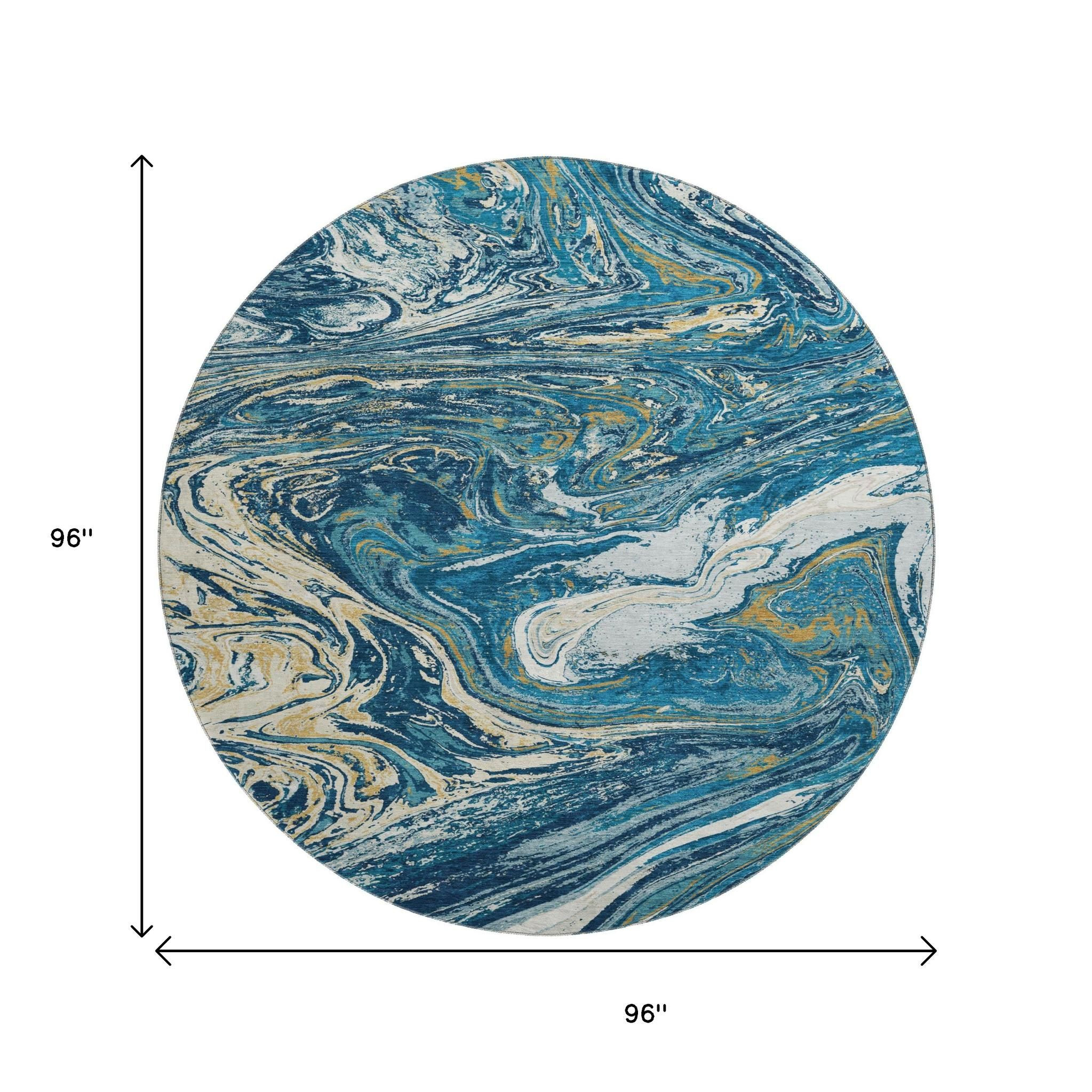 This 8-foot navy blue gold and white abstract washable round rug with uv protection, is a great way to add warmth to a room. Ideal for spaces with kids and pets, this rug is stain resistant to help repel dirt and spilled liquids. Built to last, this rug crafted from polyester fibers is known for its durability and long lasting appeal. Rugs are a great way to showcase your style, hide imperfections, warm your home and reduce noise. This larger sized, transitional styled rug is ready to create a focal point or statement piece in your room. 96.00-inch h x 96.00-inch w x 0.39-inch d.