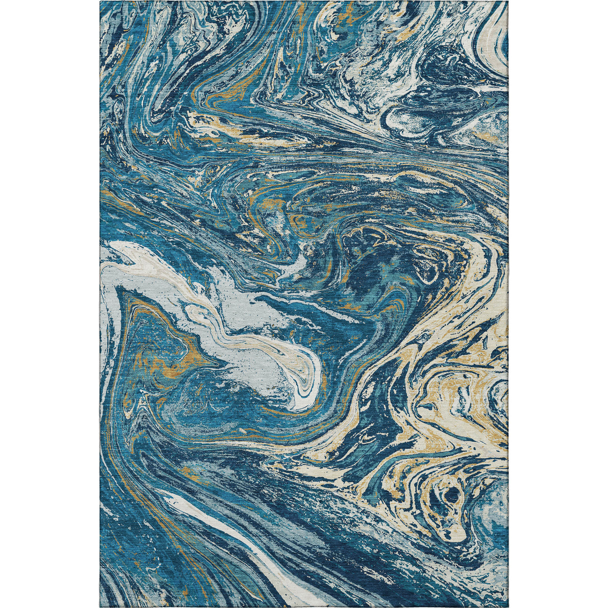 Add some artistry to your room with this 9-foot x 12-foot navy blue gold and white abstract washable area rug with uv protection. Ideal for spaces with kids and pets, this rug is stain resistant to help repel dirt and spilled liquids. Built to last, this rug crafted from polyester fibers is known for its durability and long lasting appeal. Rugs are a great way to showcase your style, hide imperfections, warm your home and reduce noise. This larger sized, transitional styled rug is ready to create a focal point or statement piece in your room. 108.00-inch h x 144.00-inch w x 0.39-inch d.