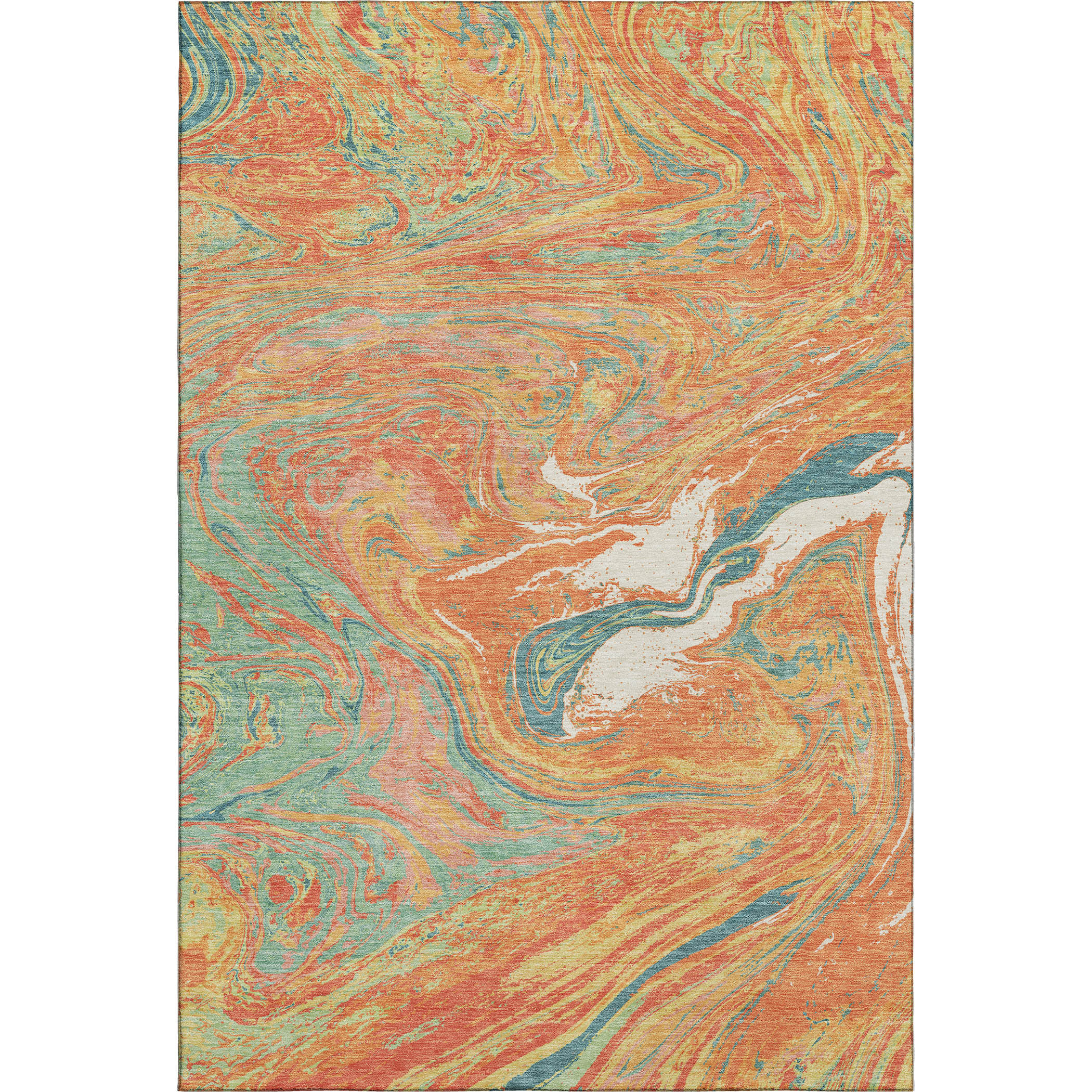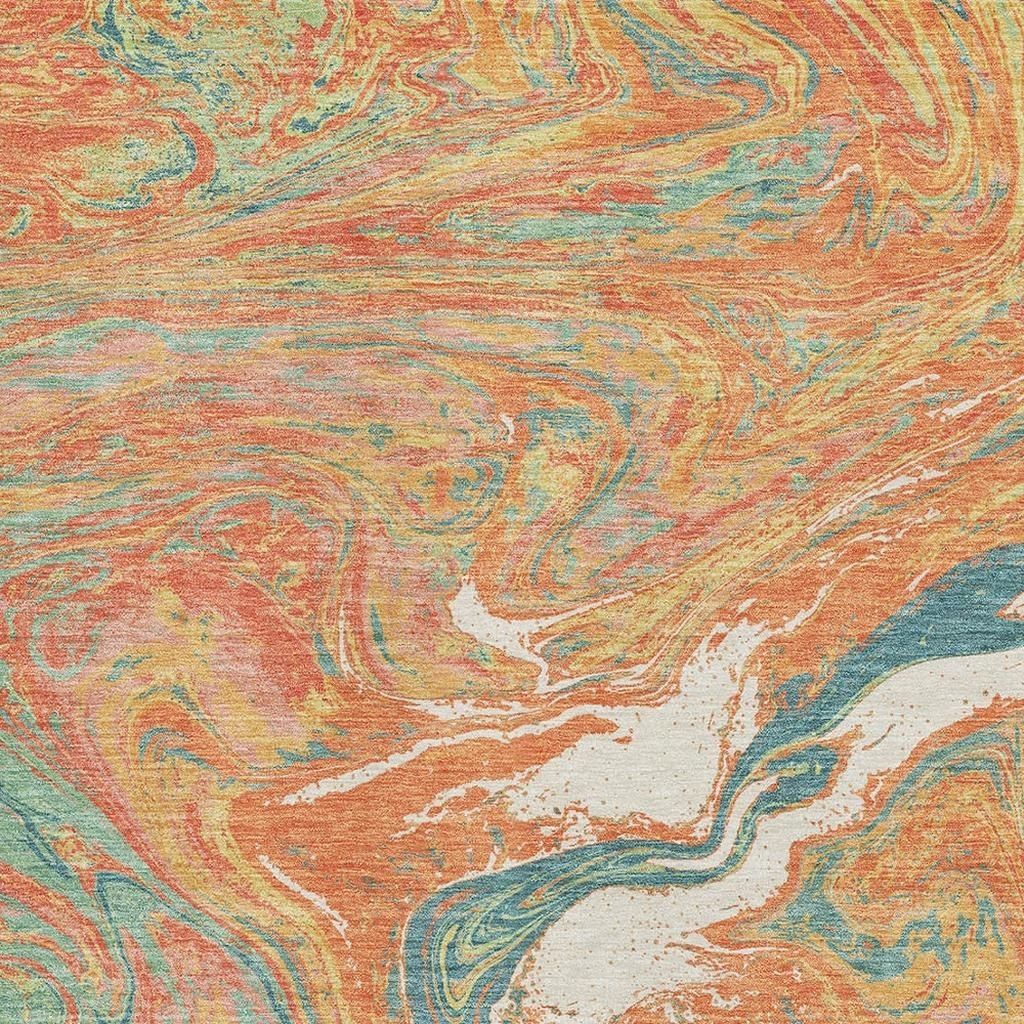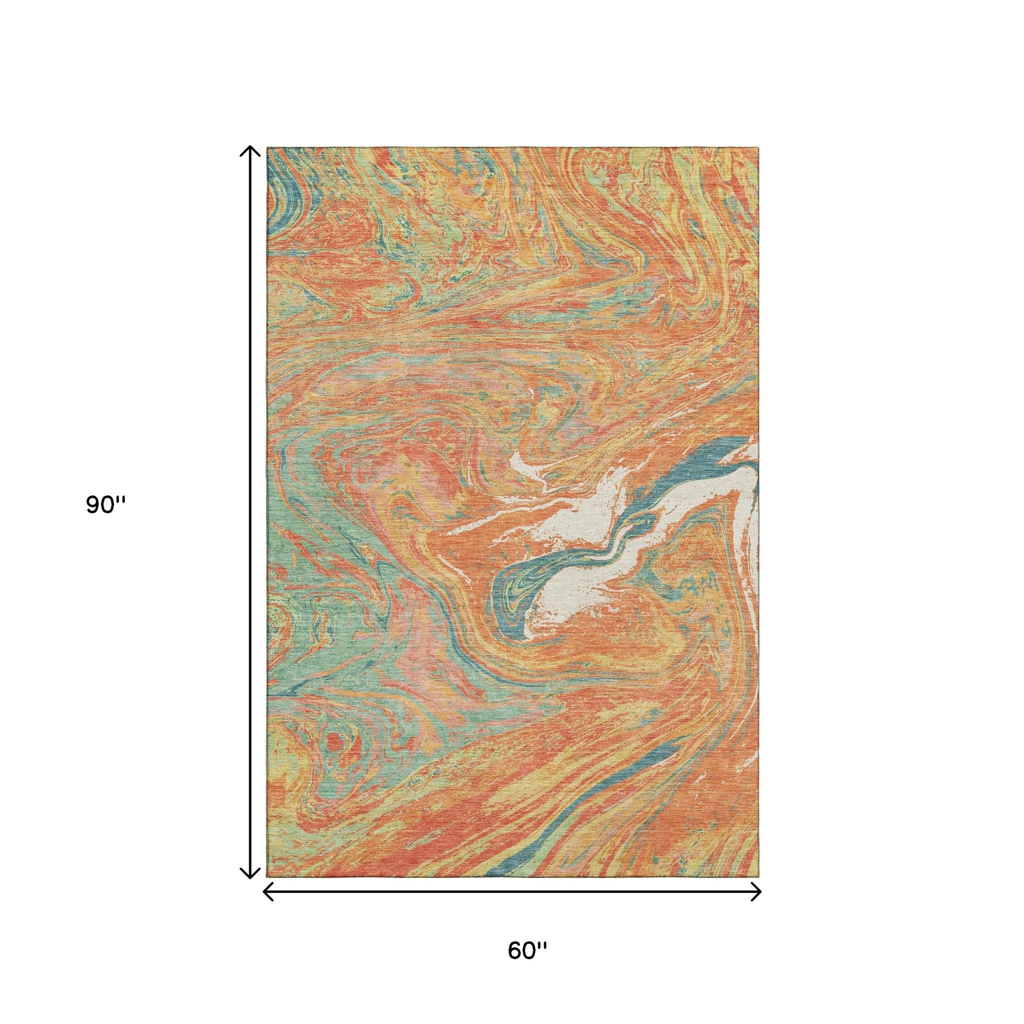 This 5-foot x 8-foot orange teal and sage abstract washable area rug with uv protection, is a great way to add warmth to a room. Ideal for spaces with kids and pets, this rug is stain resistant to help repel dirt and spilled liquids. Built to last, this rug crafted from polyester fibers is known for its durability and long lasting appeal. Rugs are a great way to showcase your style, hide imperfections, warm your home and reduce noise. This larger sized, transitional styled rug is ready to create a focal point or statement piece in your room. 60.00-inch h x 90.00-inch w x 0.39-inch d.
