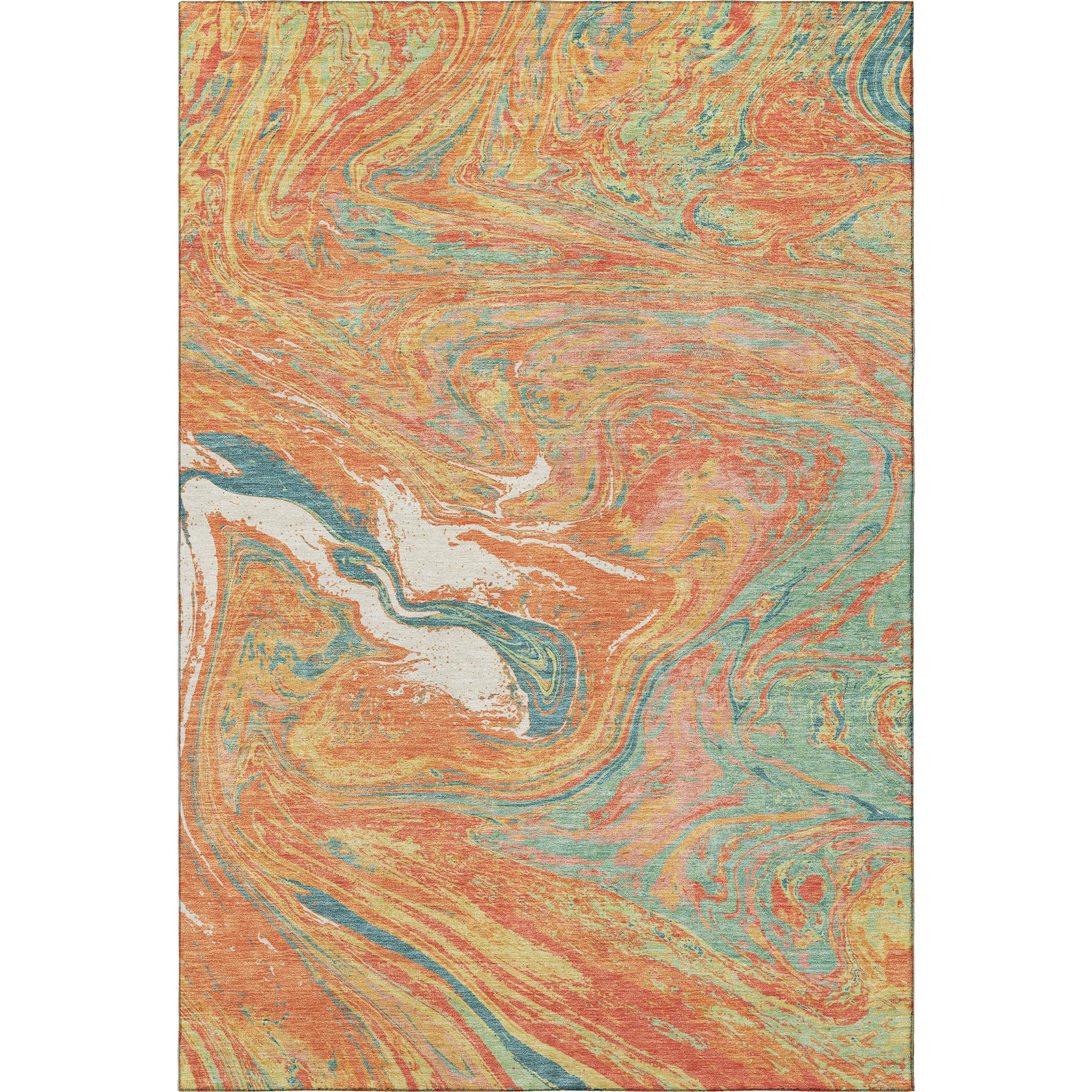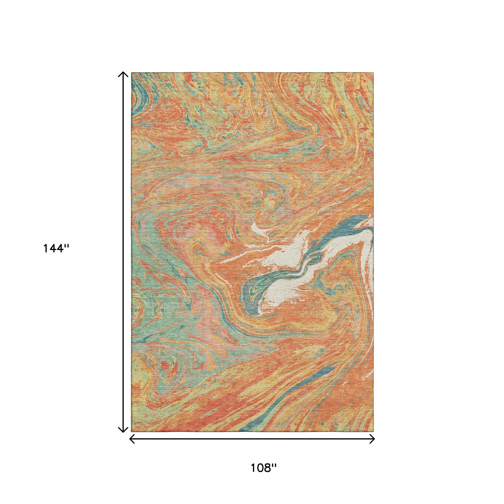This 9-foot x 12-foot orange teal and sage abstract washable area rug with uv protection, is a great way to add warmth to a room. Ideal for spaces with kids and pets, this rug is stain resistant to help repel dirt and spilled liquids. Built to last, this rug crafted from polyester fibers is known for its durability and long lasting appeal. Rugs are a great way to showcase your style, hide imperfections, warm your home and reduce noise. This larger sized, transitional styled rug is ready to create a focal point or statement piece in your room. 108.00-inch h x 144.00-inch w x 0.39-inch d.