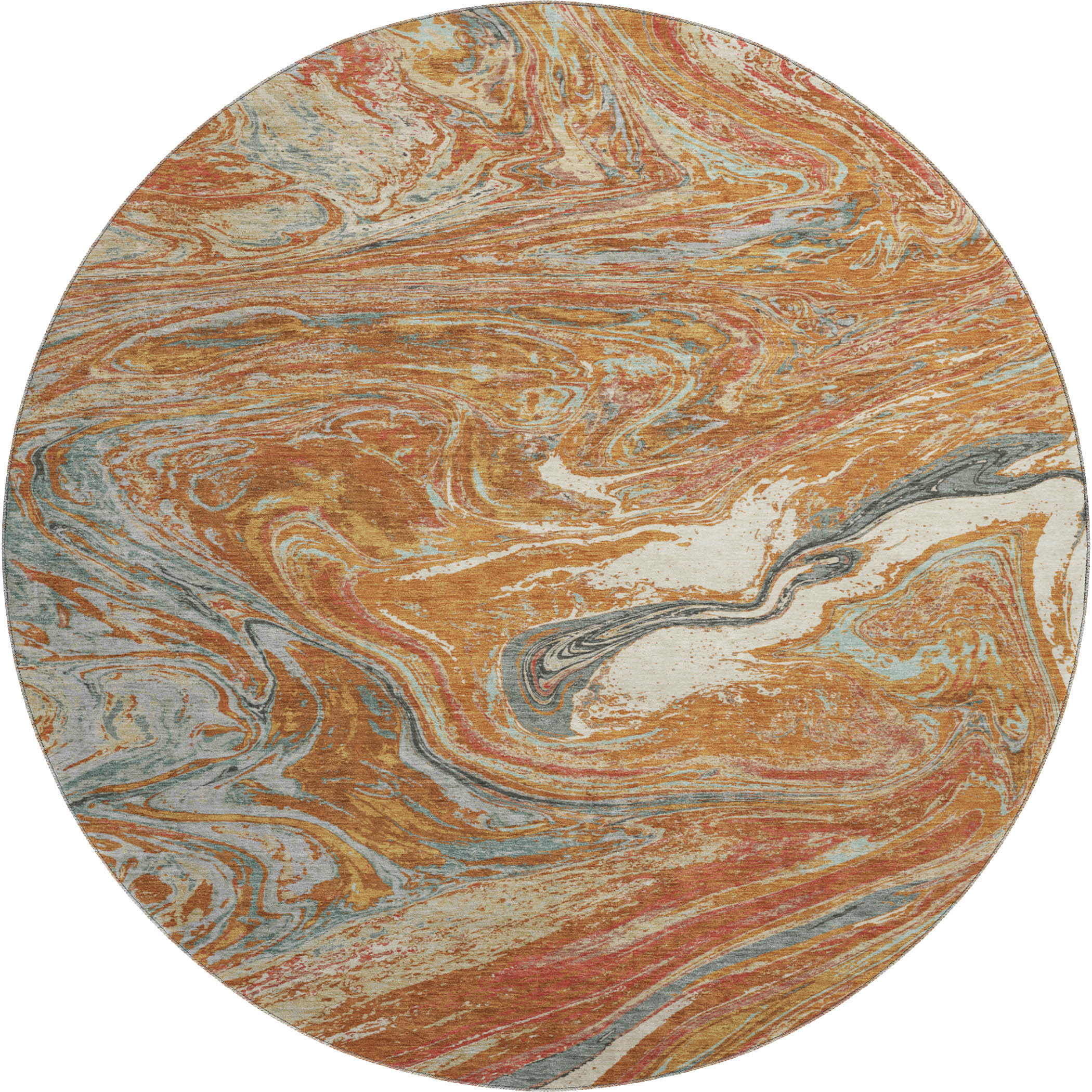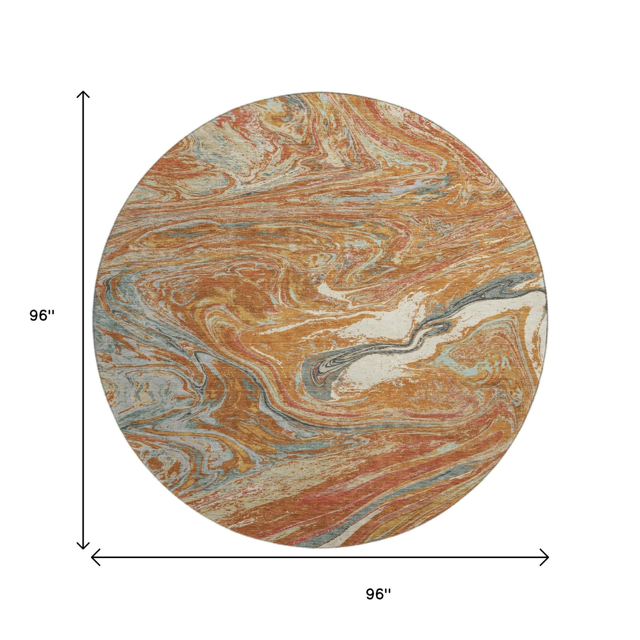 Add some artistry to your room with this 8-foot rust gray and ivory abstract washable round rug with uv protection. Ideal for spaces with kids and pets, this rug is stain resistant to help repel dirt and spilled liquids. Built to last, this rug crafted from polyester fibers is known for its durability and long lasting appeal. Rugs are a great way to showcase your style, hide imperfections, warm your home and reduce noise. This larger sized, transitional styled rug is ready to create a focal point or statement piece in your room. 96.00-inch h x 96.00-inch w x 0.39-inch d.