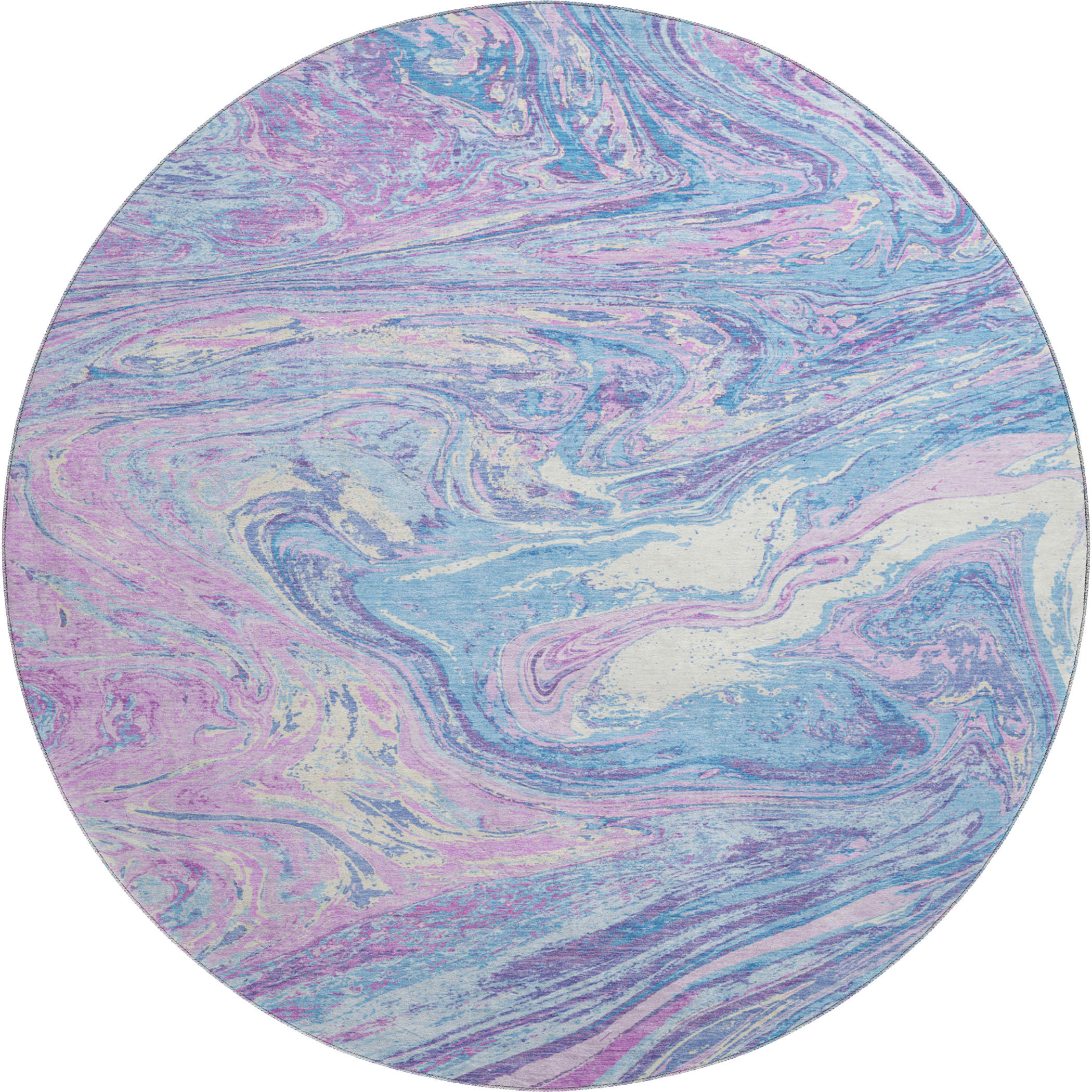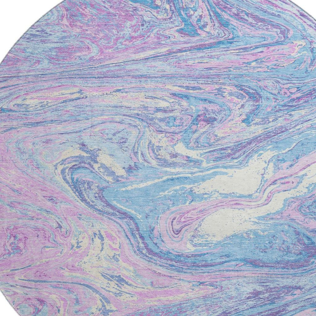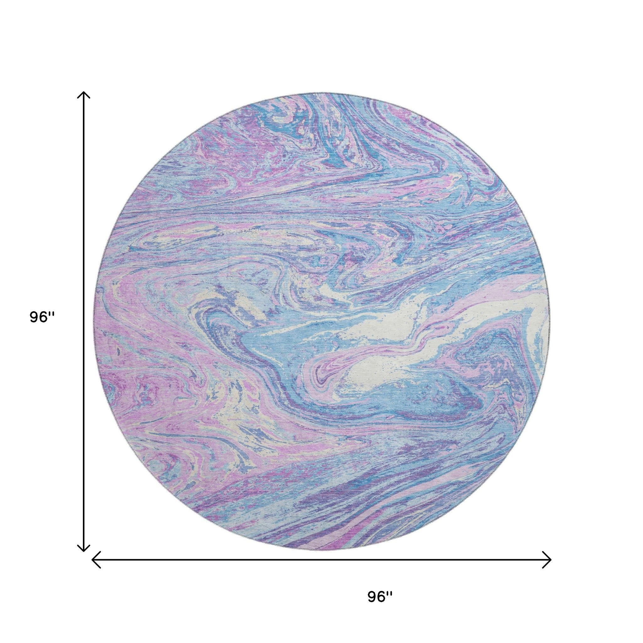 Add some artistry to your room with this 8-foot sky blue lavender and ivory abstract washable round rug with uv protection. Ideal for spaces with kids and pets, this rug is stain resistant to help repel dirt and spilled liquids. Built to last, this rug crafted from polyester fibers is known for its durability and long lasting appeal. Rugs are a great way to showcase your style, hide imperfections, warm your home and reduce noise. This larger sized, transitional styled rug is ready to create a focal point or statement piece in your room. 96.00-inch h x 96.00-inch w x 0.39-inch d.