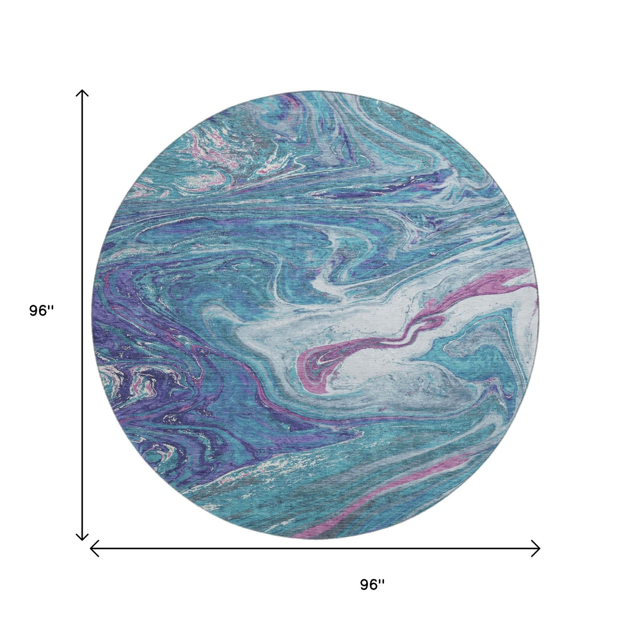 Set an inviting tone in your space with this 8-foot teal purple and ivory abstract washable round rug with uv protection. Ideal for spaces with kids and pets, this rug is stain resistant to help repel dirt and spilled liquids. Built to last, this rug crafted from polyester fibers is known for its durability and long lasting appeal. Rugs are a great way to showcase your style, hide imperfections, warm your home and reduce noise. This larger sized, transitional styled rug is ready to create a focal point or statement piece in your room. 96.00-inch h x 96.00-inch w x 0.39-inch d.