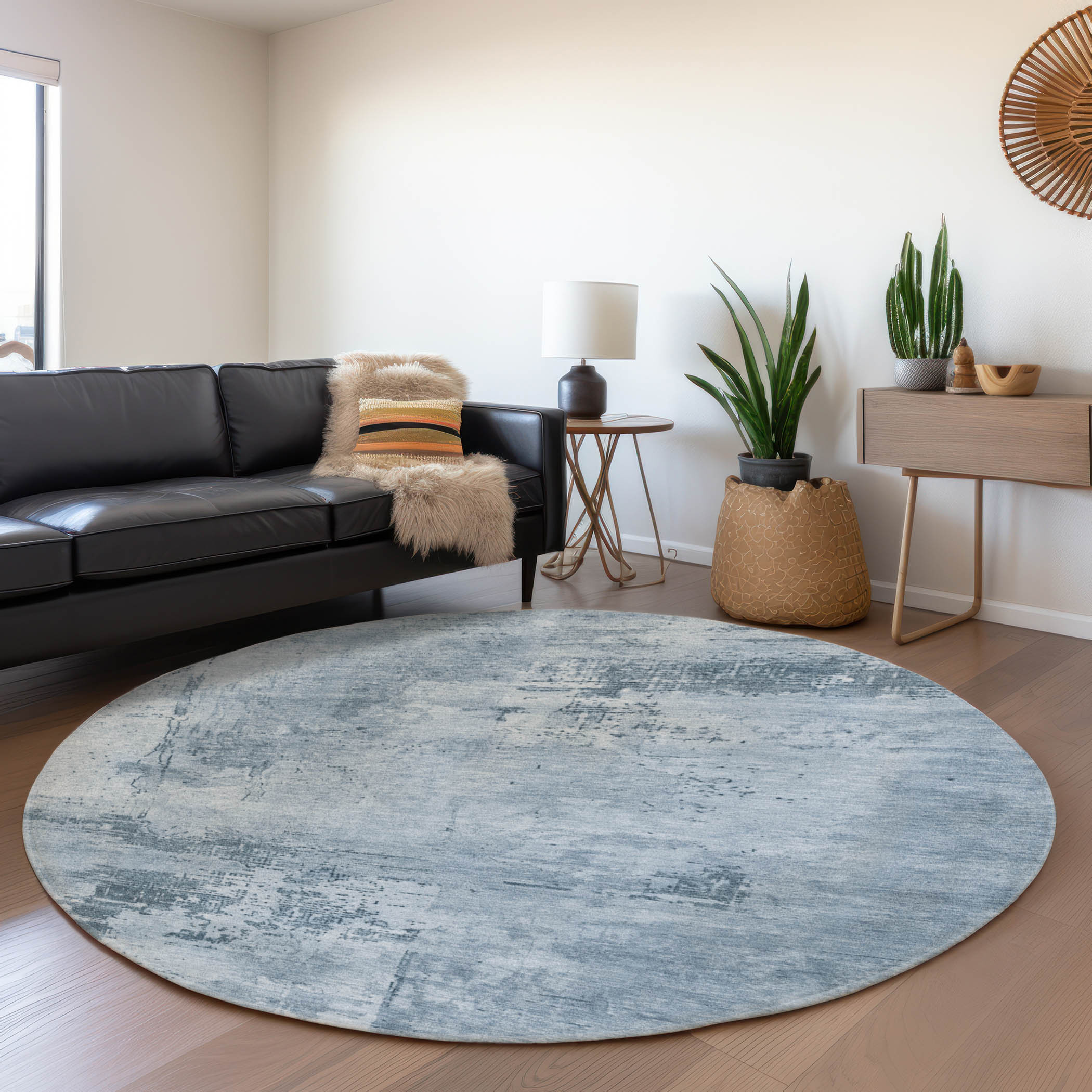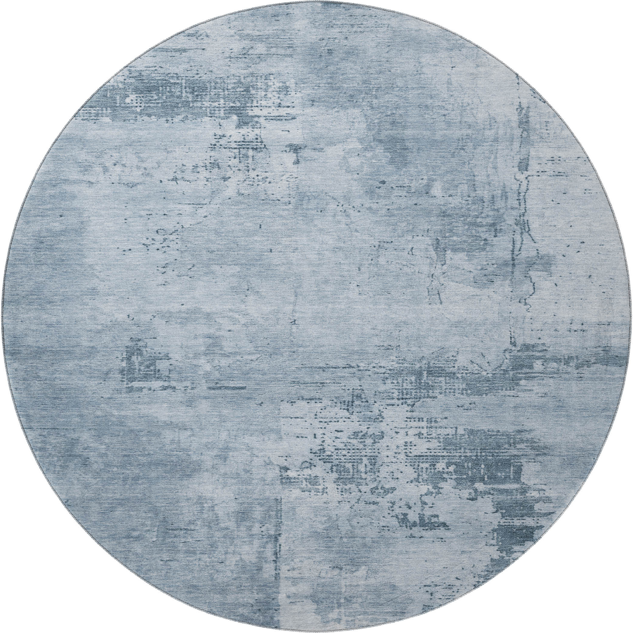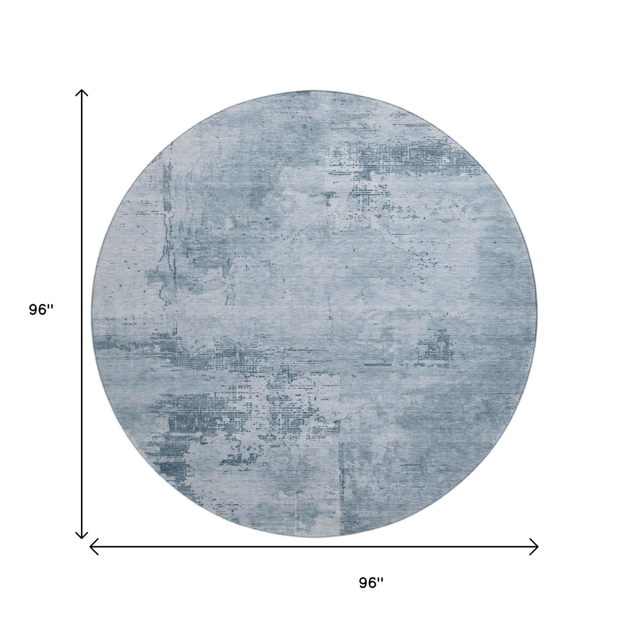 This 8-foot denim blue and ivory abstract washable round rug with uv protection, is a great way to add warmth to a room. Ideal for spaces with kids and pets, this rug is stain resistant to help repel dirt and spilled liquids. Built to last, this rug crafted from polyester fibers is known for its durability and long lasting appeal. Rugs are a great way to showcase your style, hide imperfections, warm your home and reduce noise. This larger sized, transitional styled rug is ready to create a focal point or statement piece in your room. 96.00-inch h x 96.00-inch w x 0.39-inch d.