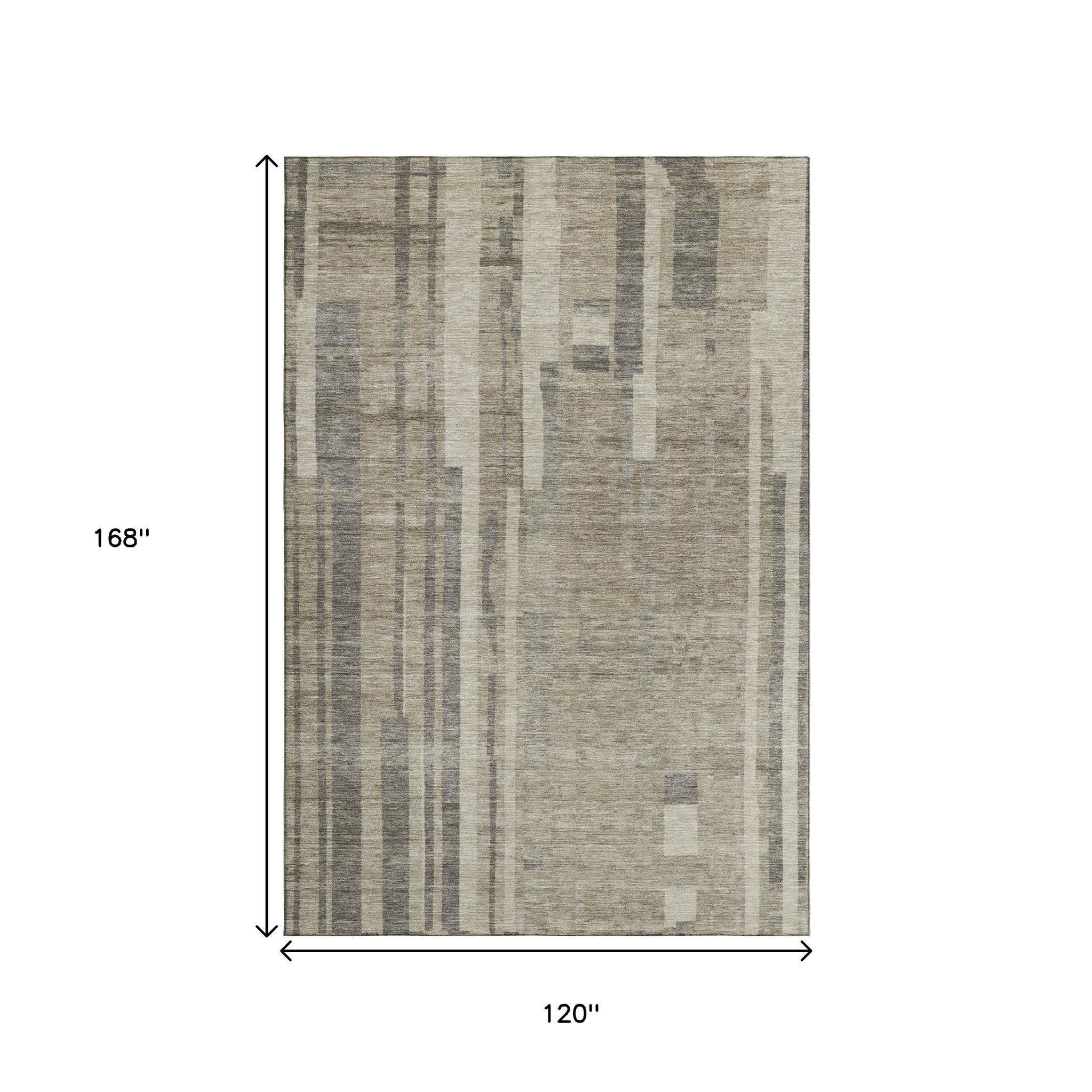 Set an inviting tone in your space with this 10-foot x 14-foot taupe and beige striped washable area rug with uv protection. Ideal for spaces with kids and pets, this rug is stain resistant to help repel dirt and spilled liquids. Built to last, this rug crafted from polyester fibers is known for its durability and long lasting appeal. Rugs are a great way to showcase your style, hide imperfections, warm your home and reduce noise. This larger sized, transitional styled rug is ready to create a focal point or statement piece in your room. 120.00-inch h x 168.00-inch w x 0.39-inch d.