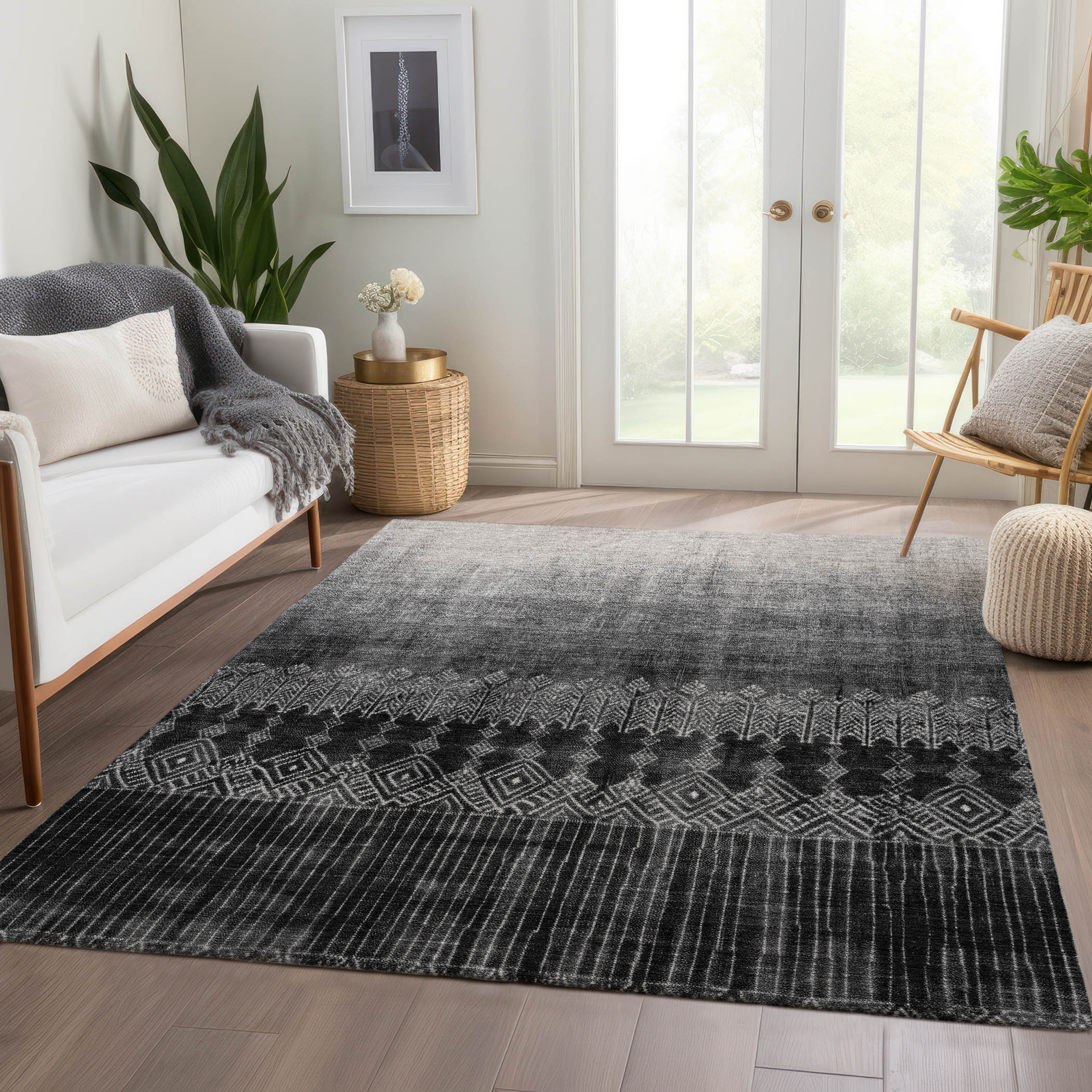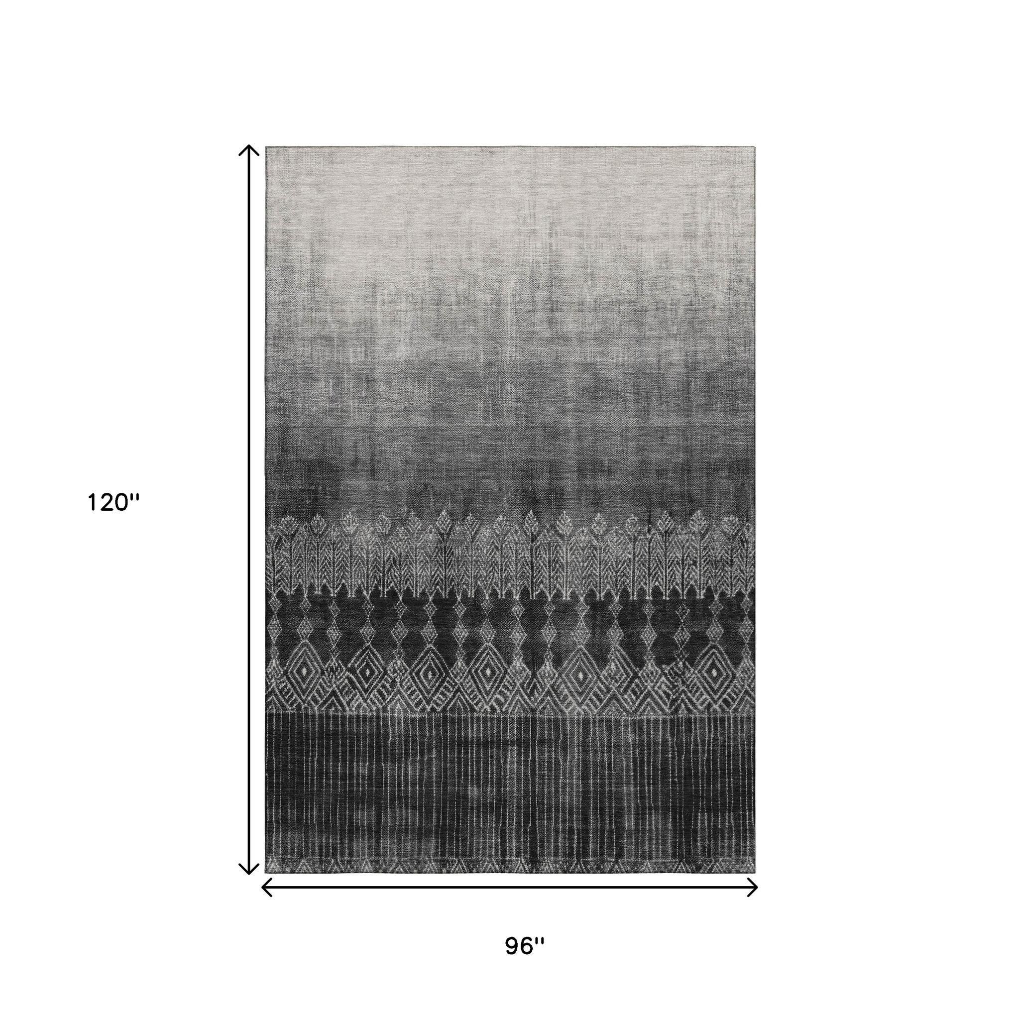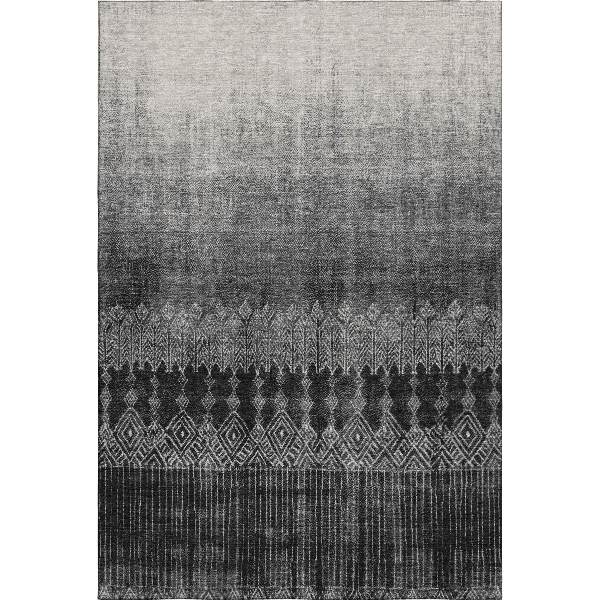 Add some artistry to your room with this 8-foot x 10-foot black silver and gray ombre washable area rug with uv protection. Ideal for spaces with kids and pets, this rug is stain resistant to help repel dirt and spilled liquids. Built to last, this rug crafted from polyester fibers is known for its durability and long lasting appeal. Rugs are a great way to showcase your style, hide imperfections, warm your home and reduce noise. This larger sized, transitional styled rug is ready to create a focal point or statement piece in your room. 96.00-inch h x 120.00-inch w x 0.39-inch d.