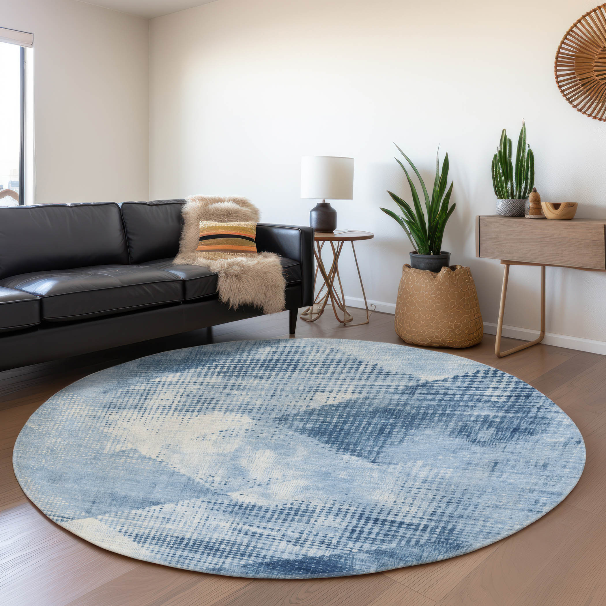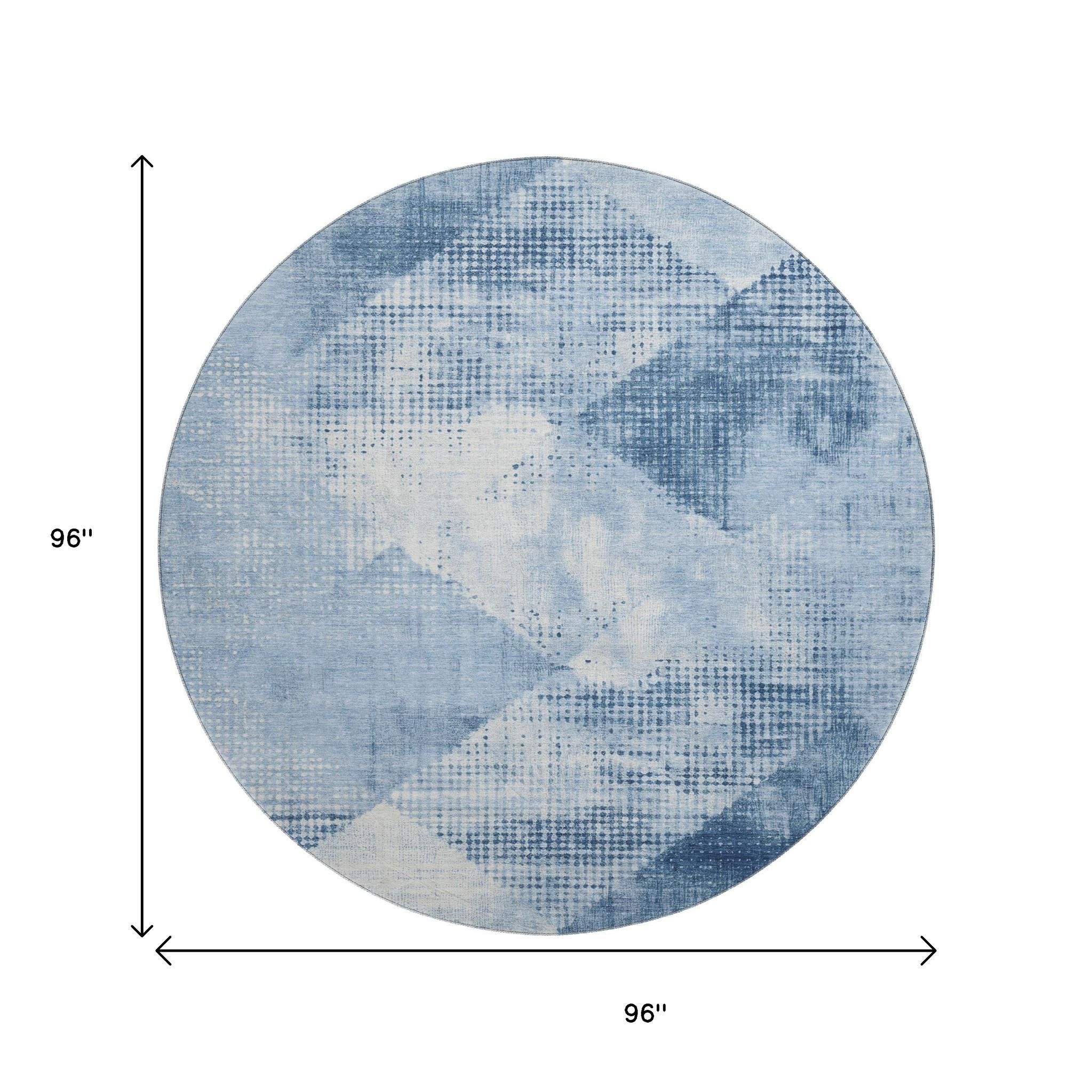Set an inviting tone in your space with this 8-foot sky blue denim blue and ivory diamond washable round rug with uv protection. Ideal for spaces with kids and pets, this rug is stain resistant to help repel dirt and spilled liquids. Built to last, this rug crafted from polyester fibers is known for its durability and long lasting appeal. Rugs are a great way to showcase your style, hide imperfections, warm your home and reduce noise. This larger sized, transitional styled rug is ready to create a focal point or statement piece in your room. 96.00-inch h x 96.00-inch w x 0.39-inch d.