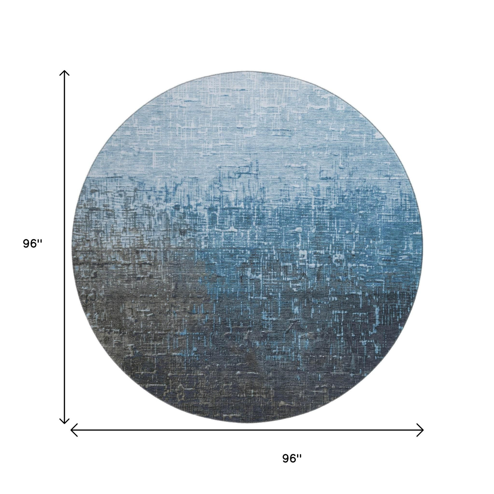 Set an inviting tone in your space with this 8-foot blue gray and charcoal ombre washable round rug with uv protection. Ideal for spaces with kids and pets, this rug is stain resistant to help repel dirt and spilled liquids. Built to last, this rug crafted from polyester fibers is known for its durability and long lasting appeal. Rugs are a great way to showcase your style, hide imperfections, warm your home and reduce noise. This larger sized, transitional styled rug is ready to create a focal point or statement piece in your room. 96.00-inch h x 96.00-inch w x 0.39-inch d.