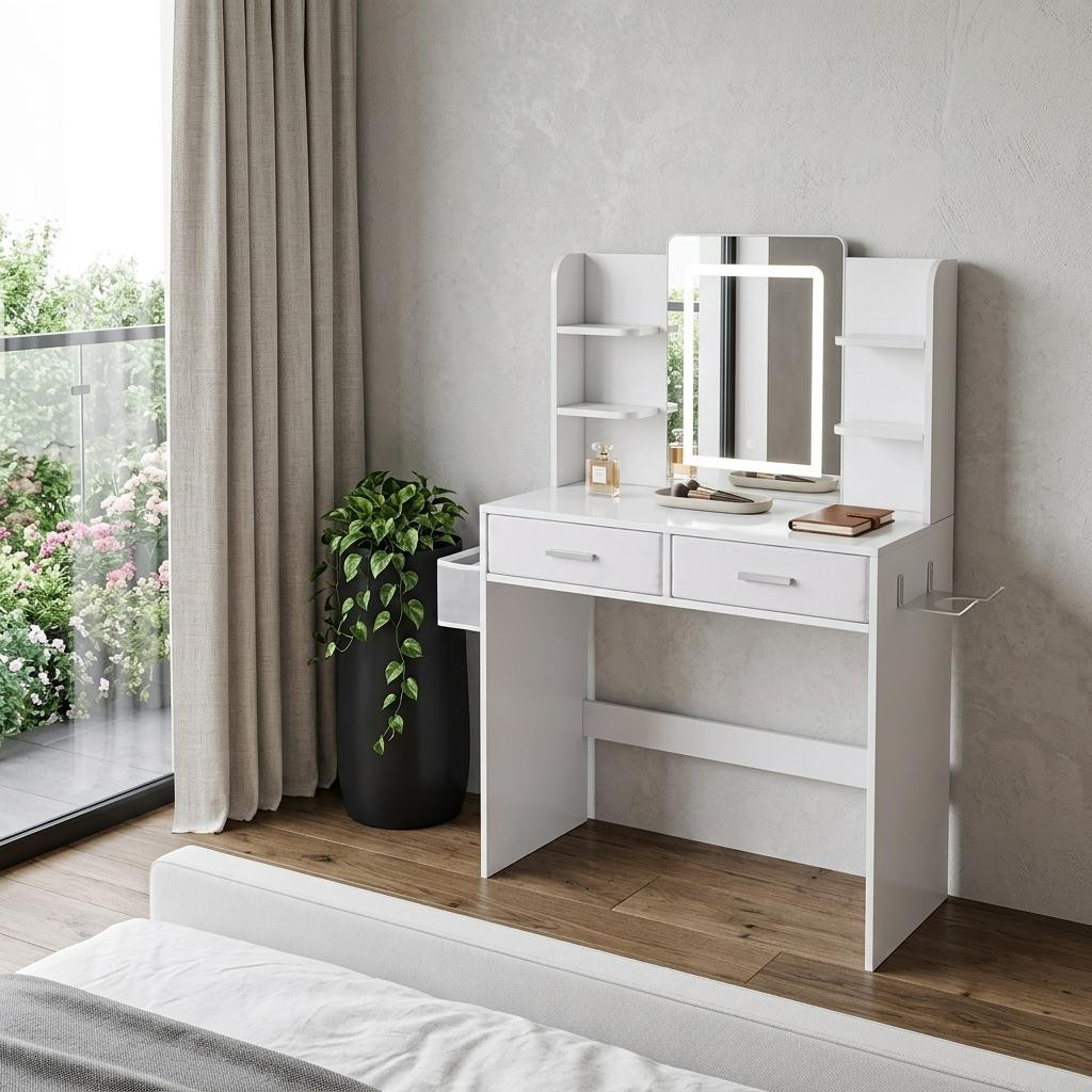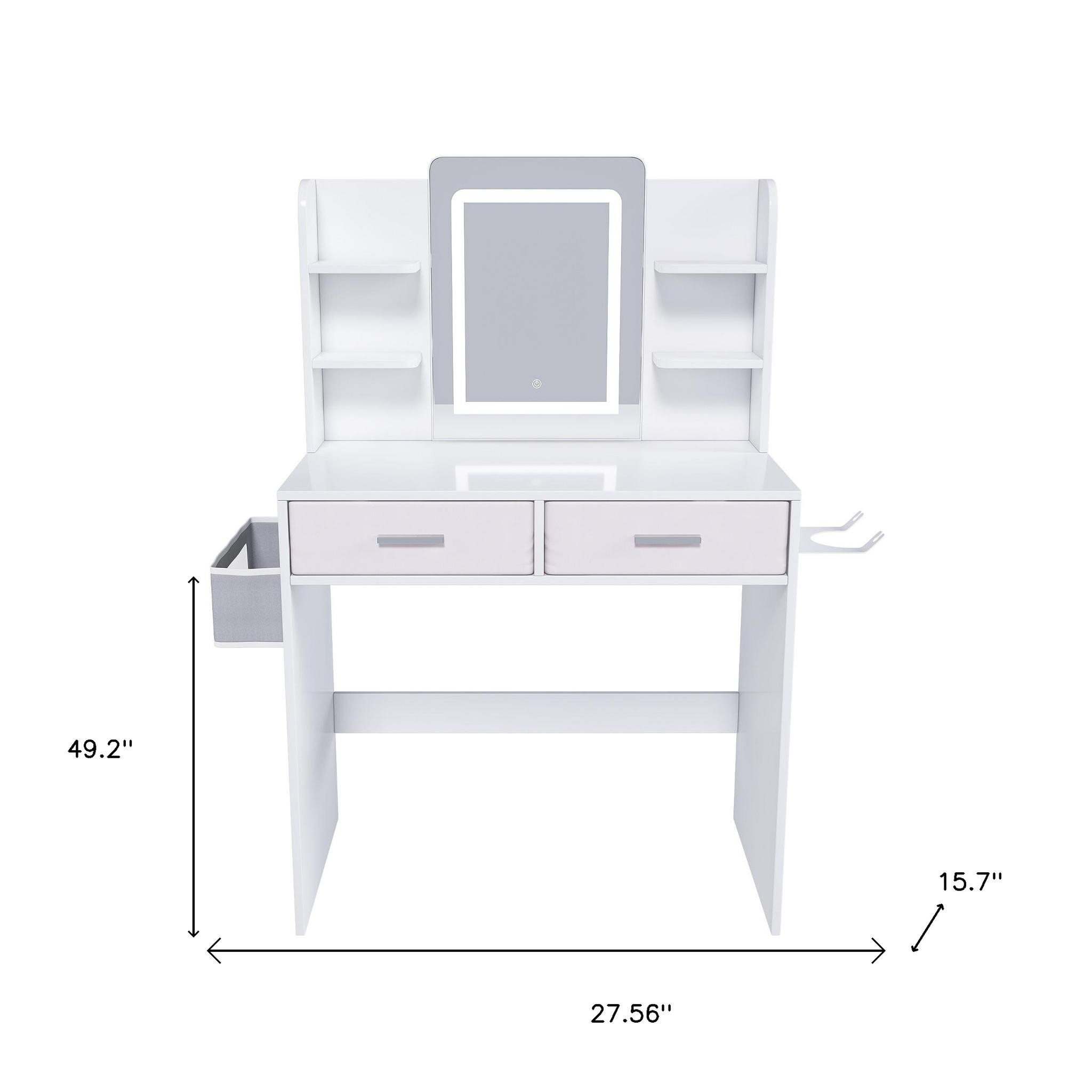 Get ready in style with our luxury 28-inch white wood mirrored two drawer vanity table and lights. Add a touch of modern style to your bedroom or bathroom with this fabulous sparkling mirrored vanity table. Have no fear of accidental scratches or spills, this table features a manufactured wood base which is easy to clean and maintain. Our vanity with included drawer space adds functionality along with a touch of elegance and sophistication to your space. Upgrade your beauty routine with our high-quality vanity table. Start enjoying a more efficient and stylish beauty routine with this fabulous vanity!. 49.20-inch h x 27.56-inch w x 15.70-inch d.