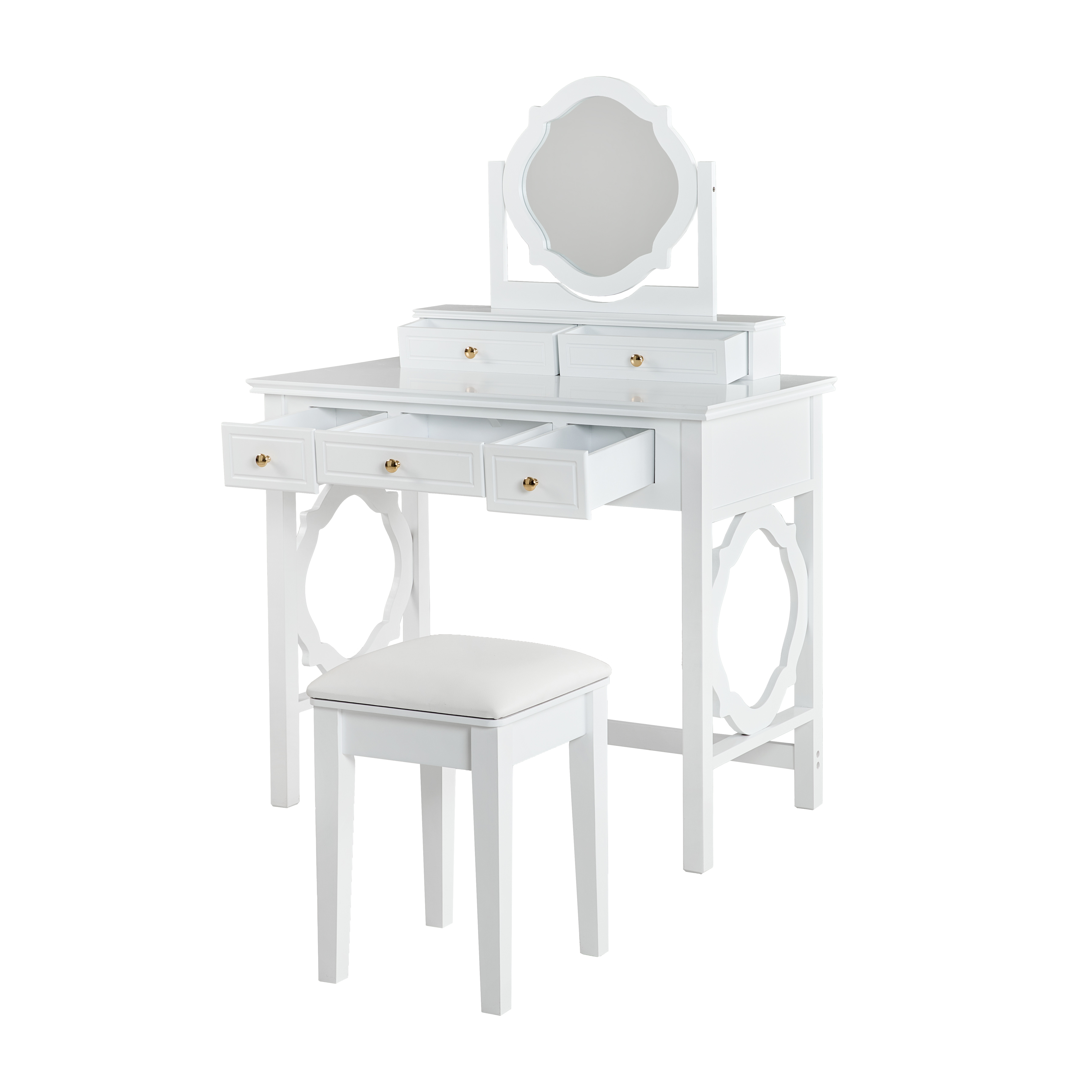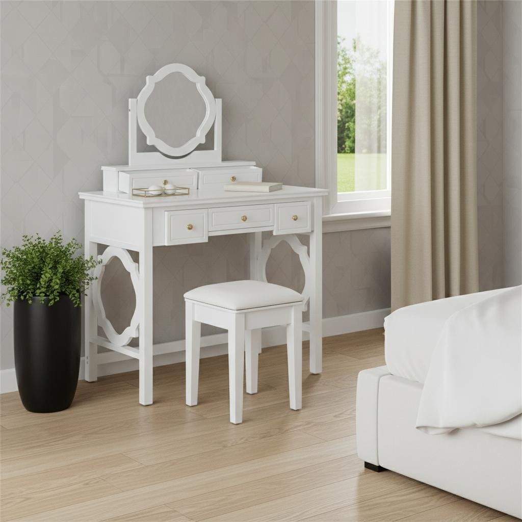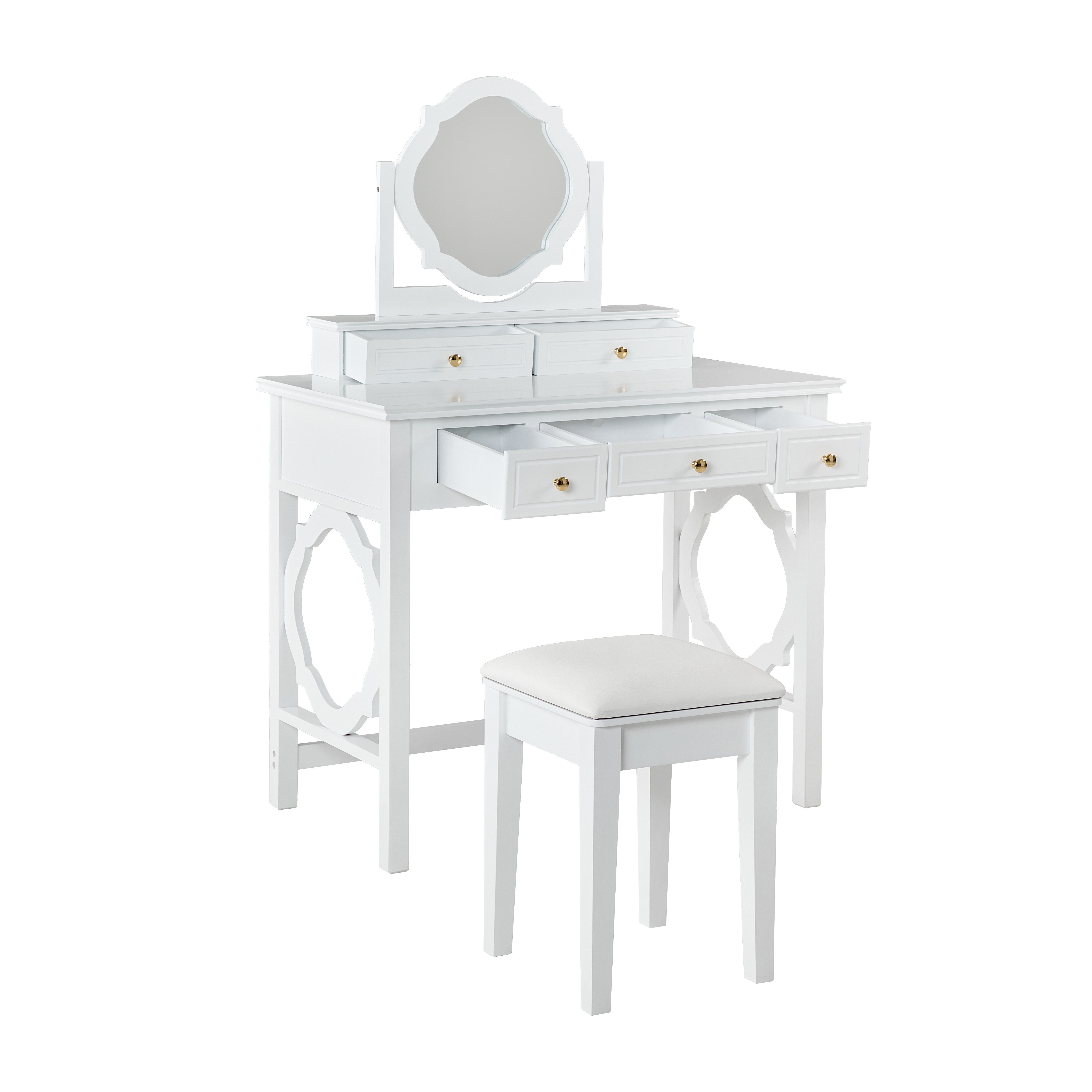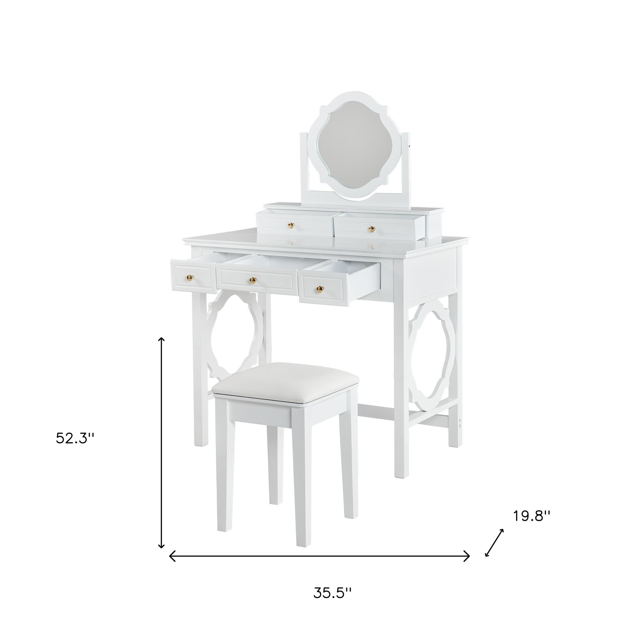Our 36-inch white wood mirrored five drawer vanity table is designed to make getting ready a breeze. Add a touch of modern style to your bedroom or bathroom with this fabulous sparkling mirrored vanity table. This table has a manufactured base, which is an unmatchable combination of beauty and durability. Upgrade your beauty routine with our high-quality vanity table. Our versatile vanity will cater to your grooming needs, whether it's keeping organized, applying makeup, styling your hair, or achieving your best look every day. 52.30-inch h x 35.50-inch w x 19.80-inch d.