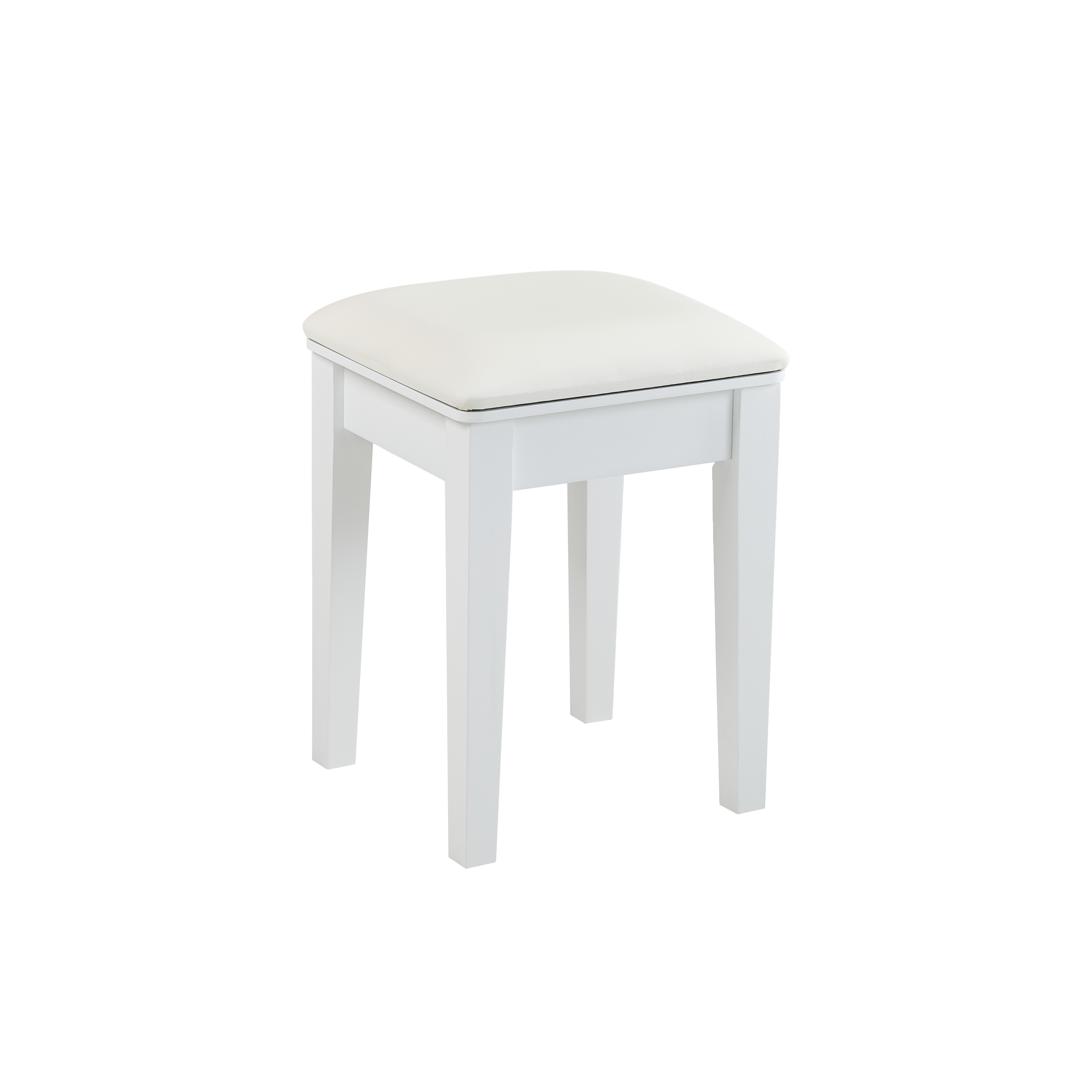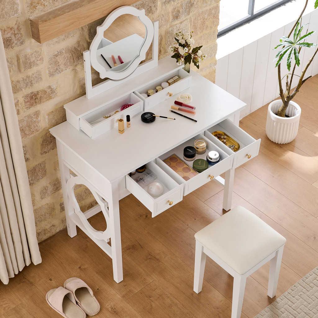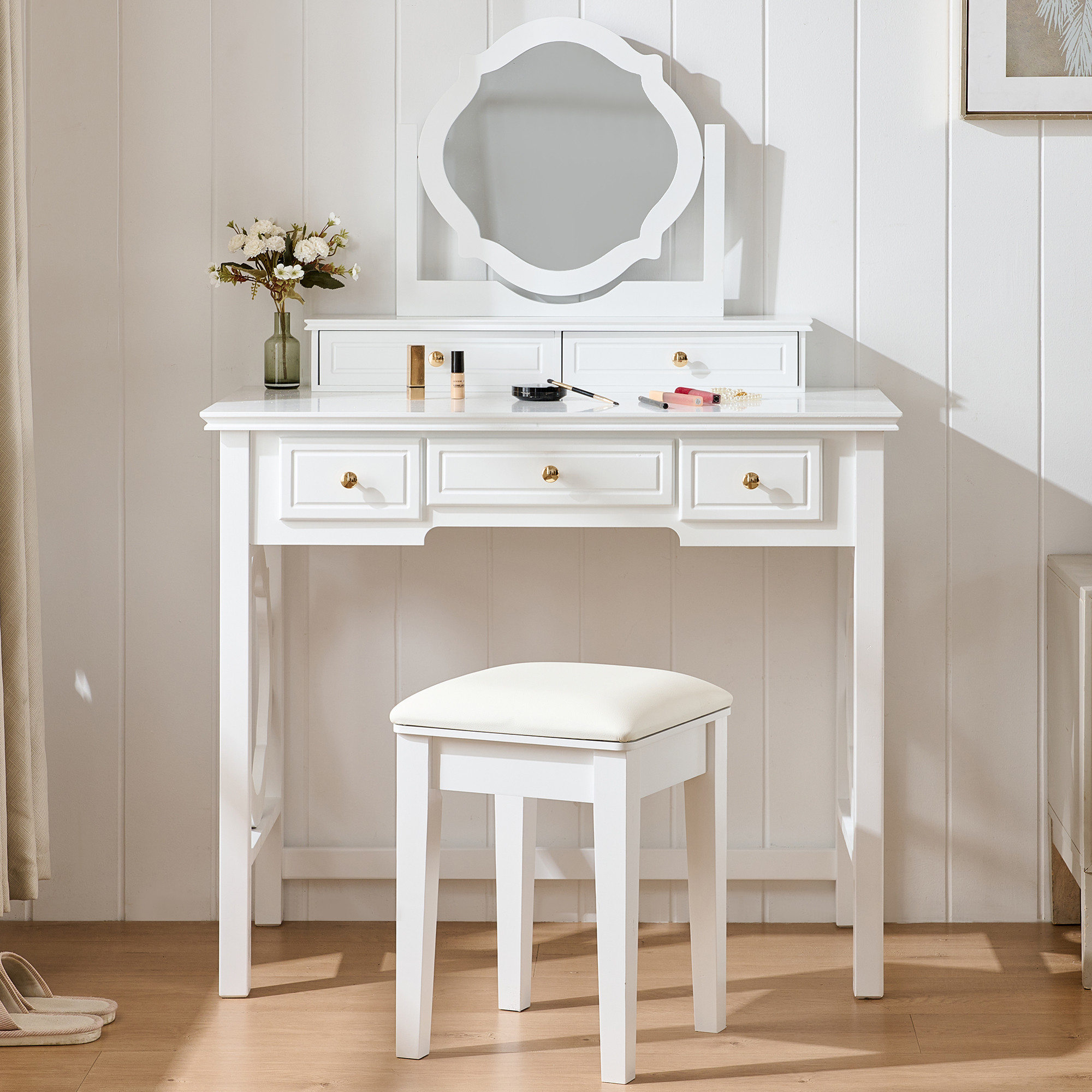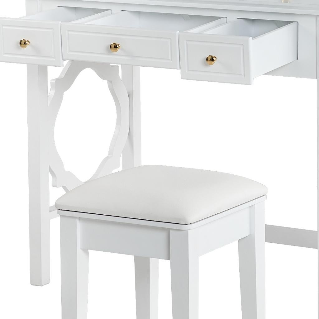 Our 36-inch white wood mirrored five drawer vanity table is designed to make getting ready a breeze. Add a touch of modern style to your bedroom or bathroom with this fabulous sparkling mirrored vanity table. This table has a manufactured base, which is an unmatchable combination of beauty and durability. Upgrade your beauty routine with our high-quality vanity table. Our versatile vanity will cater to your grooming needs, whether it's keeping organized, applying makeup, styling your hair, or achieving your best look every day. 52.30-inch h x 35.50-inch w x 19.80-inch d.