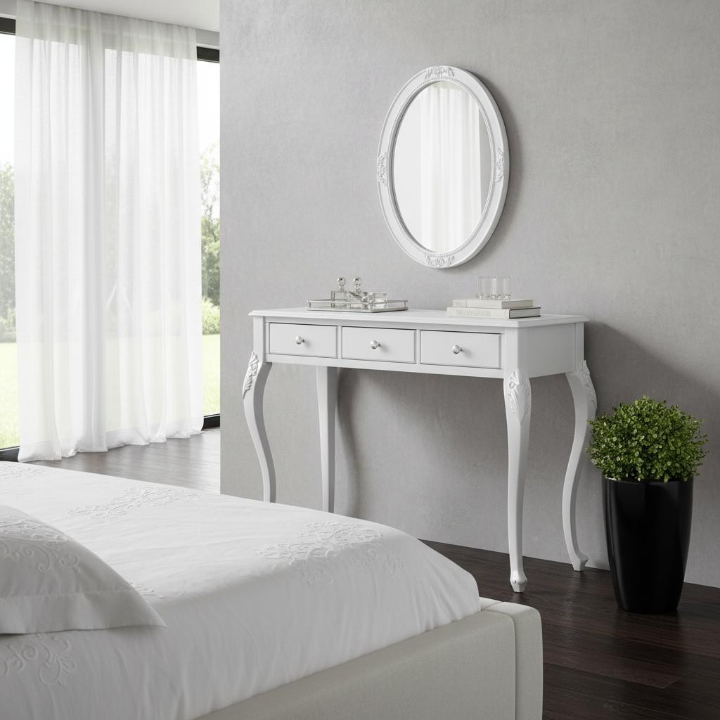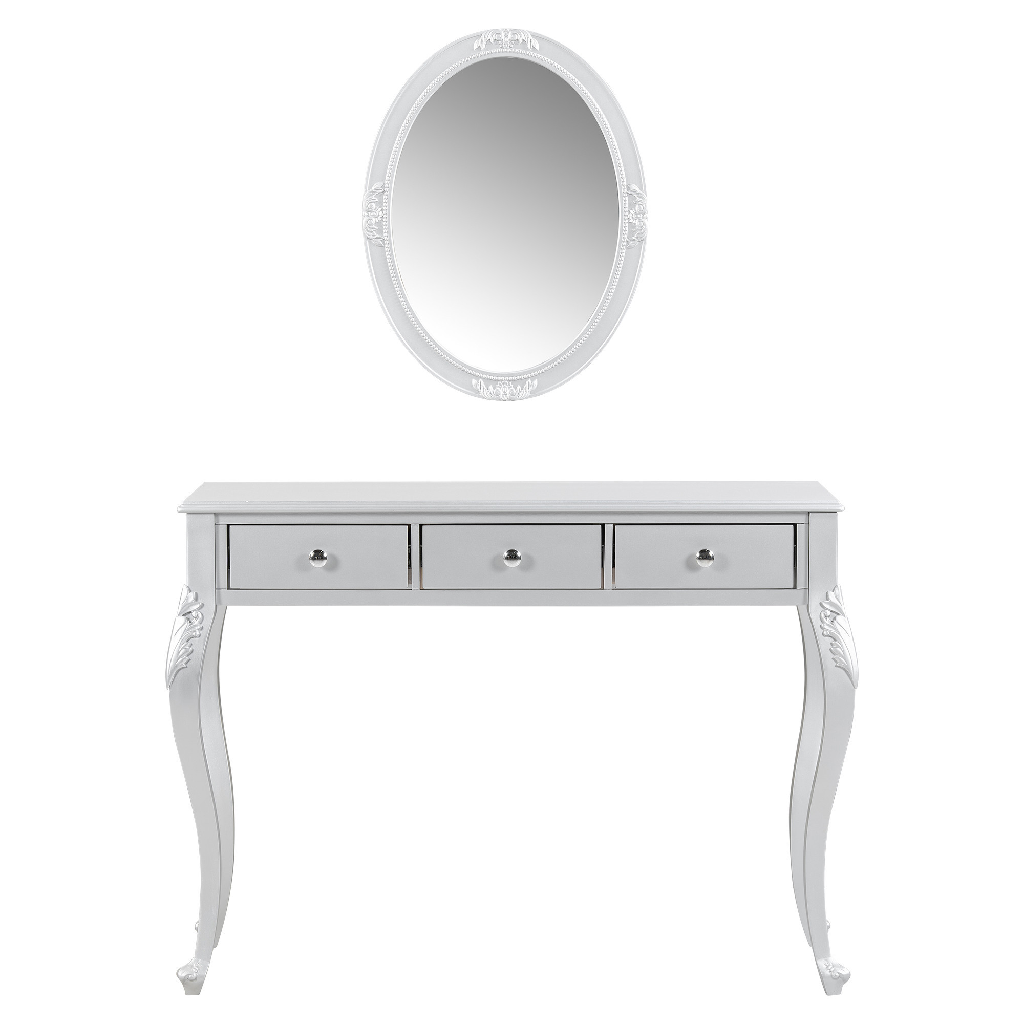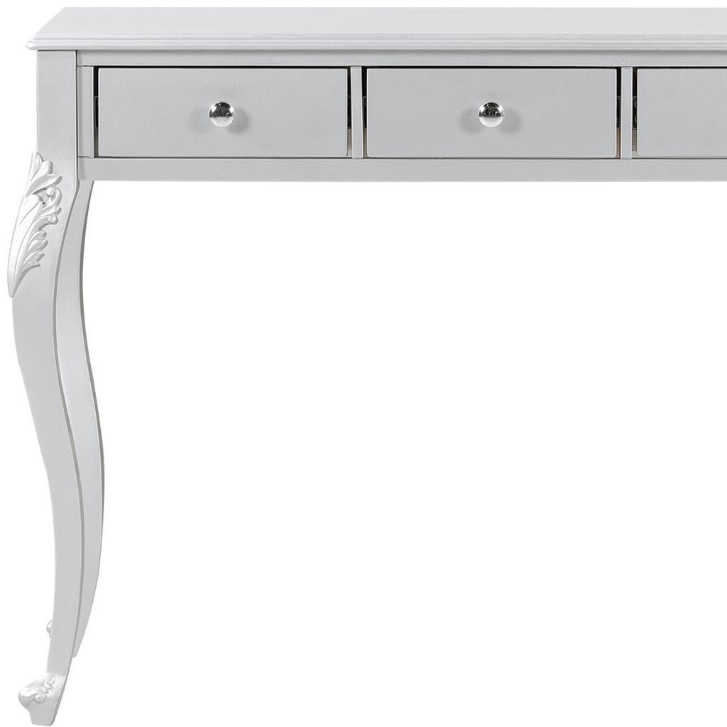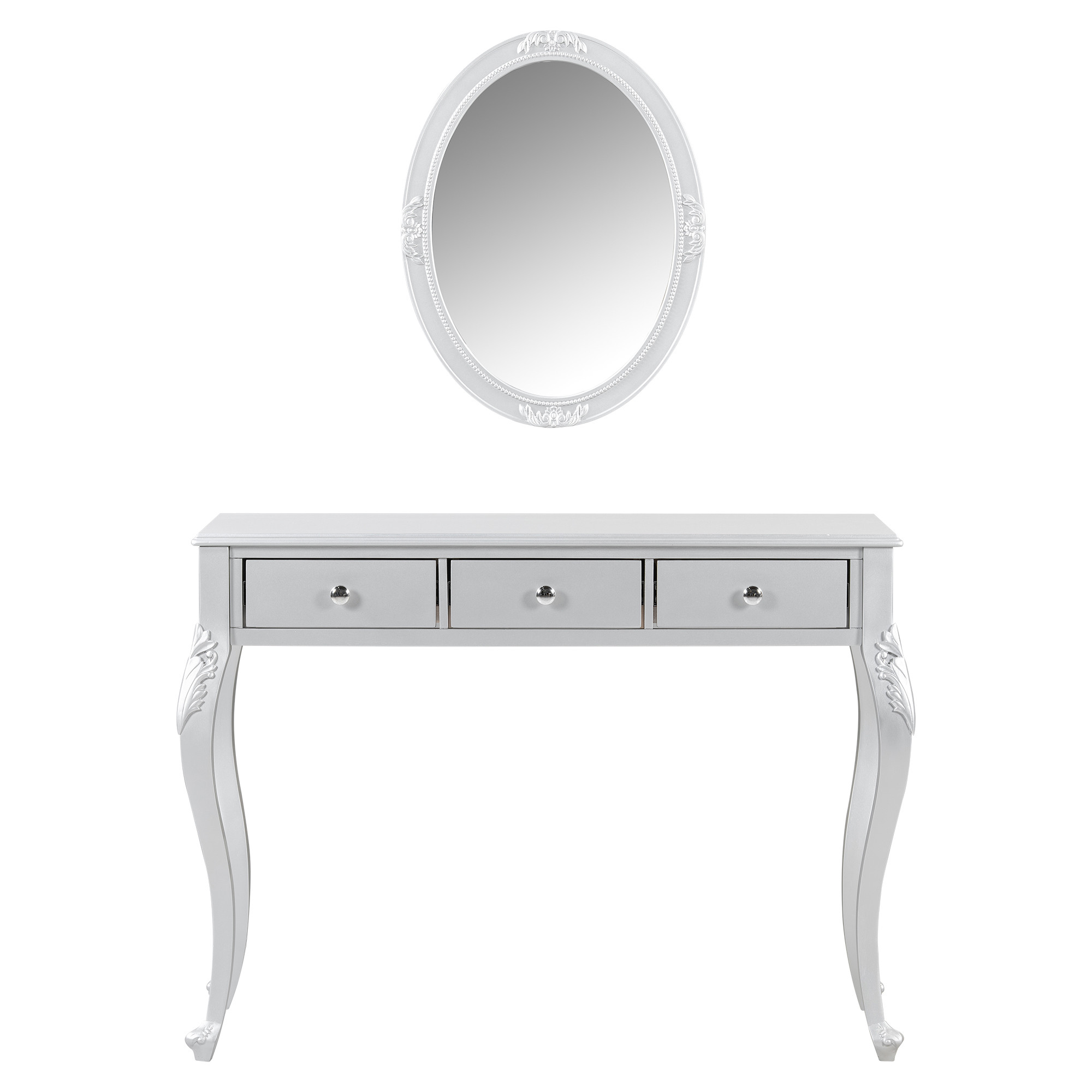 Transform your morning routine with our stylish and functional 39-inch silver wood mirrored three drawer vanity table. Add a touch of modern style to your bedroom or bathroom with this fabulous sparkling mirrored vanity table. This table features a beautiful, manufactured wood base. Upgrade your beauty routine with our high-quality vanity table. Start enjoying a more efficient and stylish beauty routine with this fabulous vanity!. 29.70-inch h x 39.40-inch w x 15.70-inch d.