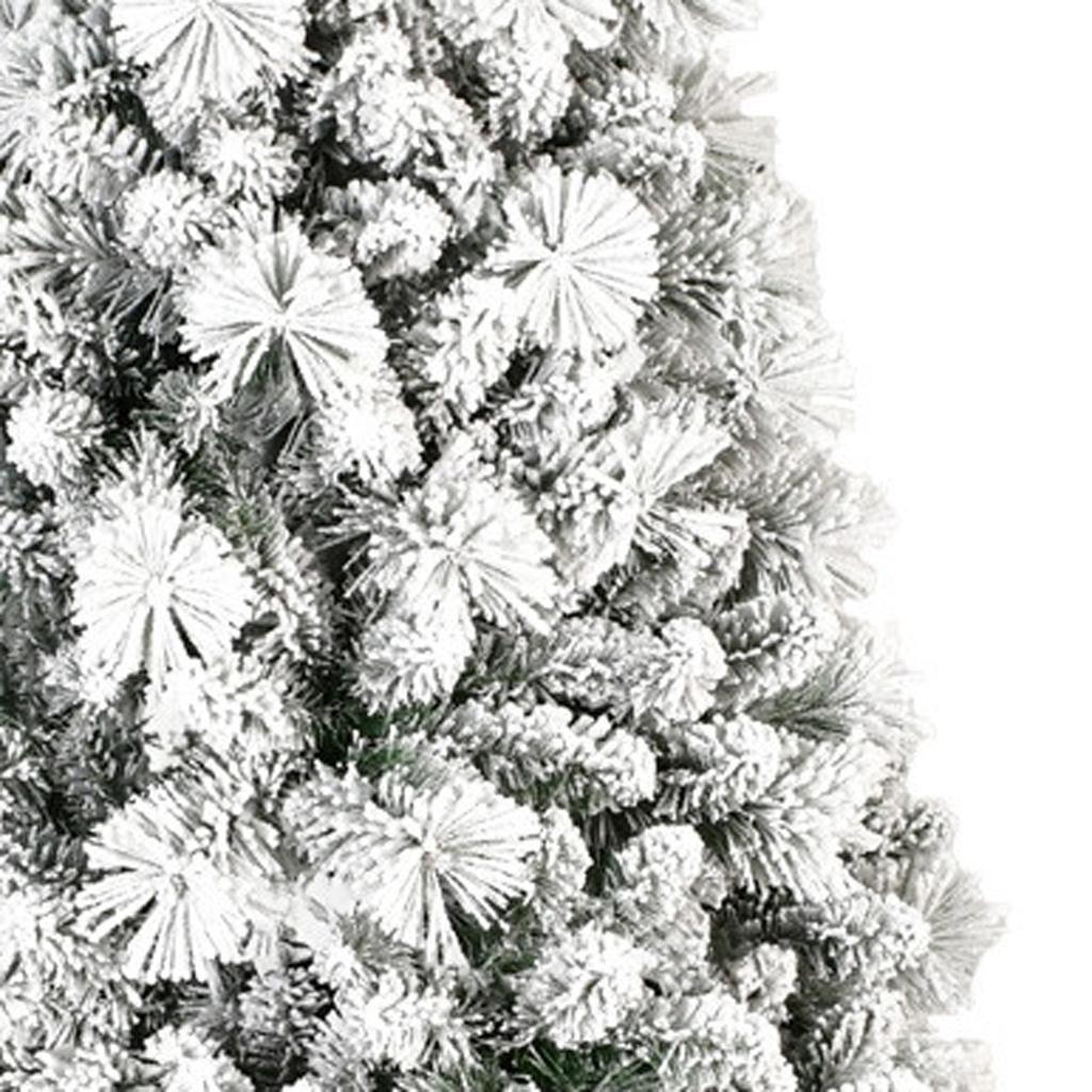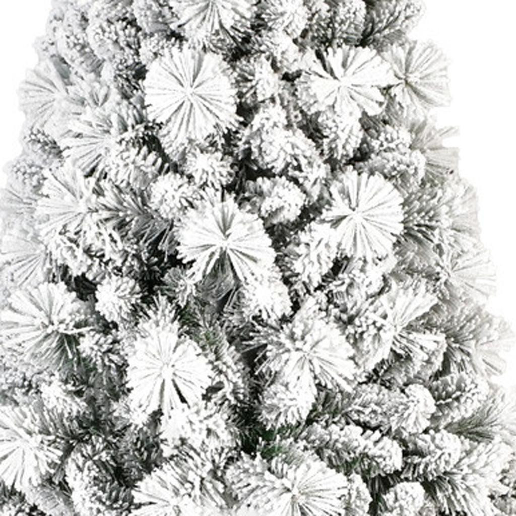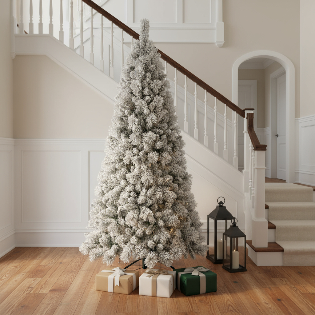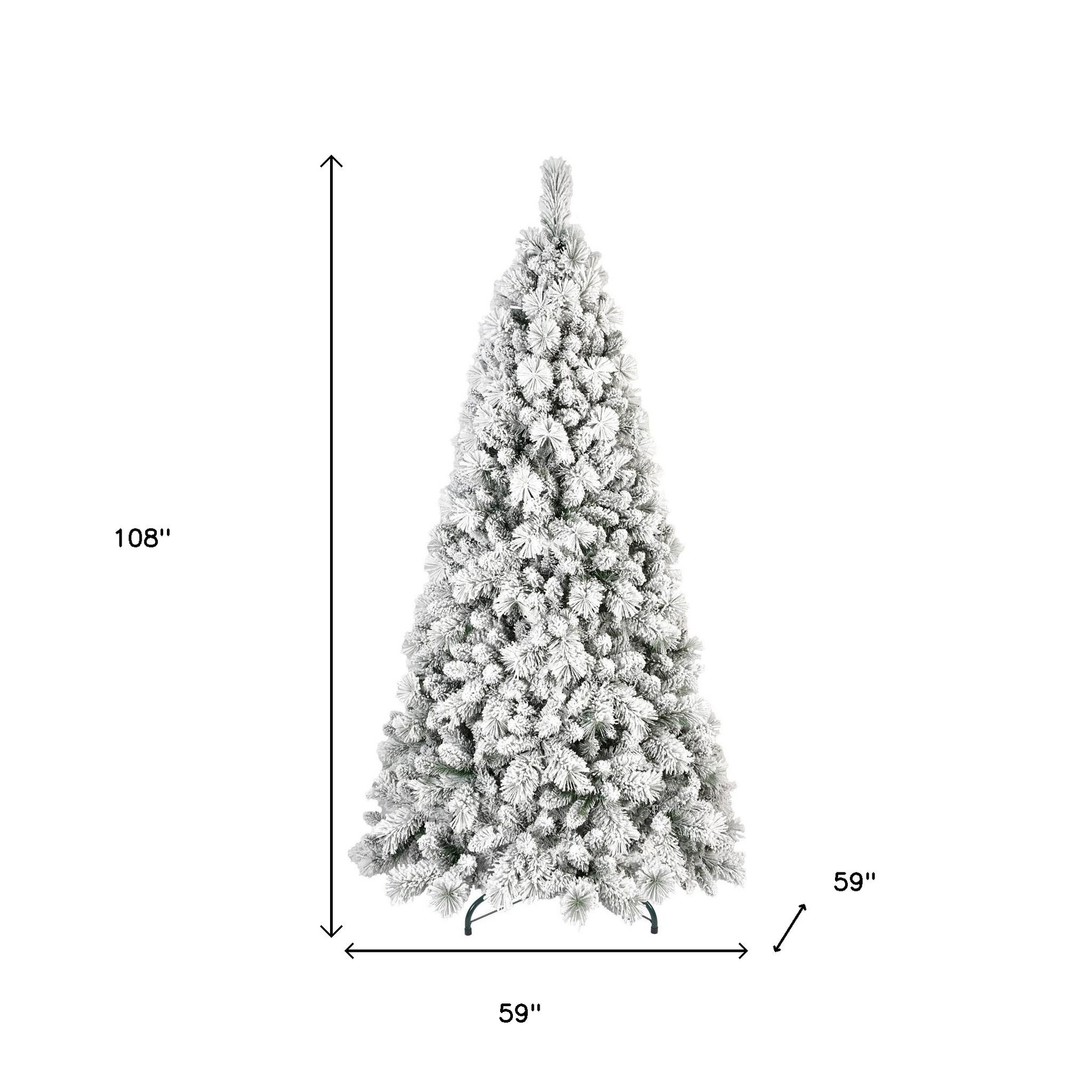 Add some festive spirit to your space with this designer style Christmas tree. This tall and slender 9-foot artificial pine features a stunning flocked design that mimics the beauty of freshly fallen snow. Easy to set up and easy to store, this tree promises longevity year after year. The thick branches and slender shape provides a modern silhouette that is easy to decorate and adds some sophisticated style to your space. This easy to put together tree uses wire memory to auto fluff and help your tree to look full and as realistic as possible. Add some festive cheer and unique style to your space with this modern white Christmas tree. 108.00-inch h x 59.00-inch w x 59.00-inch d.