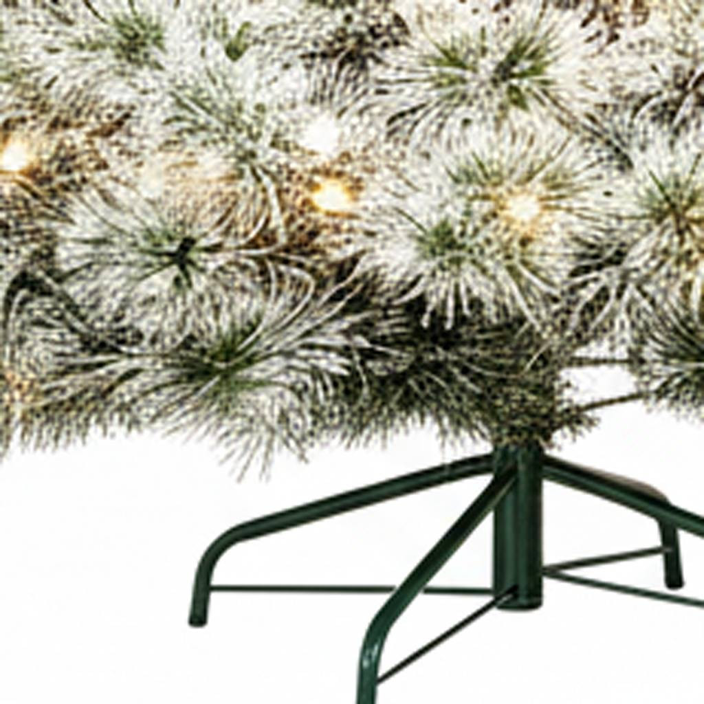 Celebrate the season in style with this 9-foot white pre lit full flocked spruce Christmas tree. This stunning pre-lit artificial tree boasts beautiful realistic needles that are coated with white faux snow flocking, creating a pristine and elegant winter wonderland appearance. Its regular fullness shape offers a classic profile, making it a perfect centerpiece for holiday gatherings. Equipped with built-in lights, it illuminates your home with a warm glow, enhancing the overall ambiance. A total of 347 branch tips and 120 warm LED lights are included to bring a dose of cozy Christmas cheer to your space. The included tree stand ensures stability, making it easy to set up and enjoy the magic of the season. 108.00-inch h x 58.00-inch w x 58.00-inch d.