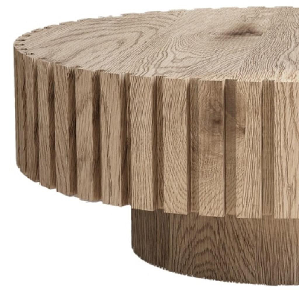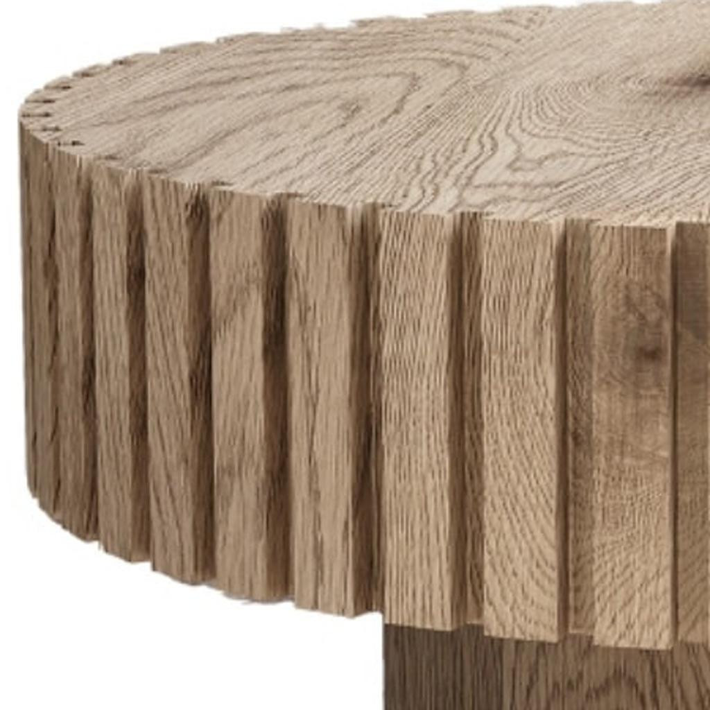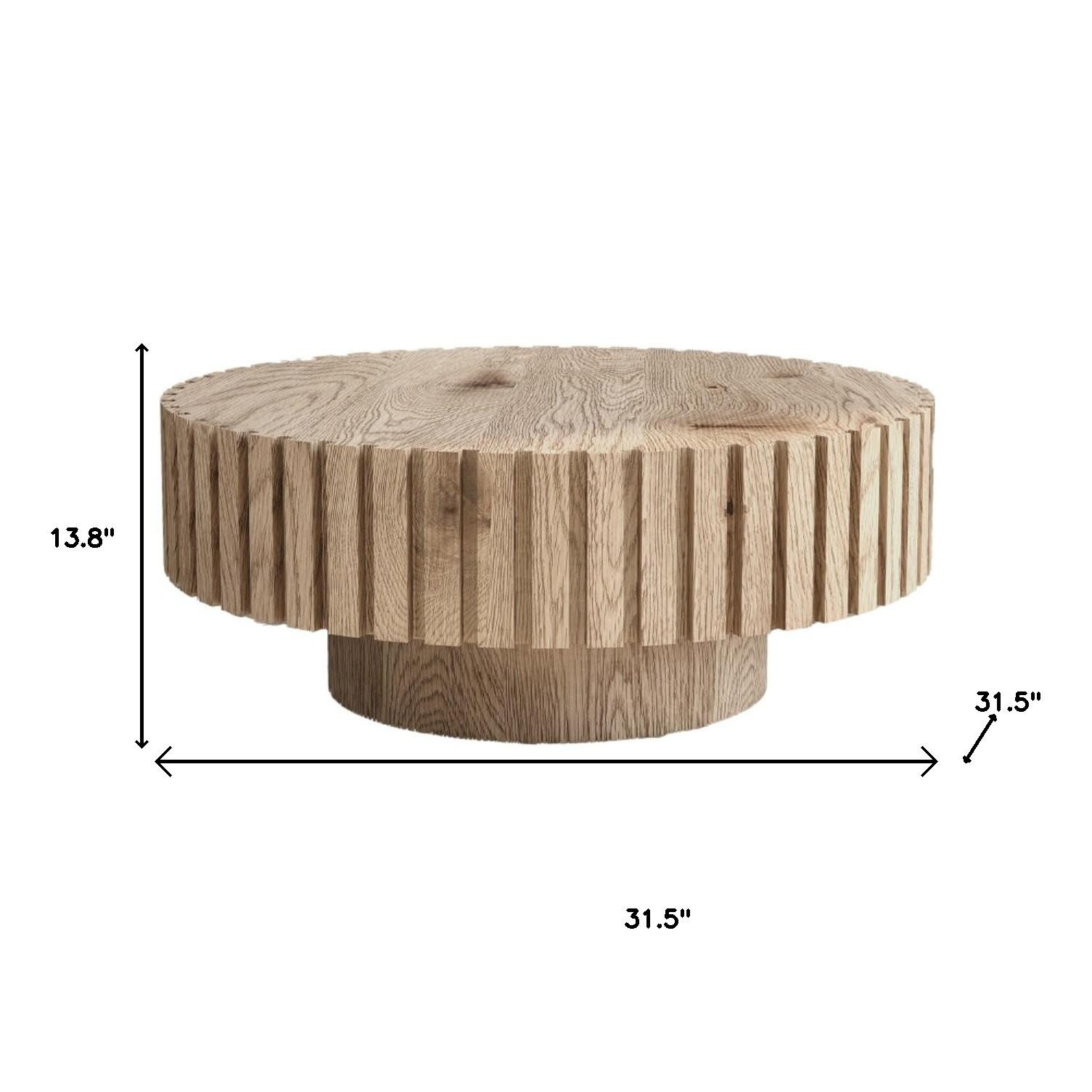 This stylish 32-inch natural colored wood round pedestal coffee table is sure to inspire compliments no matter where it sits. Create an inspiring atmosphere in most any room with this natural manufactured wood table. Featuring lots of wood grains and ribbed texture on the sides, this table adds a clean modern minimalist vibe to your space. Ready to fit into a living area, bedroom, lounge, or office, this low round coffee table is for you. 13.80-inch h x 31.50-inch w x 31.50-inch d.