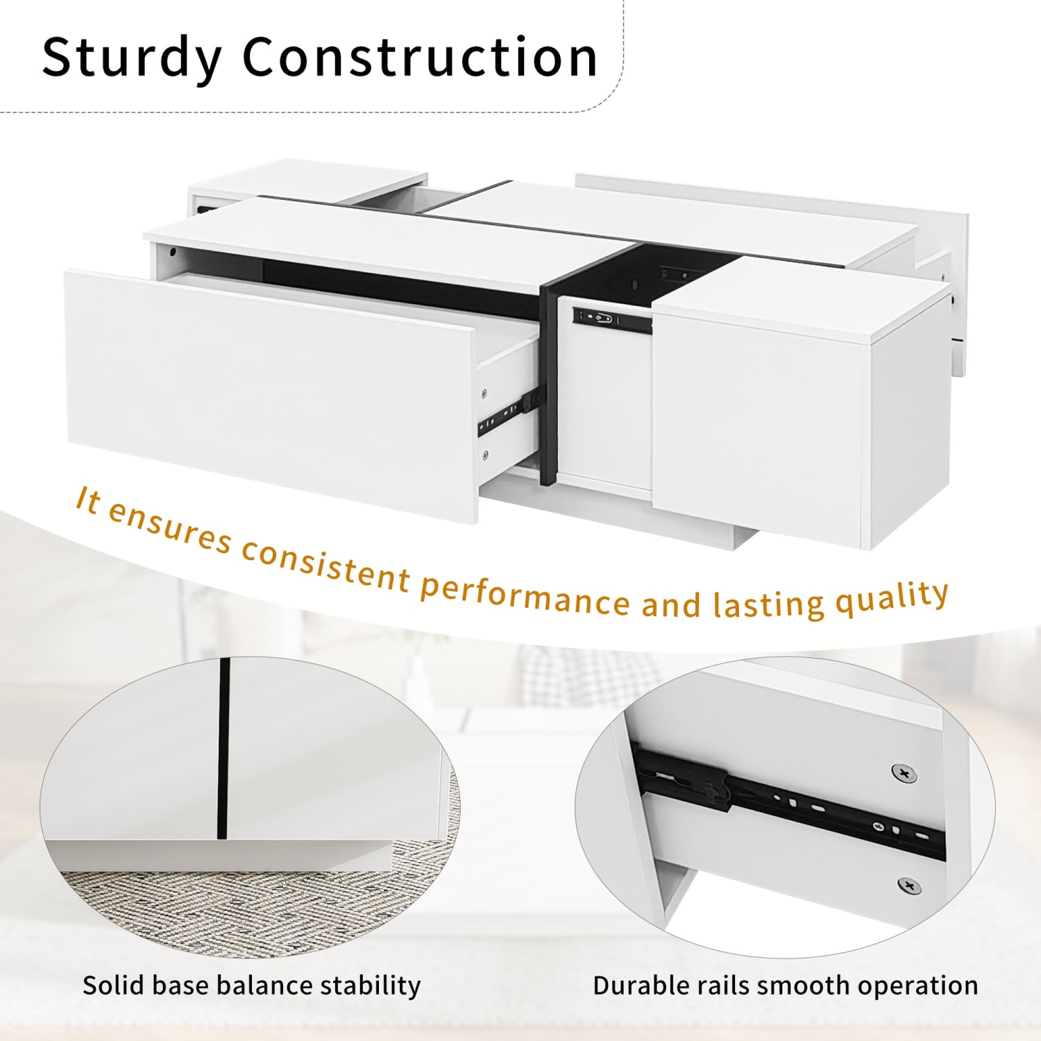 Add handsome, fashionable design to your living space with this 47-inch white wood coffee table. Made of manufactured wood, the glossy white coloration throughout gives this piece an updated and refreshing look. With an extendable design and two pull out drawers that open to reveal hidden storage, this table is not only good looking but practical, making it a great place to store pillows, blankets, books, games, and more. This modern chic rectangular table will be a great accent in any room if you're looking for something that can fit into a living area, bedroom, or office, this coffee table is for you. 15.60-inch h x 47.20-inch w x 23.60-inch d.