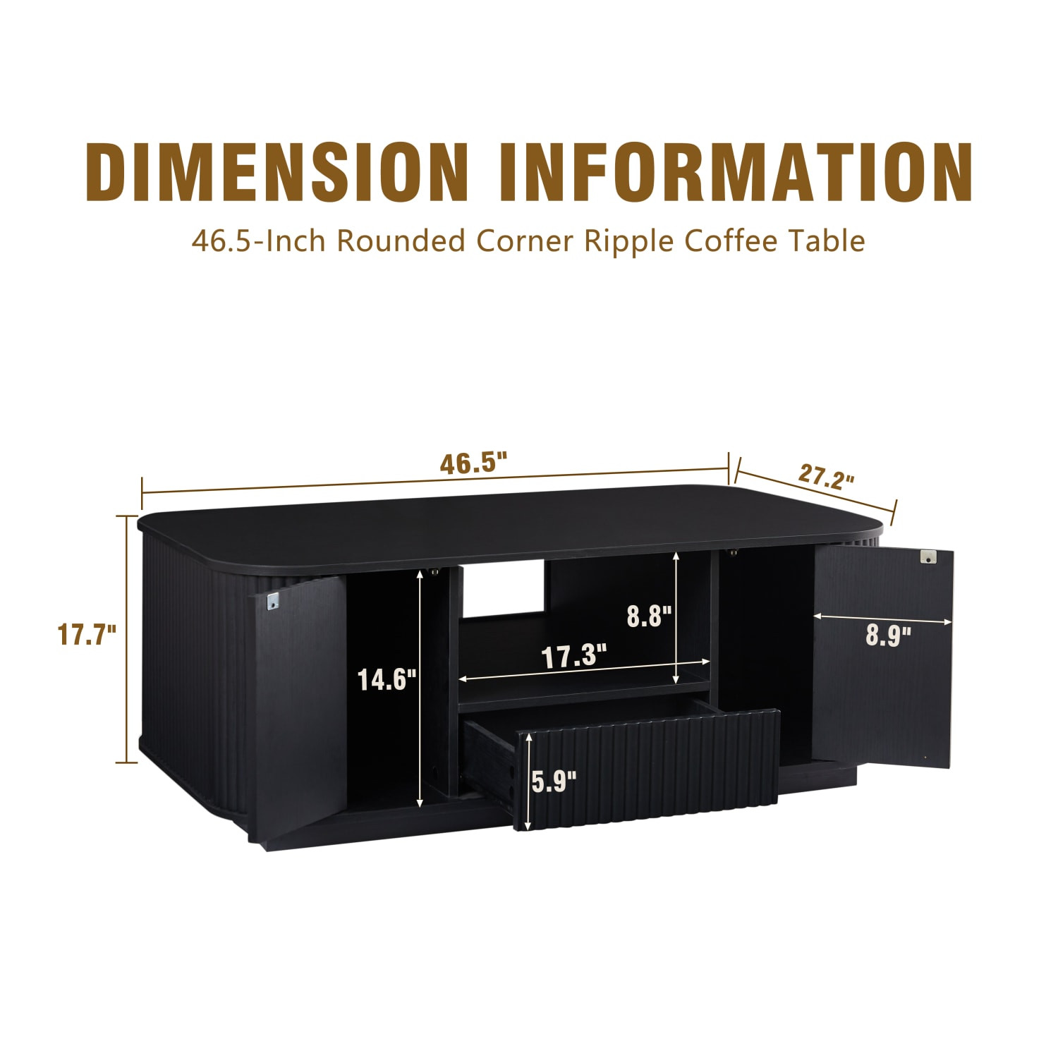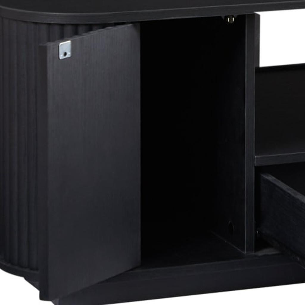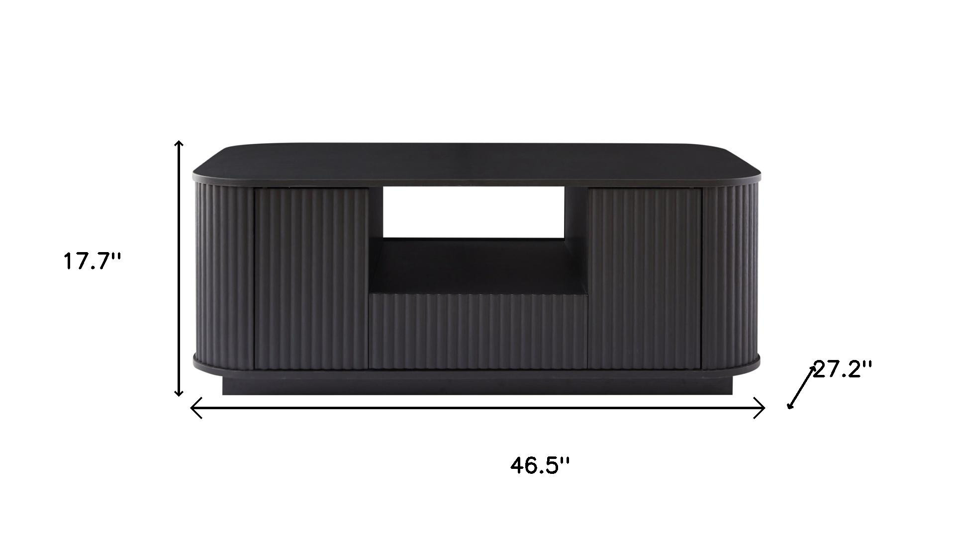 Make your living room or family room really stand out with this 47-inch black wood oval block coffee table with storage. This table is made from manufactured wood in a black color throughout the base and top and features ribbed textured detailing. Featuring two discreet cabinet doors that open, a pull out drawer, and open cubby space, this furniture piece gives you lots of functional storage in a compact footprint. This curved edge oval table is an updated take on a classic and features an attractive design that will definitely breathe some fresh air into your interior. 17.70-inch h x 46.50-inch w x 27.20-inch d.