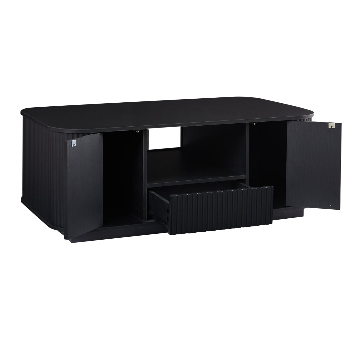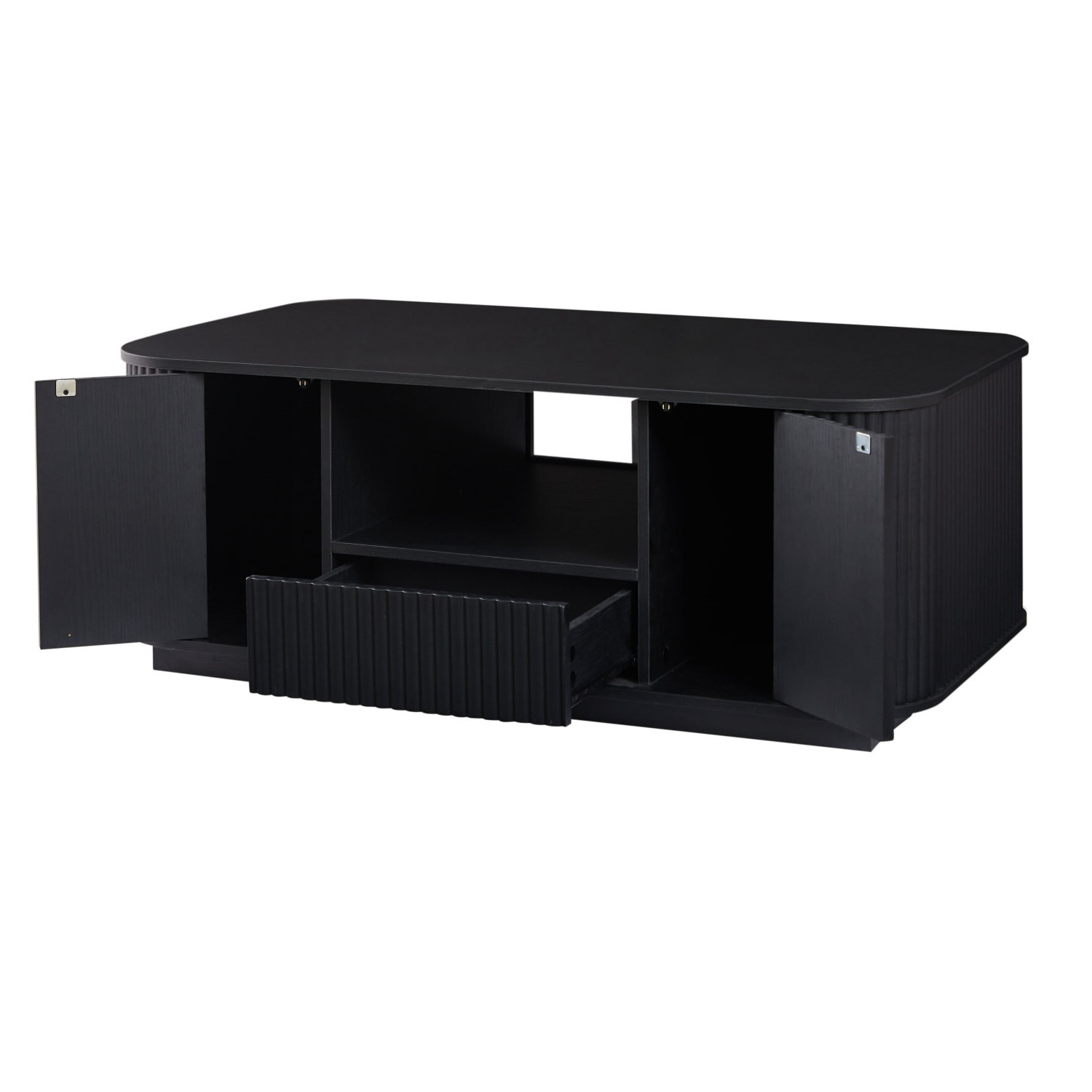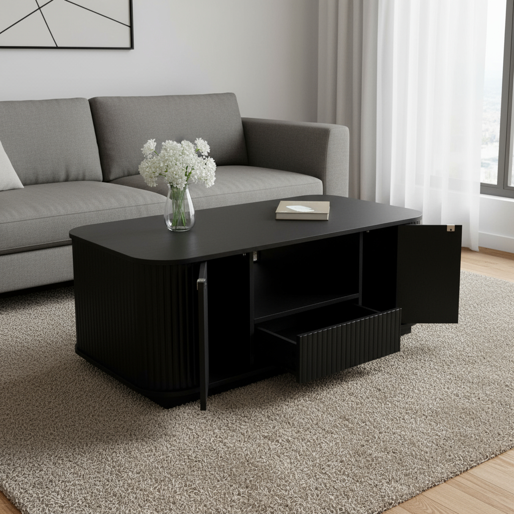Make your living room or family room really stand out with this 47-inch black wood oval block coffee table with storage. This table is made from manufactured wood in a black color throughout the base and top and features ribbed textured detailing. Featuring two discreet cabinet doors that open, a pull out drawer, and open cubby space, this furniture piece gives you lots of functional storage in a compact footprint. This curved edge oval table is an updated take on a classic and features an attractive design that will definitely breathe some fresh air into your interior. 17.70-inch h x 46.50-inch w x 27.20-inch d.