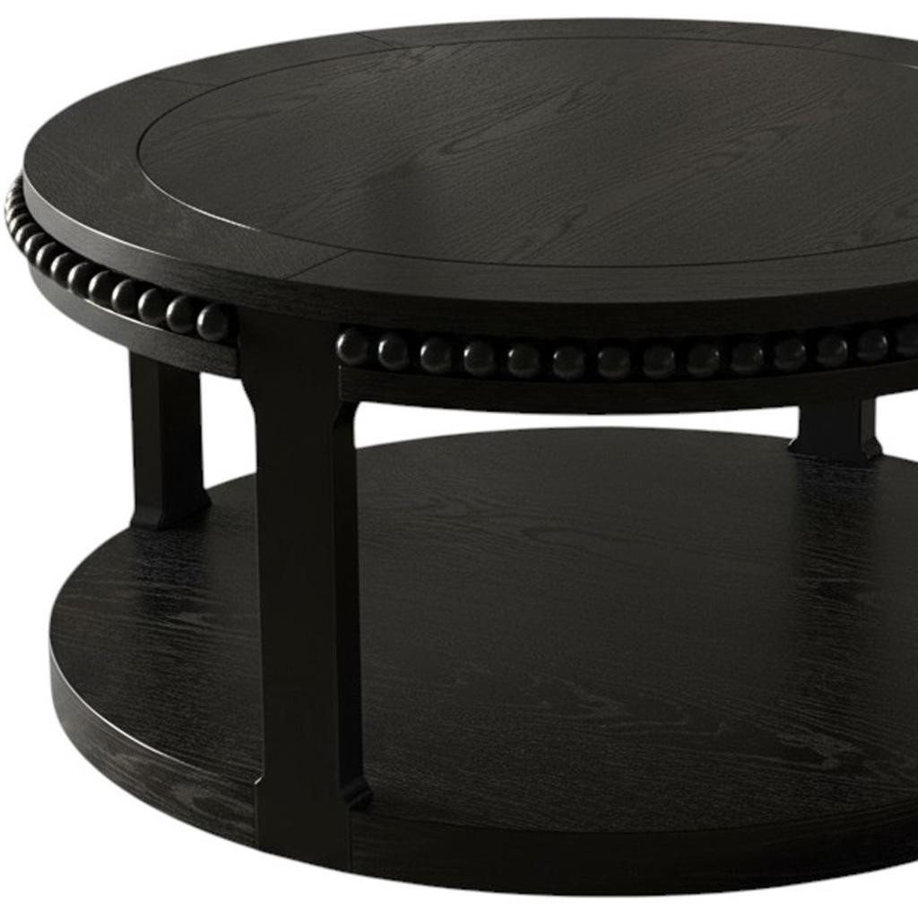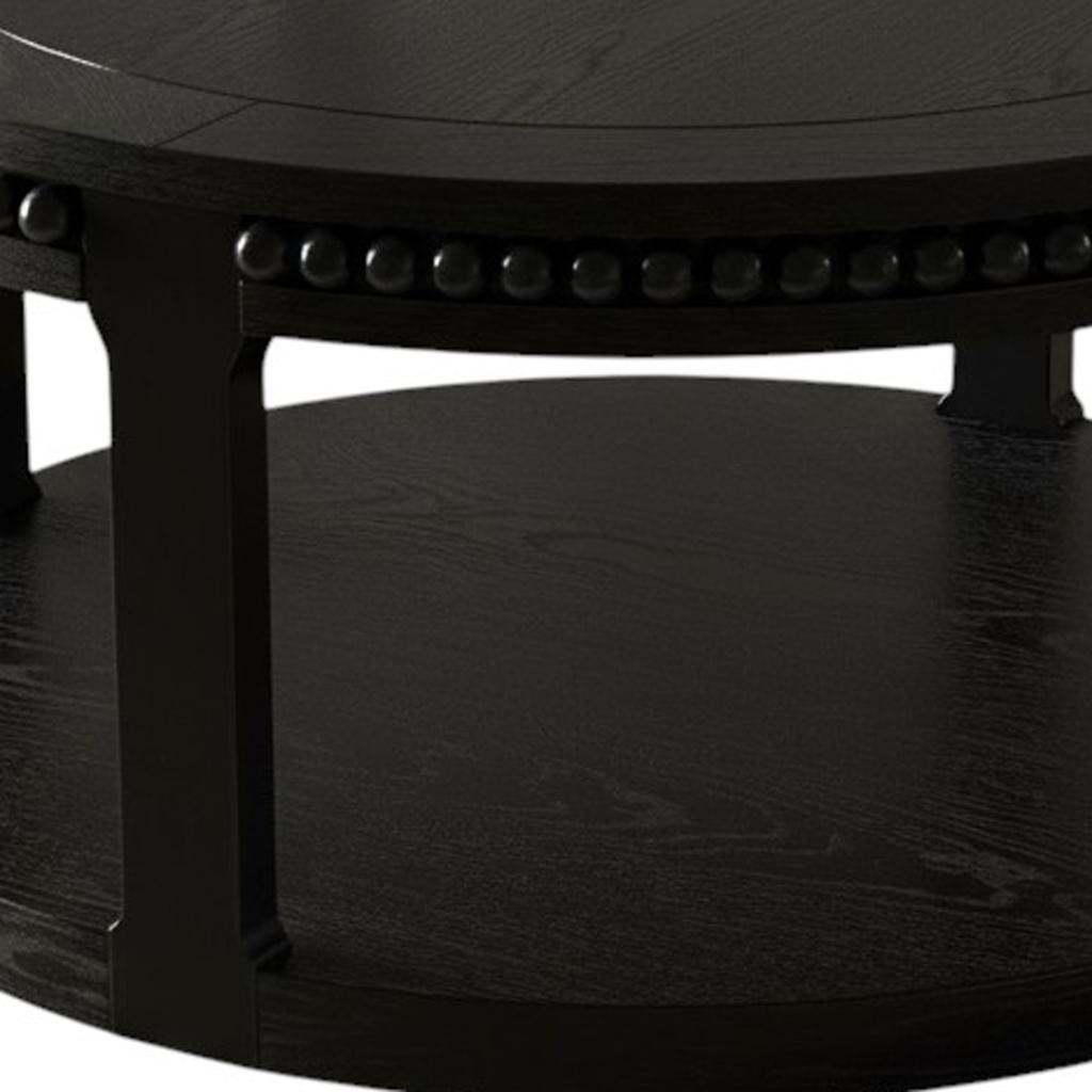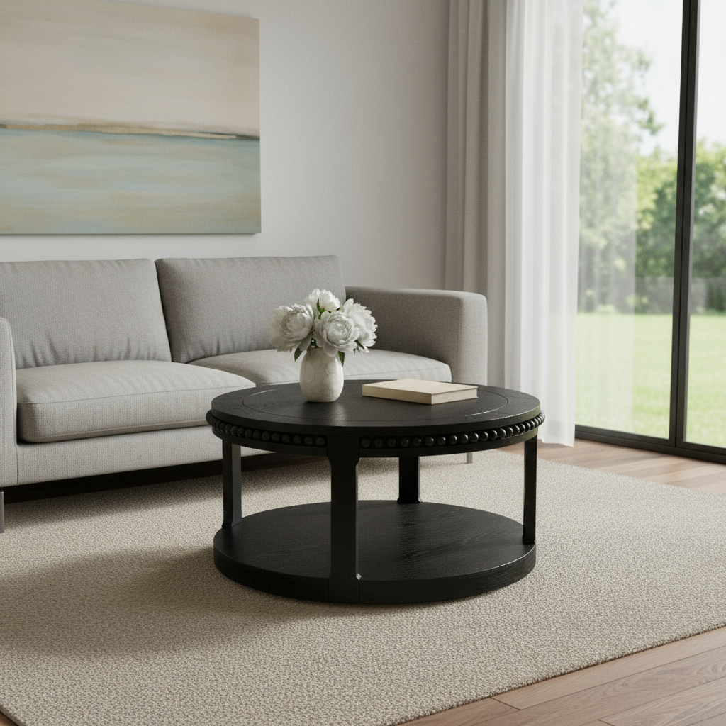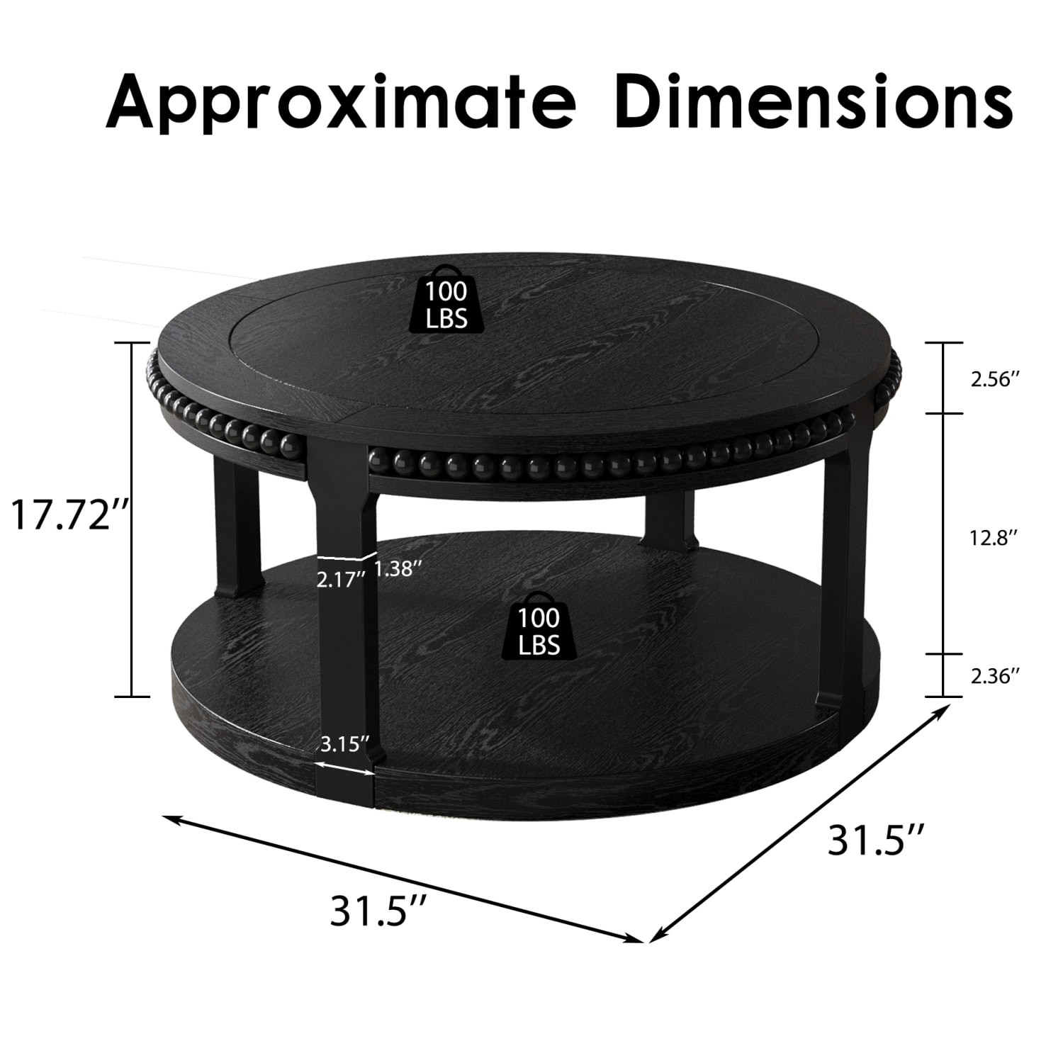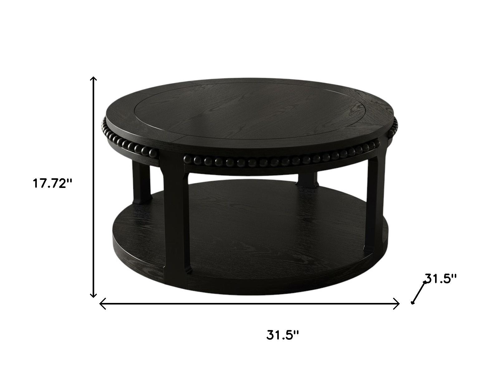 This stylish 32-inch black wood floor shelf beaded round coffee table is sure to inspire compliments no matter where it sits. This stylish two-tier table features quality construction from manufactured wood and veneers in an updated monotone color scheme with black as the main color on both the top and the base. Help to keep your space organized with the included single shelf. Featuring a premium finish that showcases the wood grains yet keeps your surface scratch free, this easy to assemble table is both stylish, functional, and practical for everyday life. 17.72-inch h x 31.50-inch w x 31.50-inch d.