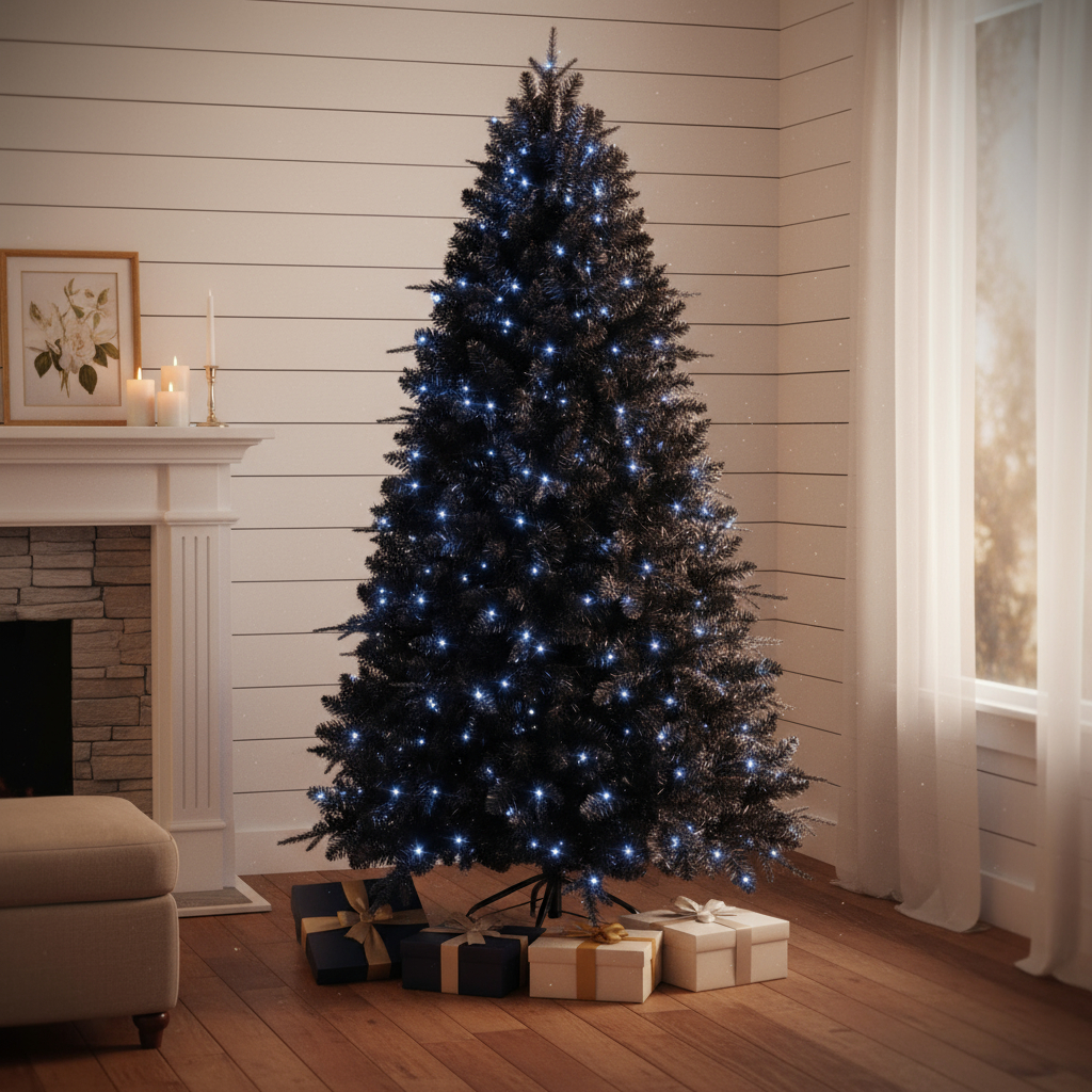 Add that special feeling to your space with this christmas tree. Crafted from durable polyvinyl chloride, this artificial fir tree stands an impressive 90 inches tall, ensuring it becomes the centerpiece of your holiday decor. With a gorgeous black needle color, it offers a modern twist on traditional festive aesthetics. This tree features 500 led lights that provide a constant color glow, perfect for creating a warm and inviting atmosphere. The electric plug-in power source ensures you can easily light it up, while the included tree stand adds stability. Designed for ease of use, this tree is ready to bring joy to your celebrations season after season. 90.00-inch h x 57.00-inch w x 57.00-inch d.