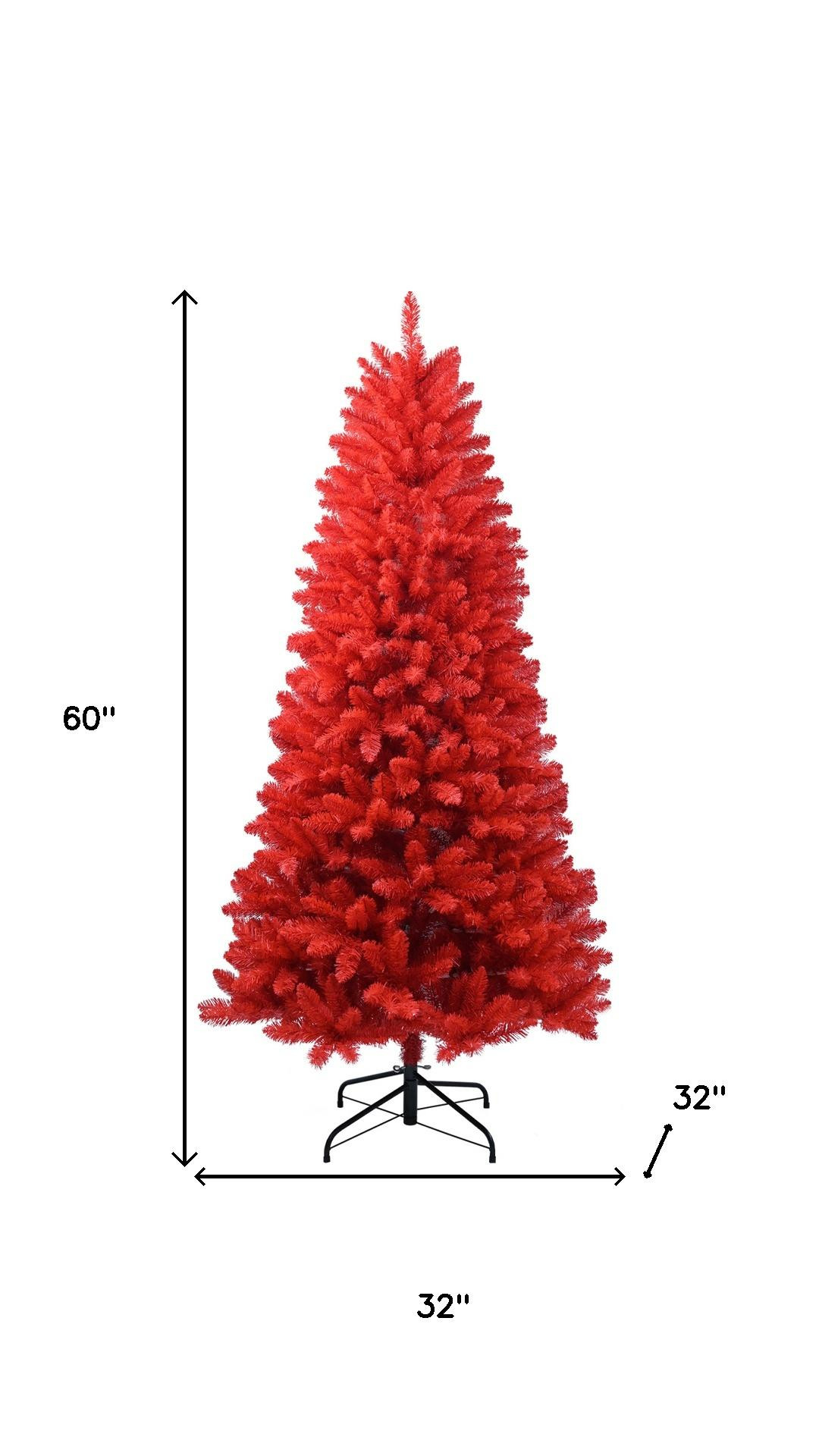Add some festive spirit to your space with this unique 5-foot red full Christmas tree. This small artificial tree boasts a stunning red needle color, creating a bold statement in your holiday decor. With its regular fullness shape, it provides 624 branch tips for hanging ornaments and lights. Designed for stability, it comes with a sturdy metal tree stand that ensures it stays upright throughout the season. Standing at 60 inches tall, it fits perfectly in various spaces, from tabletop to festive entryways, making it an ideal centerpiece for your holiday celebrations. 60.00-inch h x 32.00-inch w x 32.00-inch d.