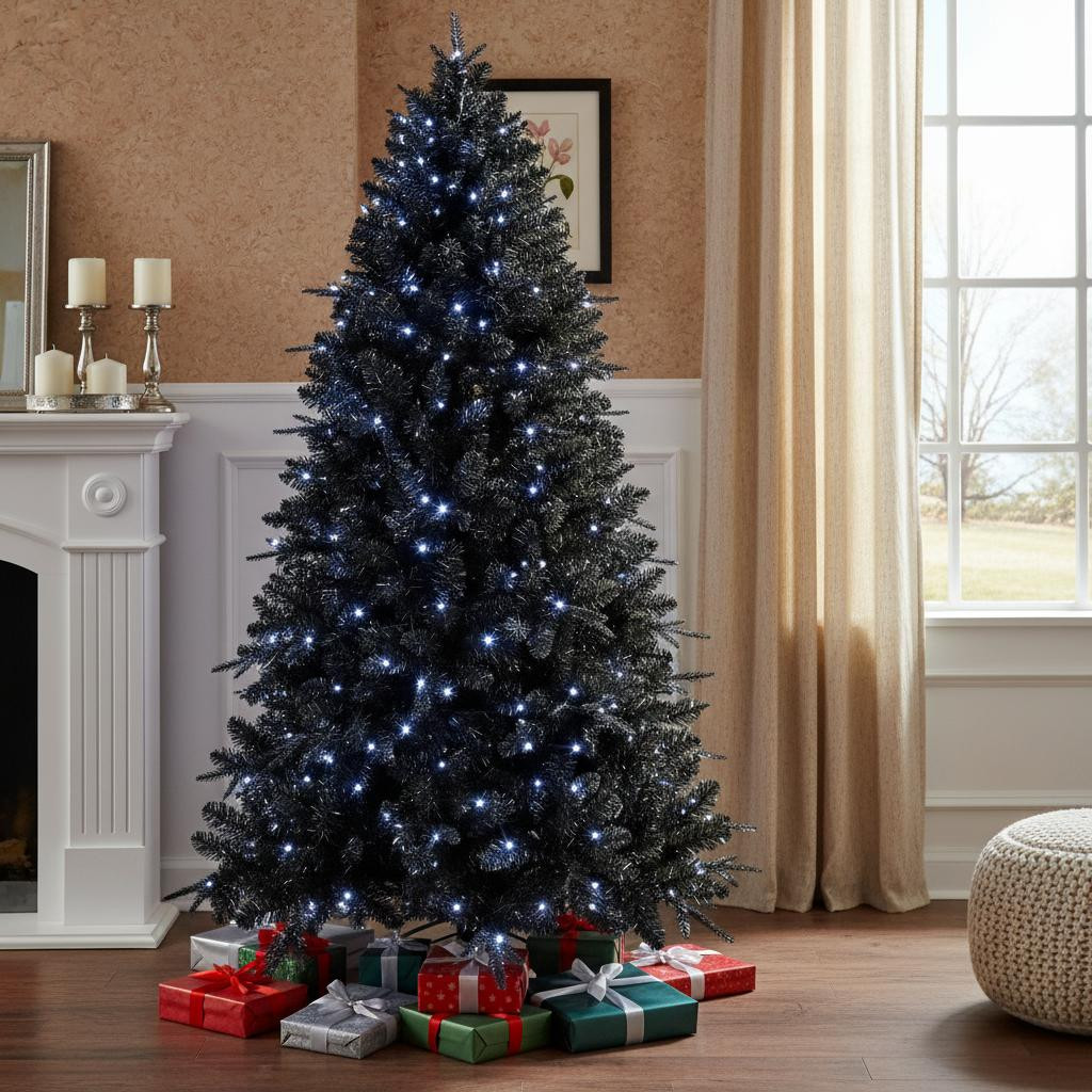Decorate and celebrate in style with this festive 7.5-foot black pre lit full spruce christmas tree. This artificial masterpiece features a striking black needle color that adds a modern twist to your holiday decor. With a regular fullness shape, it creates a lush, vibrant look that impresses from every angle. Included are 500 warm led lights that embrace a constant color setting, illuminating your home with a cozy glow. The sturdy tree stand ensures stability throughout the season, while the high-quality plastic material guarantees lasting beauty year after year. With 2156 tips, this tree provides ample space for hanging ornaments and cherished memories. 90.00-inch h x 57.00-inch w x 57.00-inch d.