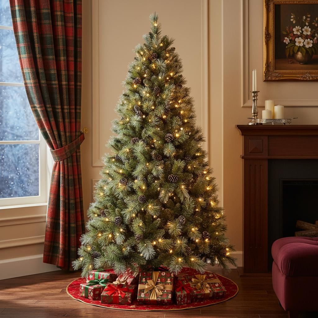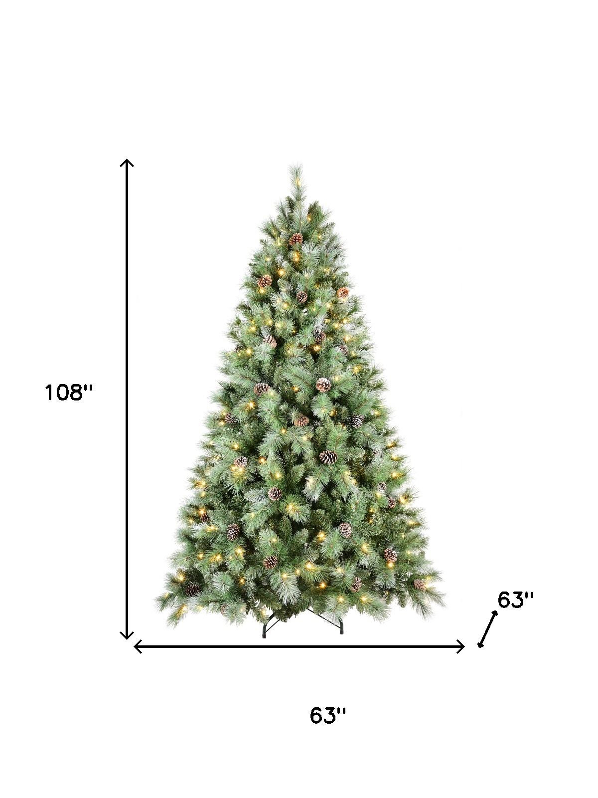 Add some festive spirit to your space with this 9-foot pre lit full pine Christmas tree with decorations. This stunning artificial tree showcases 2518 branch tips with pinecones and a beautiful green needle color, providing a lifelike appearance, while its regular fullness shape ensures it stands proudly in any room. Featuring instant power lights for easy assembly, it comes equipped with 550 LED bulbs that emit a warm white light, creating a welcoming glow throughout the holiday season. The tree includes a sturdy stand for added stability and boasts stay-lit bulbs, ensuring your decorations shine brightly. Made from durable materials, this tree promises to be a cherished centerpiece for years to come. 108.00-inch h x 63.00-inch w x 63.00-inch d.
