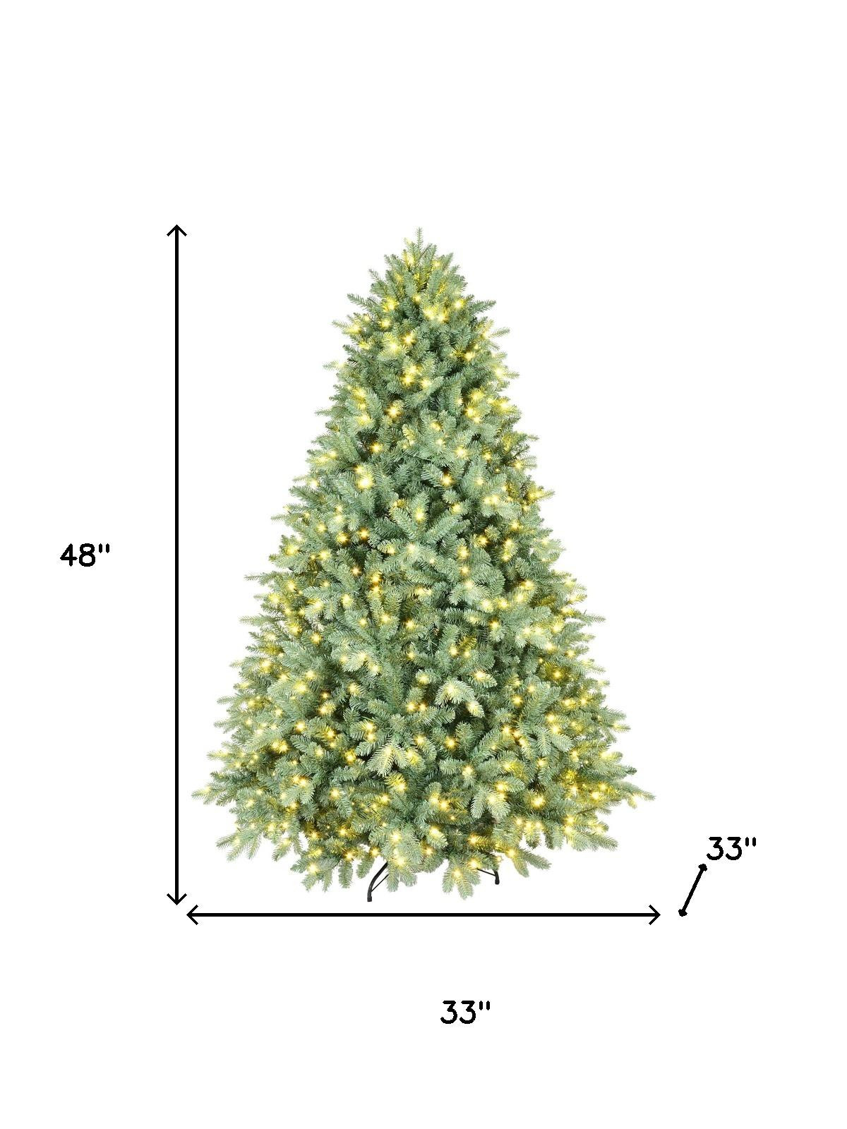 This 4-foot pre lit full spruce christmas tree is a great way to decorate and celebrate the season. Crafted from high-quality plastic, this artificial tree features a lush green color that brings the essence of nature indoors. Its regular fullness provides a perfect canvas for your holiday ornaments and decorations. With 592 tips, it offers a full and vibrant appearance that enhances your festive atmosphere. The included led lights create a warm and inviting glow, powered by a convenient electric plug-in source. Complete with a sturdy tree stand, this attractive tree promises to be a centerpiece for your holiday celebrations. 48.00-inch h x 33.00-inch w x 33.00-inch d.
