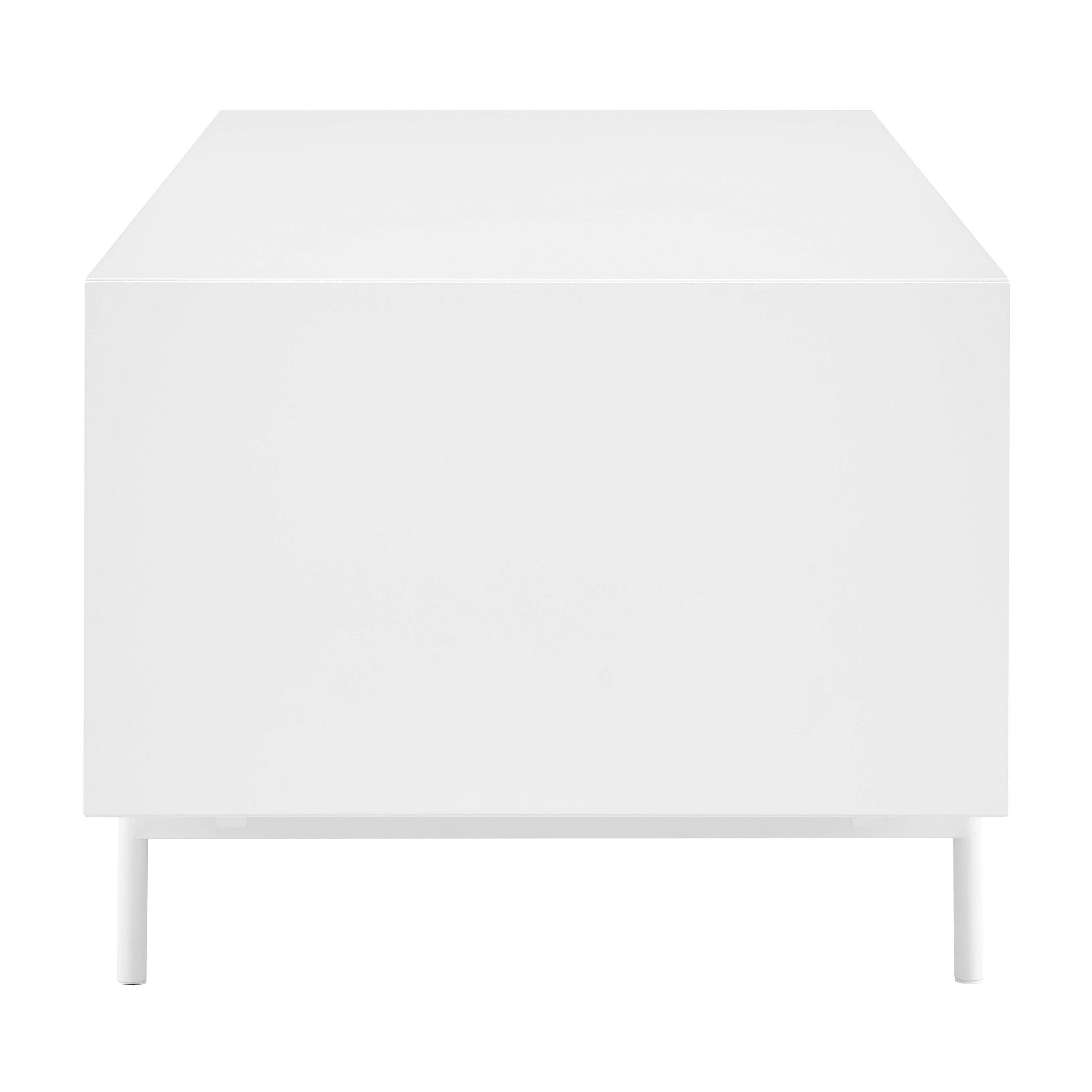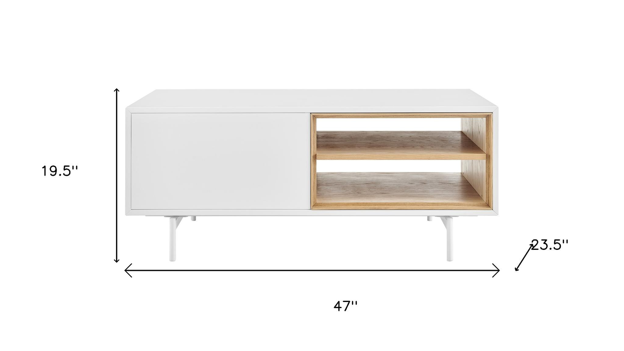Make a statement with the 47-inch white wood and steel coffee table with two shelves and infuse a dash of character and personality into your space. A sleek white monotone color gives this steel and manufactured wood table a fresh and updated look. There are 2 shelves that will help to keep clutter at bay. This classic rectangular table will be a great accent in any room it has an attractive design that will definitely breathe some fresh air into your interior. 19.50-inch h x 47.00-inch w x 23.50-inch d.