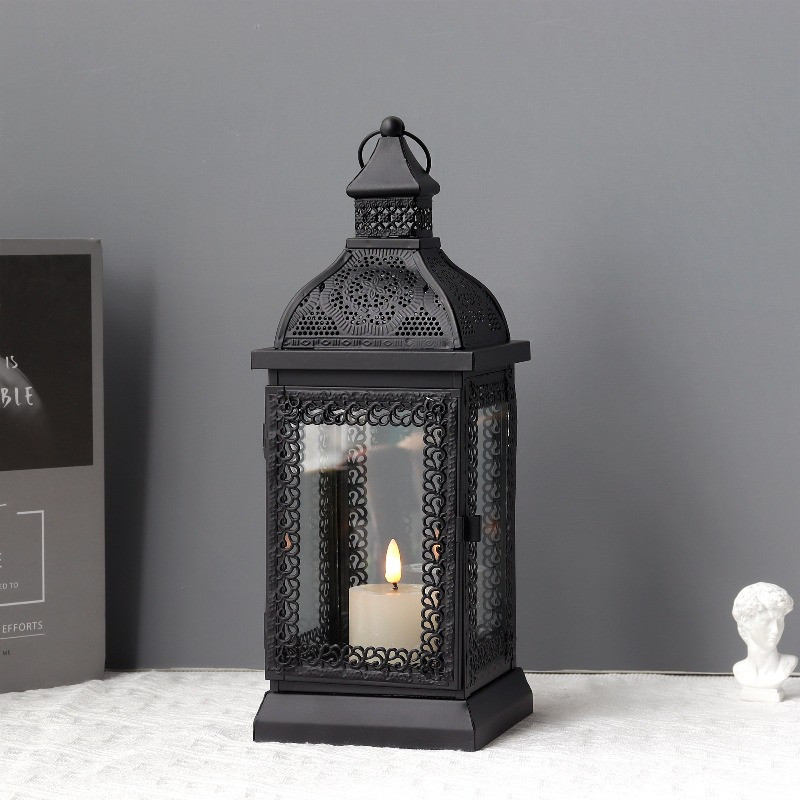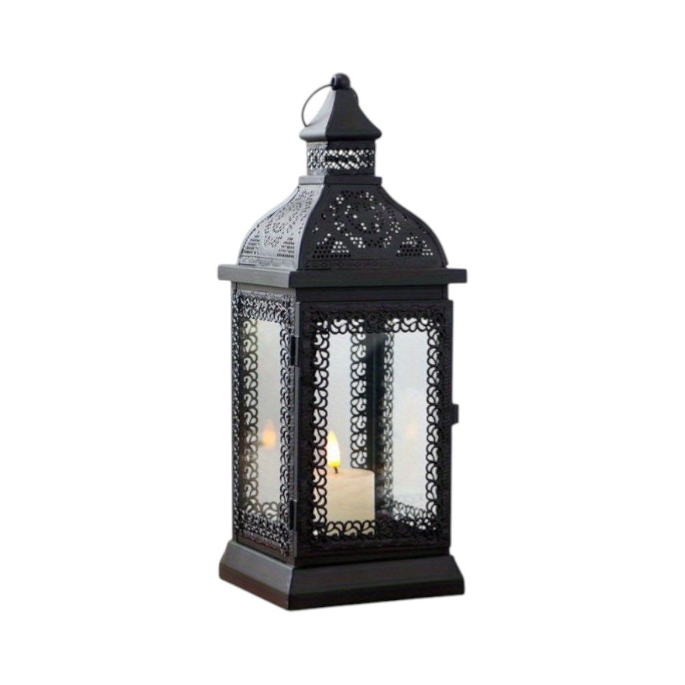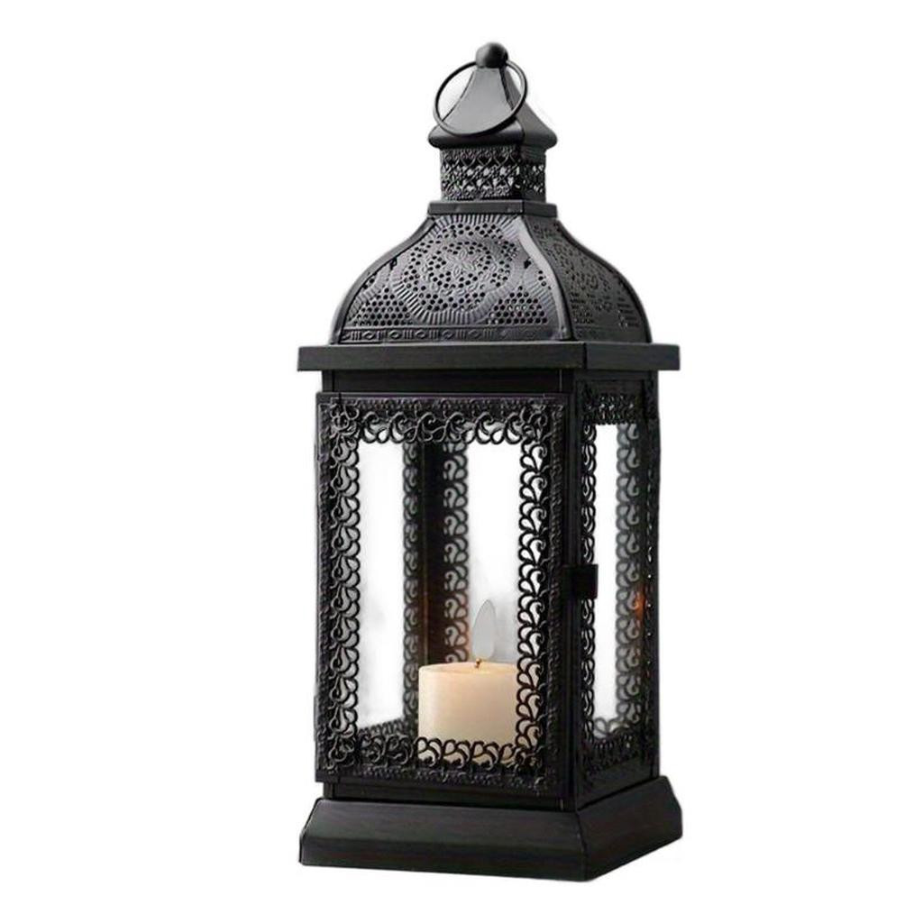 Dress up your home to impress every season with this fabulous pierced metal hanging lantern style pillar holder. You can showcase this 13-inch clear and black glass and metal tabletop lantern candle holder on its own as a centerpiece or position it among flower arrangements on your table. A perfect functional and decorative accent piece for weddings, dining tables, patios, and living rooms alike. Candleholders are an attractive way to turn a simple candle into a piece of décor. 13.00-inch h x 5.00-inch w x 5.00-inch d.