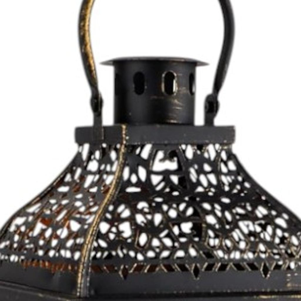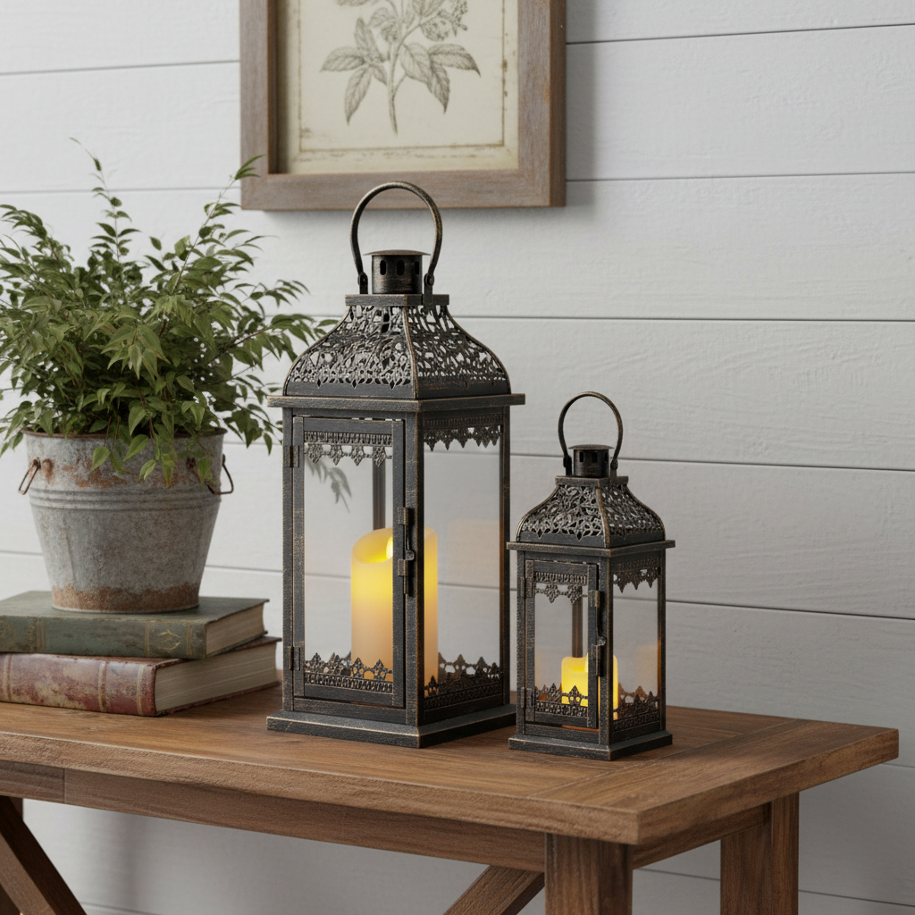 Stylize your tabletop, light up your back patio or add the perfect touch of low light to your living room with this set of two clear and black glass and metal tabletop lantern candle holders. With solid glass side panels and vintage style piercing, these beautiful lanterns are hand finished by skilled craftsmen and designed to add a glamorous glow to any event or table setting. As a set of 2, these lanterns make both the perfect gift and functional, decorative accent for use indoors or out. Candleholders are an attractive way to turn a simple candle into a piece of décor. 19.50-inch h x 7.00-inch w x 7.00-inch d.