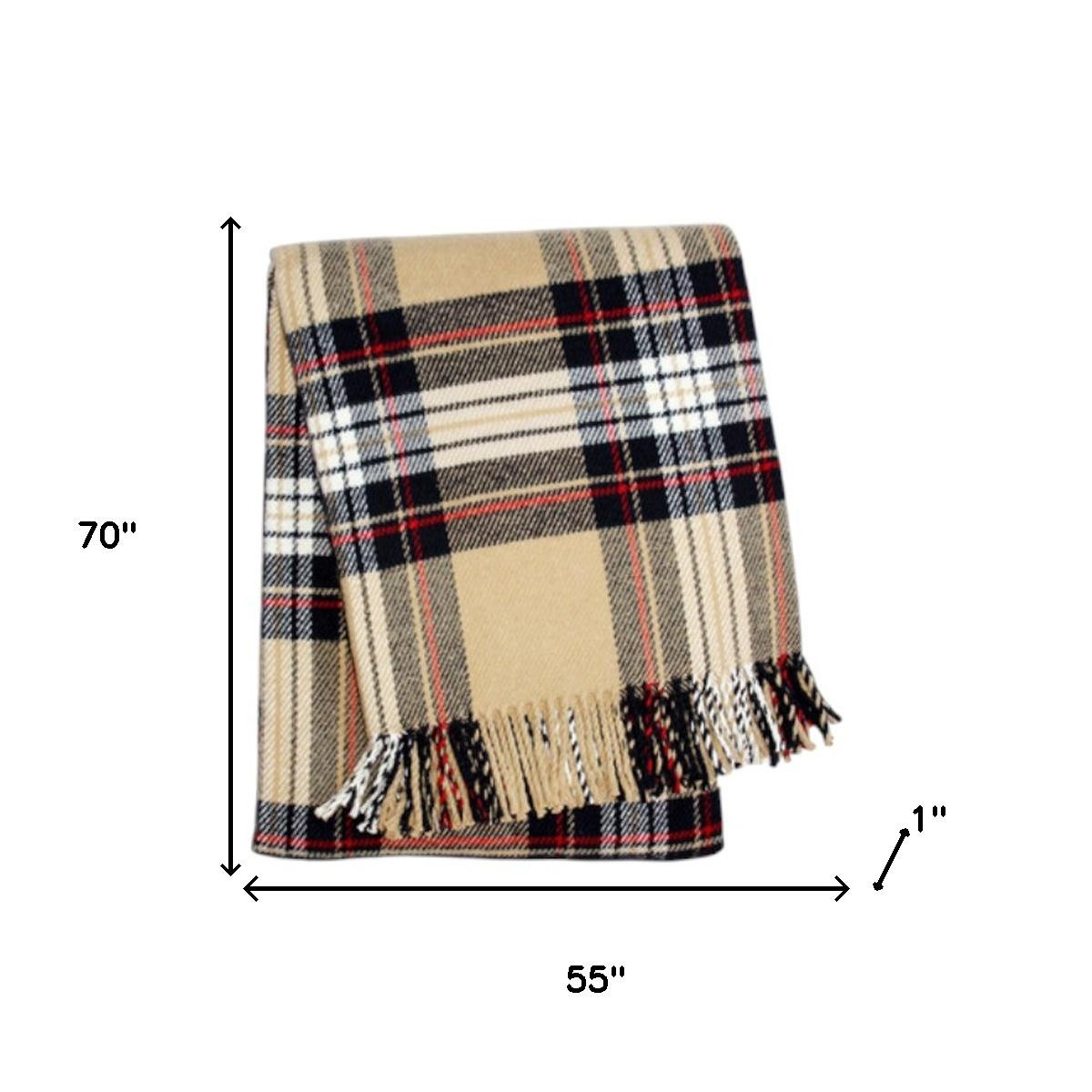 This welcoming 55-inch x 70-inch camel black red and white cotton blend plaid throw blanket with fringe is a must-have for every sofa, chaise, and bed. This ultra-soft plush blanket is designed for ultimate comfort. Features a woven tartan plaid design that offers sumptuous softness and texture that you'll cherish for years to come. Made from cotton acrylic blend, this blanket will make a great gift or addition to any room it's added to. Layering your furnishings with a decorative throw has the ability to awaken a tired living room or elevate the design of your bedroom simply by providing elements of color and texture that weren't there before. 70.00-inch h x 55.00-inch w x 0.30-inch d.