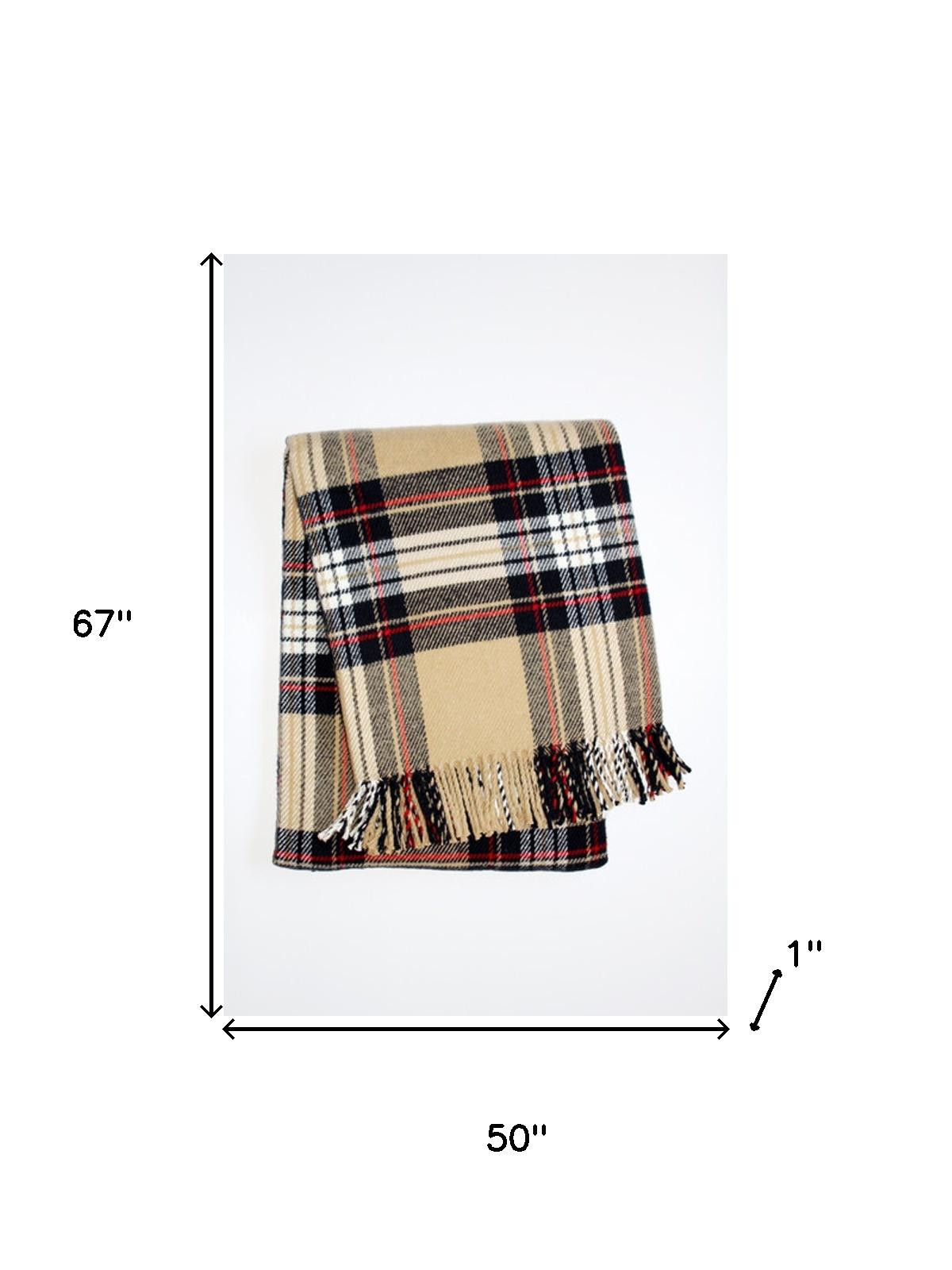 This 50-inch x 67-inch camel red black and white plaid cotton blend woven plush throw blanket with fringe is a stylish addition to any sofa. This ultra-soft plush blanket is designed for ultimate softness. Features a woven plaid design that offers sumptuous softness and texture that you'll cherish for years to come. Made from cotton blend this blanket will make a great addition to any room it's added to. Layering your furnishings with a decorative throw has the ability to awaken a tired living room or elevate the design of your bedroom simply by providing elements of color and texture that weren't there before. Perfect for your favorite chair, bed or lounging on the couch, this blanket helps bring a warm and fashionable flair to your space. 67.00-inch h x 50.00-inch w x 1.00-inch d.